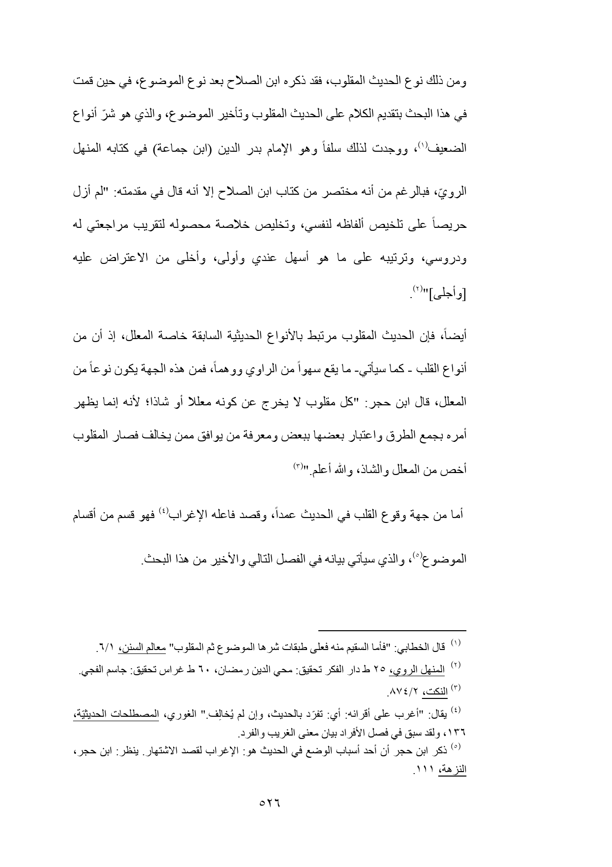 ومن ذلك نوع الحديث المقلوب، فقد ذكره ابن الصلاح بعد نوع الموضوع، في حين قمت في هذا البحث بتقديم الكلام على الحديث المقلوب وتأخير الموضوع، والذي هو شرّ أنواع الضعيف (¬1)، ووجدت لذلك سلفاً وهو الإمام بدر الدين (ابن جماعة) في كتابه المنهل الرويّ، فبالرغم من أنه مختصر من كتاب ابن الصلاح إلا أنه قال في مقدمته: "لم أزل حريصاً على تلخيص ألفاظه لنفسي، وتخليص خلاصة محصوله لتقريب مراجعتي له ودروسي، وترتيبه على ما هو أسهل عندي وأولى، وأخلى من الاعتراض عليه (وأجلى (" (¬2).