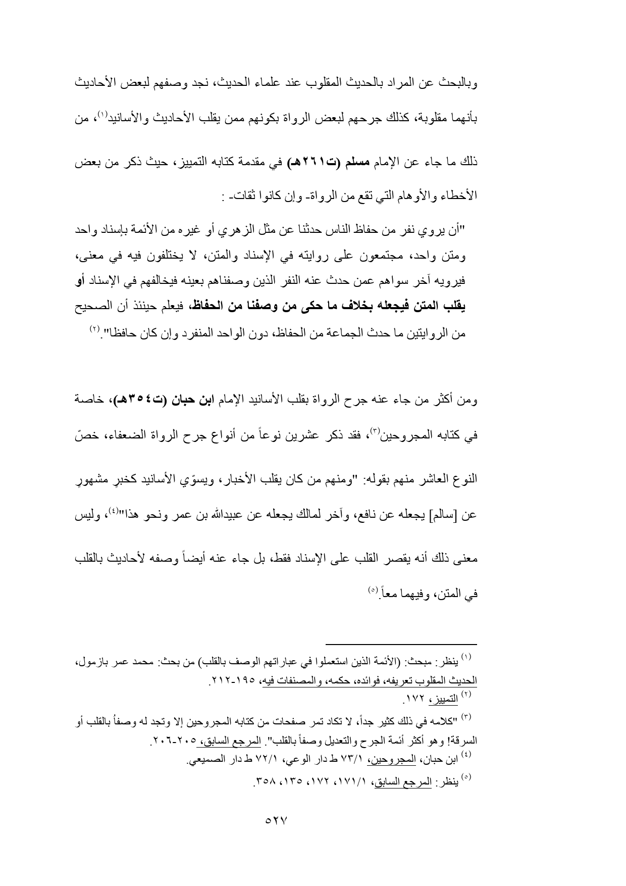 (¬1) ينظر: مبحث: (الأئمة الذين استعملوا في عباراتهم الوصف بالقلب) من بحث: محمد عمر بازمول، الحديث المقلوب تعريفه، فوائده، حكمه، والمصنفات فيه، 195 - 212.