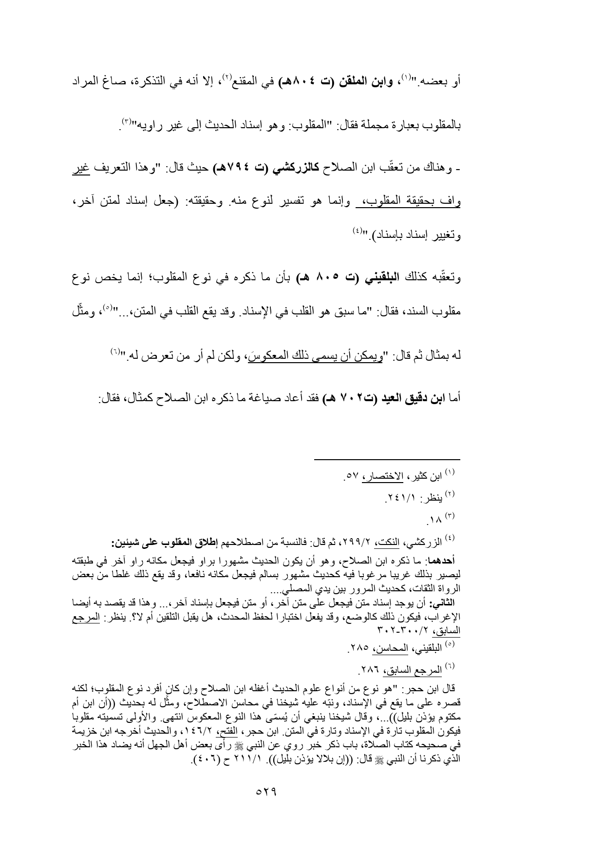 وتعقّبه كذلك البلقيني (ت 805 هـ) بأن ما ذكره في نوع المقلوب؛ إنما يخص نوع مقلوب السند، فقال: "ما سبق هو القلب في الإِسناد. وقد يقع القلب في المتن، ... " (¬5)، ومثّل له بمثال ثم قال: "ويمكن أن يسمى ذلك المعكوسَ، ولكن لم أر من تعرض له." (¬6)