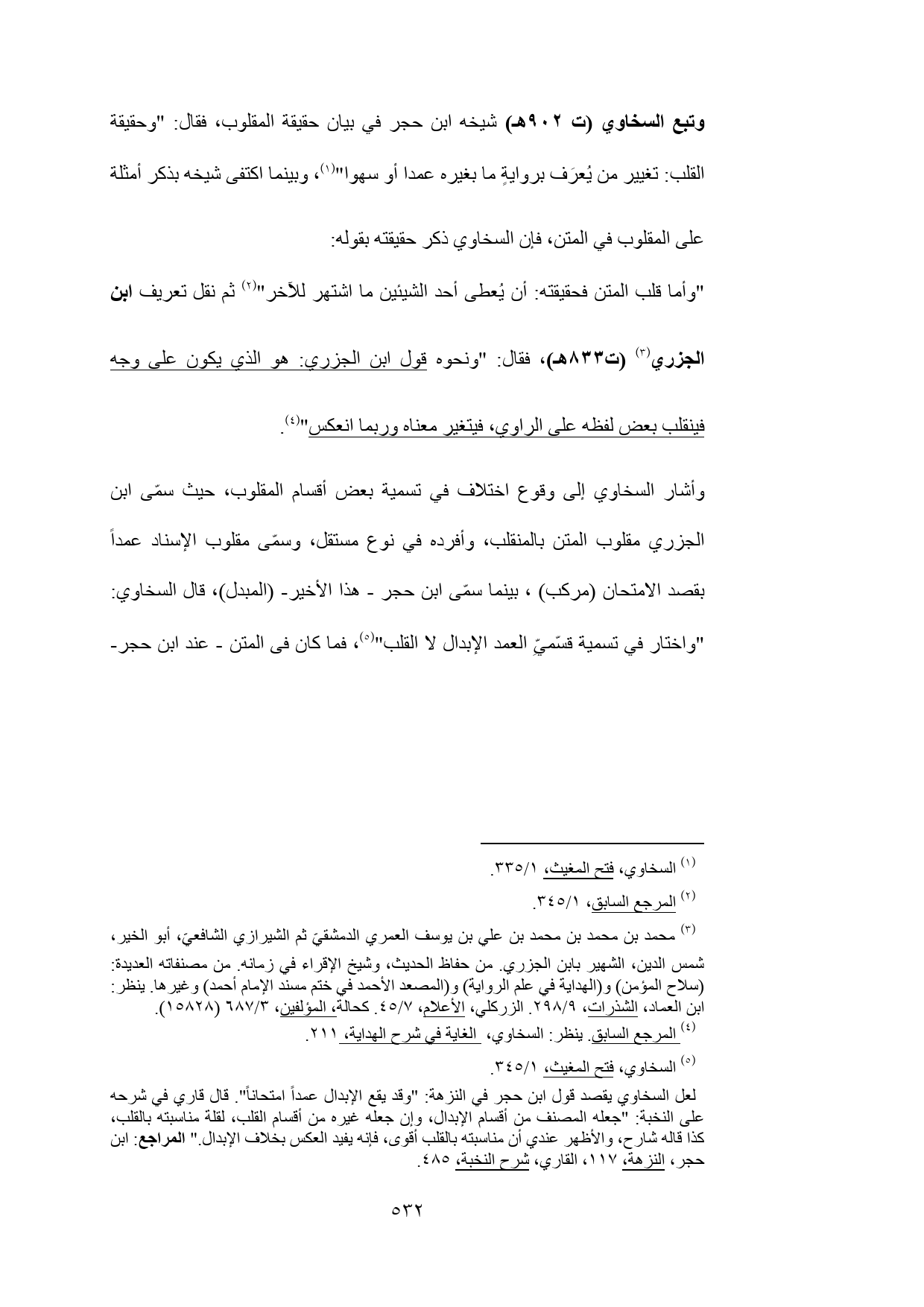 "وأما قلب المتن فحقيقته: أن يُعطى أحد الشيئين ما اشتهر للآخر" (¬2) ثم نقل تعريف ابن الجزري (¬3) (ت 833 هـ)، فقال: "ونحوه قول ابن الجزري: هو الذي يكون على وجه فينقلب بعض لفظه على الراوي، فيتغير معناه وربما انعكس" (¬4).