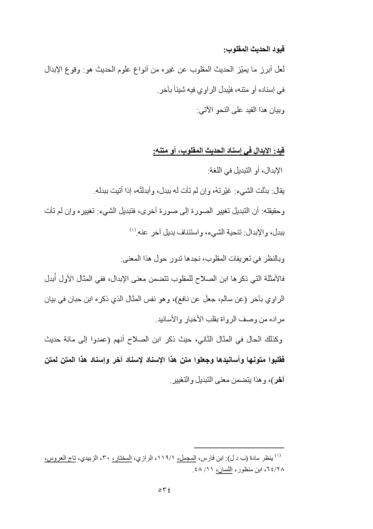 وكذلك الحال في المثال الثاني، حيث ذكر ابن الصلاح أنهم (عمدوا إلى مائة حديث فقلبوا متونها وأسانيدها وجعلوا متن هذا الإسناد لإسناد آخر وإسناد هذا المتن لمتن آخر)، وهذا يتضمن معنى التبديل والتغيير.