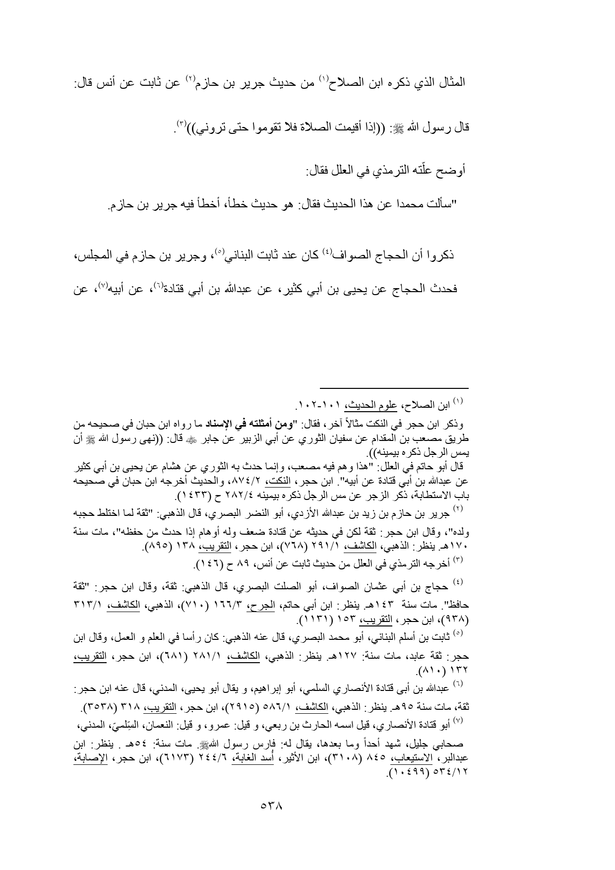 المثال الذي ذكره ابن الصلاح (¬1) من حديث جرير بن حازم (¬2) عن ثابت عن أنس قال: قال رسول الله - صلى الله عليه وسلم -: ((إذا أقيمت الصلاة فلا تقوموا حتى تروني)) (¬3).