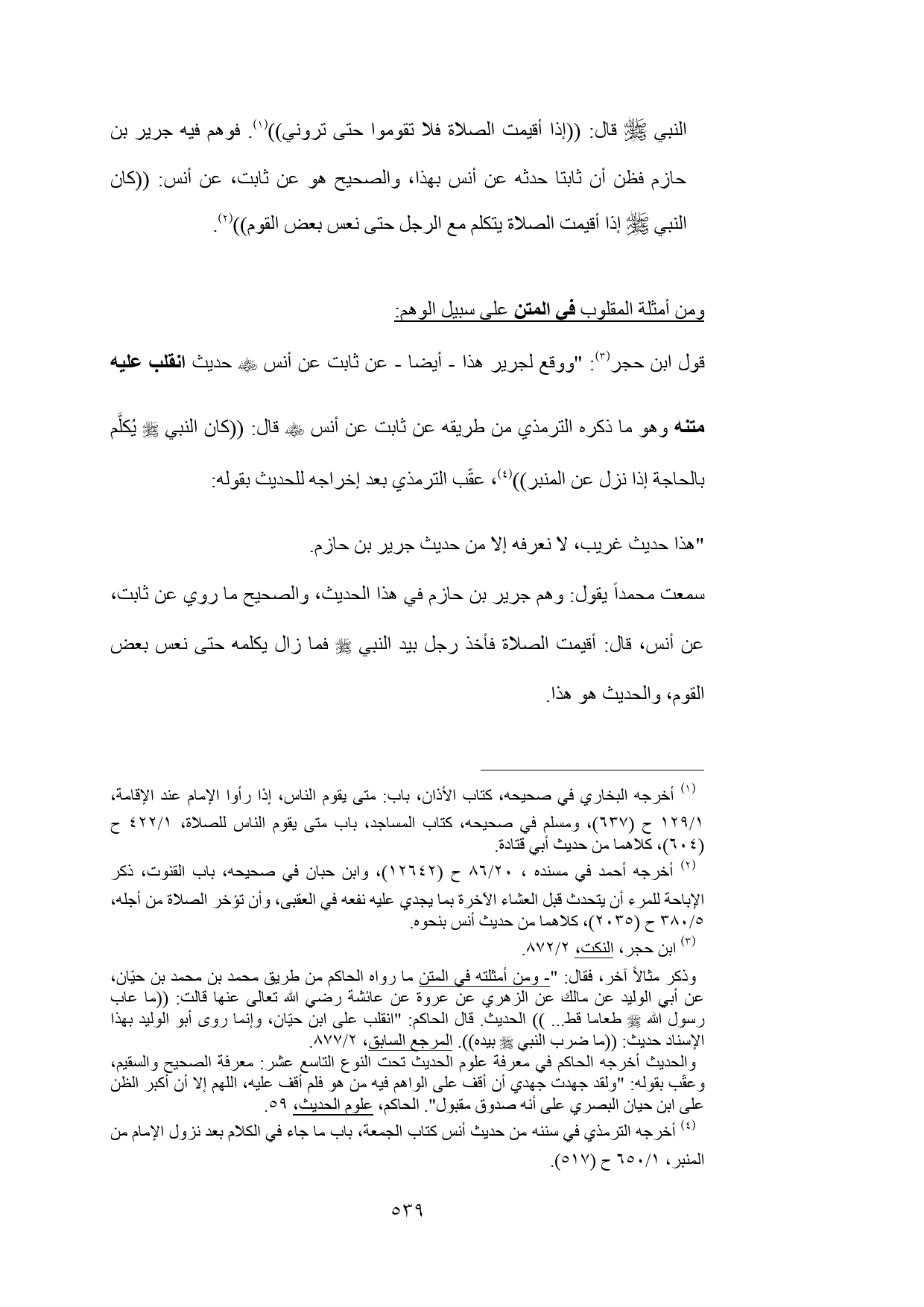 حتى تروني)) (¬1). فوهم فيه جرير بن حازم فظن أن ثابتا حدثه عن أنس بهذا, والصحيح هو عن ثابت, عن أنس: ((كان النبي - صلى الله عليه وسلم - إذا أقيمت الصلاة يتكلم مع الرجل حتى نعس بعض القوم)) (¬2).