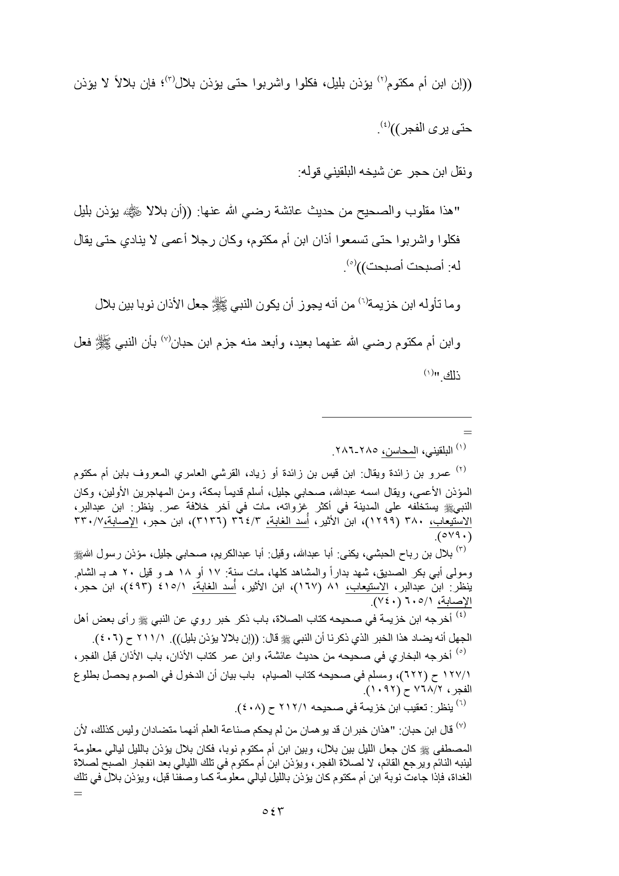 (¬6) قال ابن حبان: "هذان خبران قد يوهمان من لم يحكم صناعة العلم أنهما متضادان وليس كذلك، لأن المصطفى - صلى الله عليه وسلم - كان جعل الليل بين بلال، وبين ابن أم مكتوم نوبا، فكان بلال يؤذن بالليل ليالي معلومة لينبه النائم ويرجع القائم، لا لصلاة الفجر، ويؤذن ابن أم مكتوم في تلك الليالي بعد انفجار الصبح لصلاة الغداة، فإذا جاءت نوبة ابن أم مكتوم كان يؤذن بالليل ليالي معلومة كما وصفنا قبل، ويؤذن بلال في تلك الليالي بعد انفجار الصبح لصلاة الغداة، من غير أن يكون بين الخبرين تضاد أو تهاتر" ابن حبان، الصحيح، 8/ 252 - 253 ح (3474).
