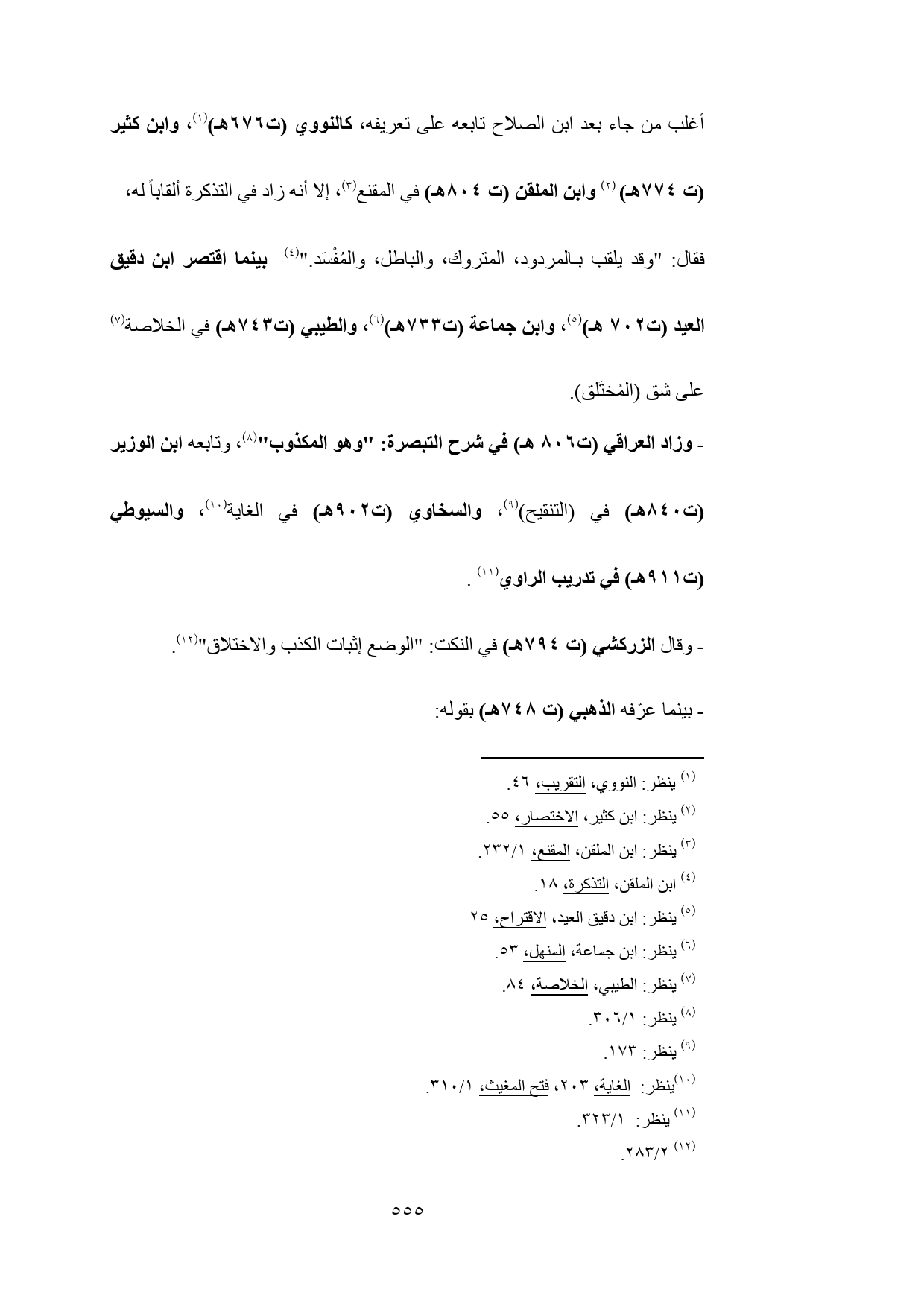 - وزاد العراقي (ت 806 هـ) في شرح التبصرة: "وهو المكذوب" (¬8)، وتابعه ابن الوزير (ت 840 هـ) في (التنقيح) (¬9)، والسخاوي (ت 902 هـ) في الغاية (¬10)، والسيوطي (ت 911 هـ) في تدريب الراوي (¬11).