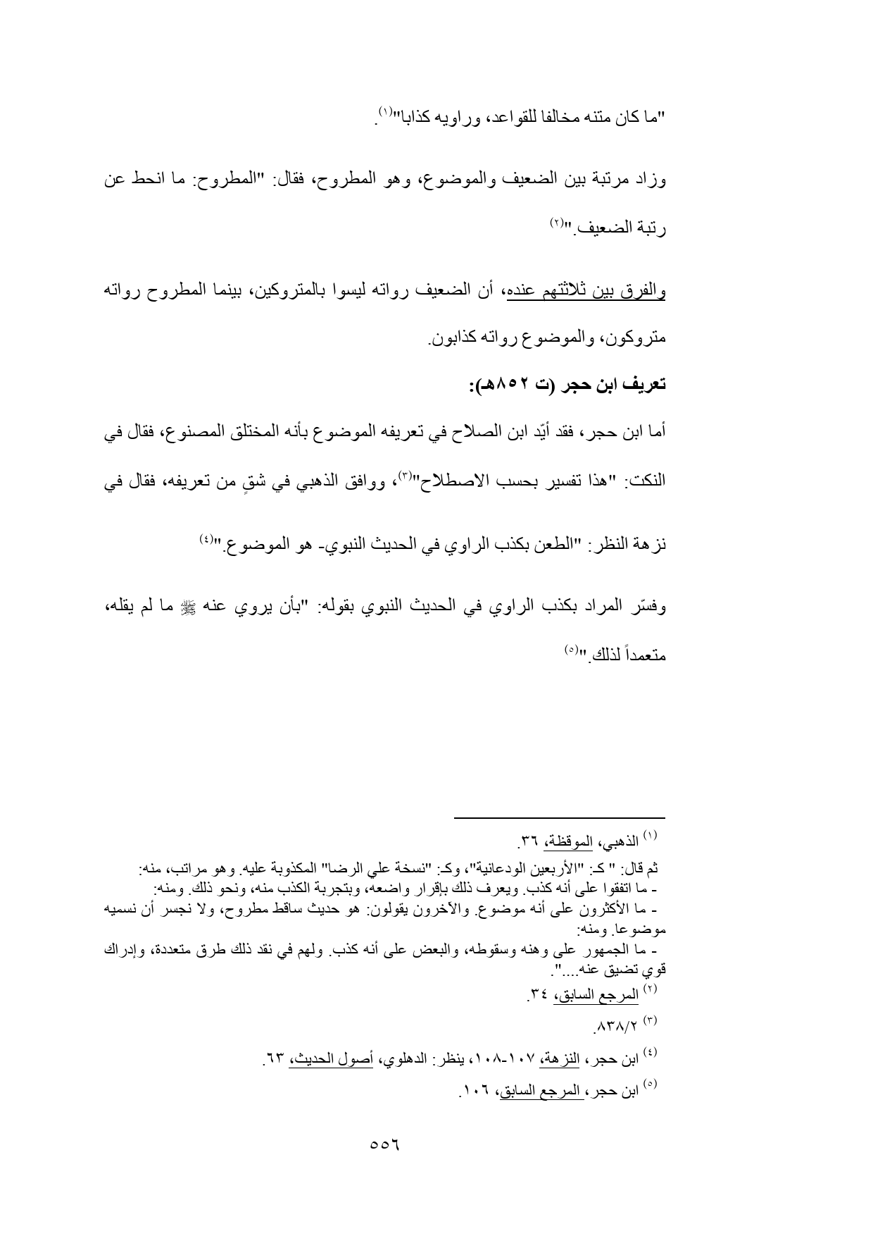 أما ابن حجر، فقد أيّد ابن الصلاح في تعريفه الموضوع بأنه المختلق المصنوع، فقال في النكت: "هذا تفسير بحسب الاصطلاح" (¬3)، ووافق الذهبي في شقٍ من تعريفه، فقال في نزهة النظر: "الطعن بكذب الراوي في الحديث النبوي- هو الموضوع." (¬4)