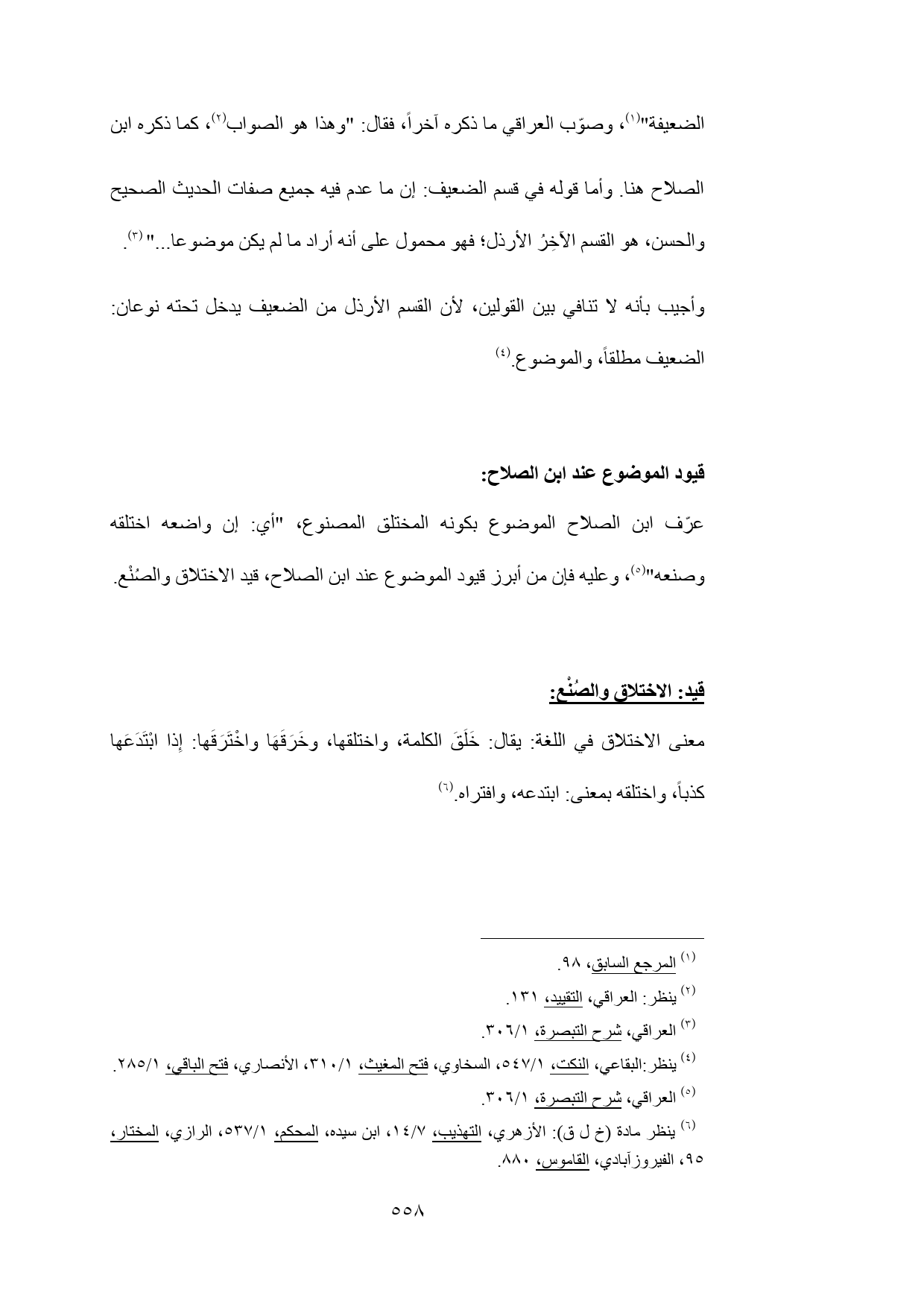 عرّف ابن الصلاح الموضوع بكونه المختلق المصنوع، "أي: إن واضعه اختلقه وصنعه" (¬5)، وعليه فإن من أبرز قيود الموضوع عند ابن الصلاح، قيد الاختلاق والصُنْع.