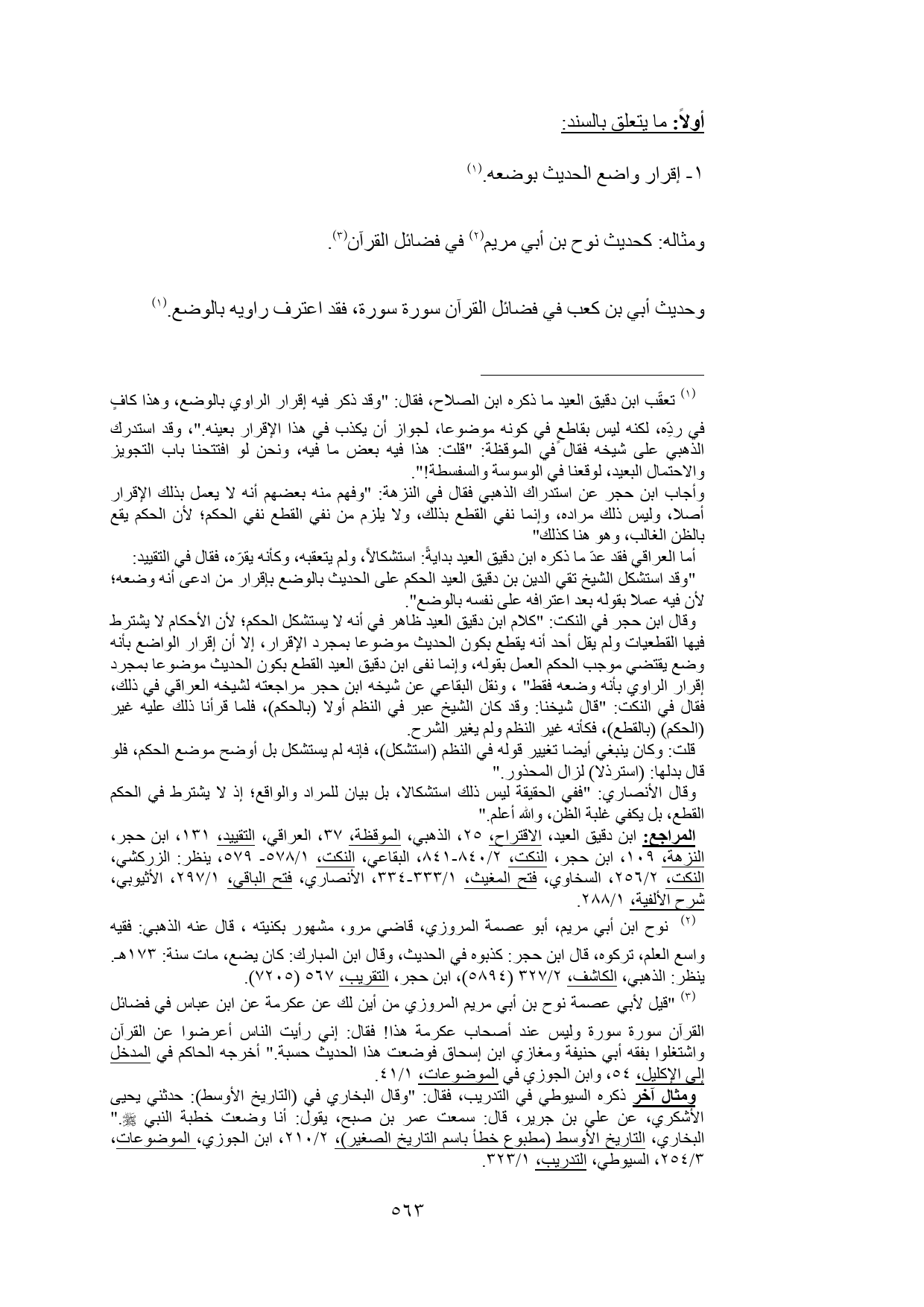 (¬1) تعقّب ابن دقيق العيد ما ذكره ابن الصلاح، فقال: "وقد ذكر فيه إقرار الراوي بالوضع، وهذا كافٍ في ردِّه، لكنه ليس بقاطعٍ في كونه موضوعا، لجواز أن يكذب في هذا الإقرار بعينه."، وقد استدرك الذهبي على شيخه فقال في الموقظة: "قلت: هذا فيه بعض ما فيه، ونحن لو افتتحنا باب التجويز والاحتمال البعيد، لوقعنا في الوسوسة والسفسطة! ".