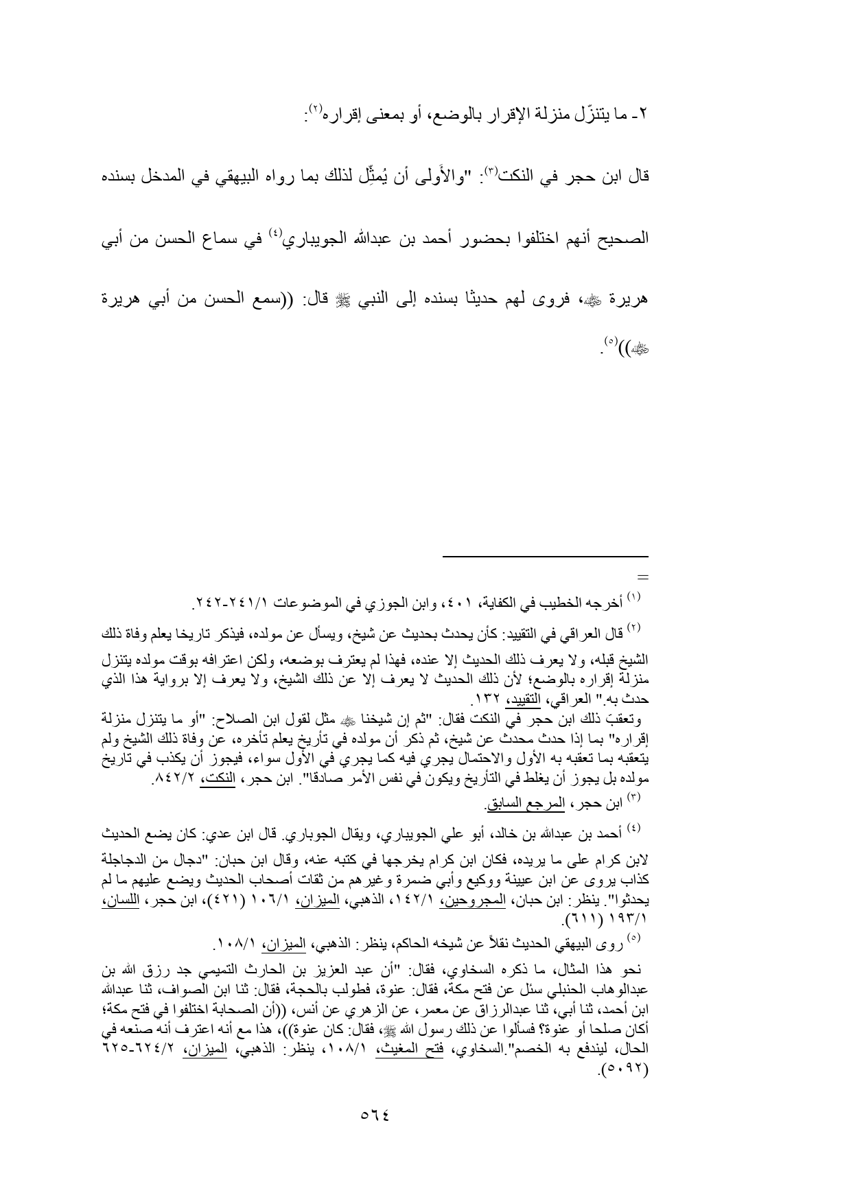 قال ابن حجر في النكت (¬2): "والأَولى أن يُمثِّل لذلك بما رواه البيهقي في المدخل بسنده الصحيح أنهم اختلفوا بحضور أحمد بن عبدالله الجويباري (¬3) في سماع الحسن من أبي هريرة - رضي الله عنه -، فروى لهم حديثا بسنده إلى النبي - صلى الله عليه وسلم - قال: ((سمع الحسن من أبي هريرة - رضي الله عنه -)) (¬4).
