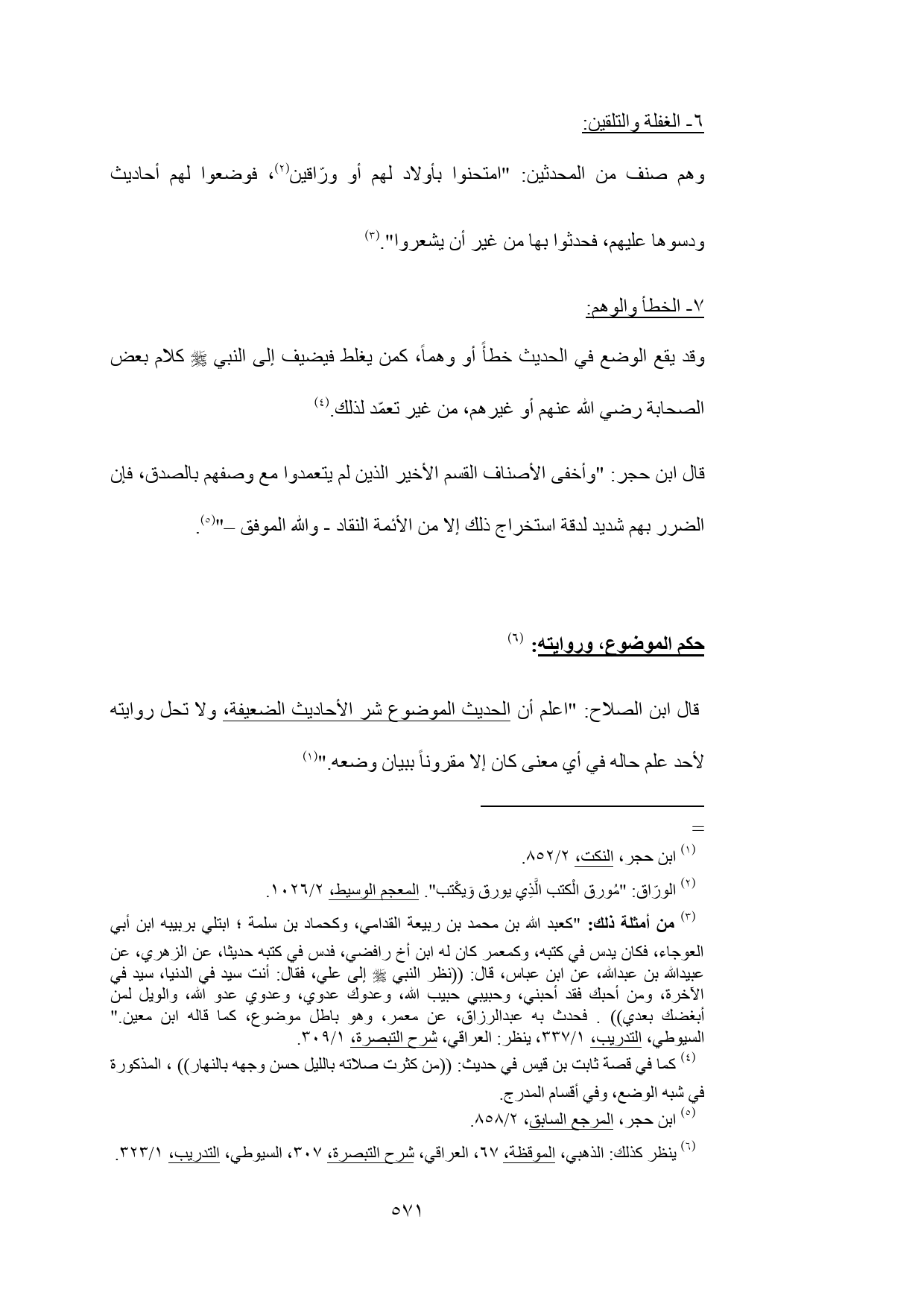 وقد يقع الوضع في الحديث خطأً أو وهماً، كمن يغلط فيضيف إلى النبي - صلى الله عليه وسلم - كلام بعض الصحابة رضي الله عنهم أو غيرهم، من غير تعمّد لذلك. (¬3)