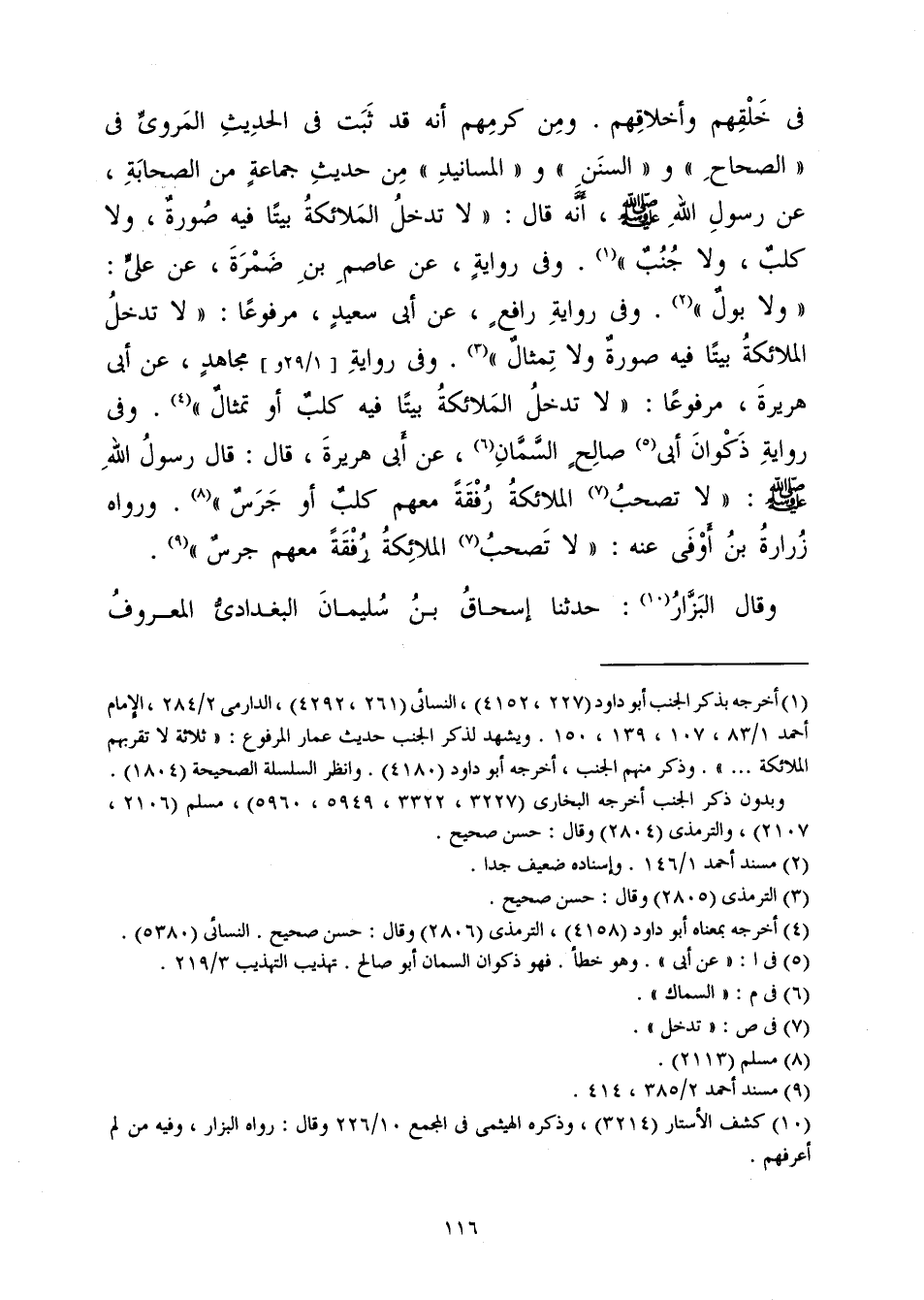 فِي خُلُقِهِمْ وَأَخْلَاقِهِمْ. وَمِنْ كَرَمِهِمْ أَنَّهُ قَدْ ثَبَتَ فِي الْحَدِيثِ الْمَرْوِيِّ فِي الصِّحَاحِ، وَالسُّنَنِ، وَالْمَسَانِيدِ مِنْ حَدِيثِ جَمَاعَةٍ مِنَ الصَّحَابَةِ، عَنْ رَسُولِ اللَّهِ صَلَّى اللَّهُ عَلَيْهِ وَسَلَّمَ أَنَّهُ قَالَ: «لَا يَدْخُلُ الْمَلَائِكَةُ بَيْتًا فِيهِ صُورَةٌ وَلَا كَلْبٌ وَلَا جُنُبٌ» . وَفِي رِوَايَةٍ، عَنْ عَاصِمِ بْنِ ضَمْرَةَ، عَنْ عَلِيٍّ «وَلَا بَوْلٌ» . وَفِي رِوَايَةِ رَافِعٍ، عَنْ أَبِي سَعِيدٍ مَرْفُوعًا «لَا تَدْخُلُ الْمَلَائِكَةُ بَيْتًا فِيهِ صُورَةٌ، وَلَا تِمْثَالٌ» . وَفِي رِوَايَةِ مُجَاهِدٍ، عَنْ أَبِي هُرَيْرَةَ مَرْفُوعًا «لَا تَدْخُلُ الْمَلَائِكَةُ بَيْتًا فِيهِ كَلْبٌ أَوْ تِمْثَالٌ» ، وَفِي رِوَايَةِ ذَكْوَانَ أَبِي صَالِحٍ السَّمَّانِ، عَنْ أَبِي هُرَيْرَةَ قَالَ: قَالَ رَسُولُ اللَّهِ صَلَّى اللَّهُ عَلَيْهِ وَسَلَّمَ: «لَا تَصْحَبُ الْمَلَائِكَةُ رُفْقَةً مَعَهُمْ كَلْبٌ أَوْ جَرَسٌ» . وَرَوَاهُ زُرَارَةُ بْنُ أَوْفَى عَنْهُ: «لَا تَصْحَبُ الْمَلَائِكَةُ رُفْقَةً مَعَهُمْ جَرَسٌ» .