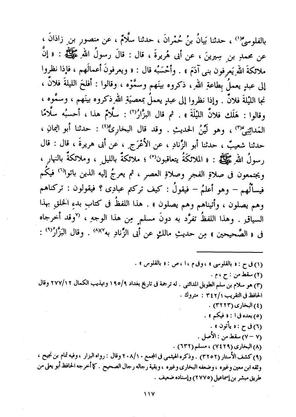 بِالْفَلُوسِيِّ، حَدَّثَنَا بَيَانُ بْنُ حُمْرَانَ، حَدَّثَنَا سَلَّامٌ، عَنْ مَنْصُورِ بْنِ زَاذَانَ، عَنْ مُحَمَّدِ بْنِ سِيرِينَ، عَنْ أَبِي هُرَيْرَةَ قَالَ: قَالَ رَسُولُ اللَّهِ صَلَّى اللَّهُ عَلَيْهِ وَسَلَّمَ: «إِنَّ مَلَائِكَةَ اللَّهِ يَعْرِفُونَ بَنِي آدَمَ» . وَأَحْسَبُهُ قَالَ: «وَيَعْرِفُونَ أَعْمَالَهُمْ فَإِذَا نَظَرُوا إِلَى عَبْدٍ يَعْمَلُ بِطَاعَةِ اللَّهِ ذَكَرُوهُ بَيْنَهُمْ وَسَمَّوْهُ، وَقَالُوا: أَفْلَحَ اللَّيْلَةَ فُلَانٌ، نَجَا اللَّيْلَةَ فُلَانٌ، وَإِذَا نَظَرُوا إِلَى عَبْدٍ يَعْمَلُ بِمَعْصِيَةِ اللَّهِ ذَكَرُوهُ بَيْنَهُمْ وَسَمَّوْهُ، وَقَالُوا: هَلَكَ فُلَانٌ اللَّيْلَةَ» . ثُمَّ قَالَ الْبَزَّارُ: سَلَّامٌ هَذَا أَحْسَبُهُ سَلَّامًا الْمَدَائِنِيَّ، وَهُوَ لَيِّنُ الْحَدِيثِ. وَقَدْ قَالَ الْبُخَارِيُّ: حَدَّثَنَا أَبُو الْيَمَانِ، حَدَّثَنَا شُعَيْبٌ، حَدَّثَنَا أَبُو الزِّنَادِ، عَنِ الْأَعْرَجِ، عَنْ أَبِي هُرَيْرَةَ قَالَ: قَالَ رَسُولُ اللَّهِ صَلَّى اللَّهُ عَلَيْهِ وَسَلَّمَ: «الْمَلَائِكَةُ يَتَعَاقَبُونَ ; مَلَائِكَةٌ بِاللَّيْلِ، وَمَلَائِكَةٌ بِالنَّهَارِ، وَيَجْتَمِعُونَ فِي صَلَاةِ الْفَجْرِ وَصَلَاةِ الْعَصْرِ، ثُمَّ يُعَرِّجُ إِلَيْهِ الَّذِينَ بَاتُوا فِيكُمْ فَيَسْأَلُهُمْ، وَهُوَ أَعْلَمُ فَيَقُولُ: كَيْفَ تَرَكْتُمْ عِبَادِي؟ فَيَقُولُونَ: تَرَكْنَاهُمْ وَهُمْ يُصَلُّونَ، وَأَتَيْنَاهُمْ وَهُمْ يُصَلُّونَ» . هَذَا اللَّفْظُ فِي كِتَابِ بَدْءِ الْخَلْقِ بِهَذَا السِّيَاقِ. وَهَذَا اللَّفْظُ تَفَرَّدَ بِهِ دُونَ مُسْلِمٍ مِنْ هَذَا الْوَجْهِ، وَقَدْ أَخْرَجَاهُ فِي " الصَّحِيحَيْنِ " فِي الْبَدْءِ مِنْ حَدِيثِ مَالِكٍ، عَنْ أَبِي الزِّنَادِ بِهِ. وَقَالَ الْبَزَّارُ:
