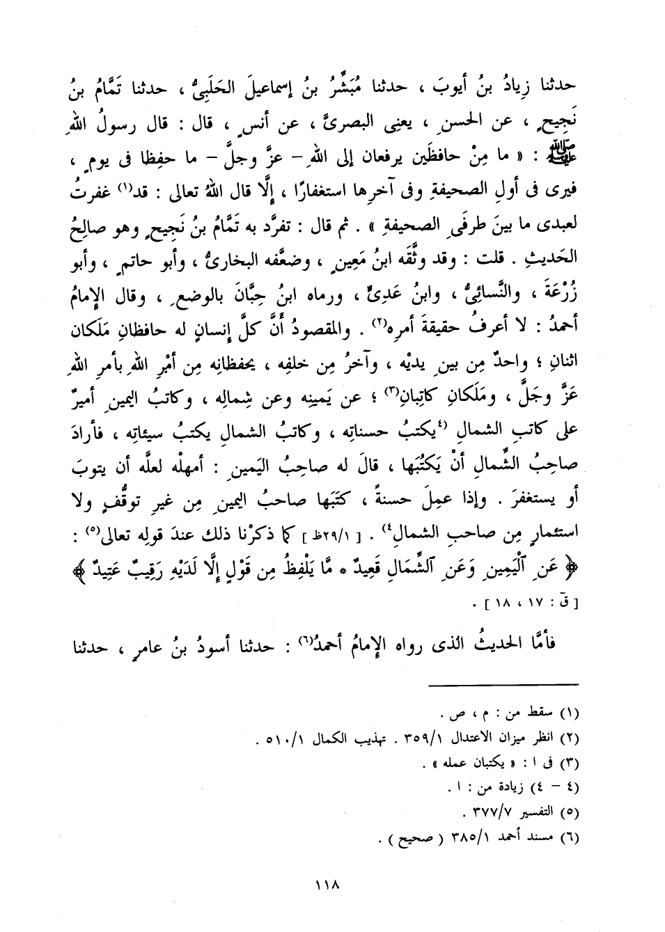 حَدَّثَنَا زِيَادُ بْنُ أَيُّوبَ، حَدَّثَنَا مُبَشِّرُ بْنُ إِسْمَاعِيلَ الْحَلَبِيُّ، حَدَّثَنَا تَمَّامُ بْنُ نَجِيحٍ، عَنِ الْحَسَنِ يَعْنِي الْبَصْرِيَّ، عَنْ أَنَسٍ قَالَ: قَالَ رَسُولُ اللَّهِ صَلَّى اللَّهُ عَلَيْهِ وَسَلَّمَ: «مَا مِنْ حَافِظَيْنِ يَرْفَعَانِ إِلَى اللَّهِ عَزَّ وَجَلَّ مَا حَفِظَا فِي يَوْمٍ فَيَرَى فِي أَوَّلِ الصَّحِيفَةِ وَفِي آخِرِهَا اسْتِغْفَارًا إِلَّا قَالَ اللَّهُ تَعَالَى: قَدْ غَفَرْتُ لِعَبْدِي مَا بَيْنَ طَرَفَيِ الصَّحِيفَةِ» . ثُمَّ قَالَ: تَفَرَّدَ بِهِ تَمَّامُ بْنُ نَجِيحٍ، وَهُوَ صَالِحُ الْحَدِيثِ قُلْتُ: وَقَدْ وَثَّقَهُ ابْنُ مَعِينٍ، وَضَعَّفَهُ الْبُخَارِيُّ، وَأَبُو حَاتِمٍ، وَأَبُو زُرْعَةَ، وَالنِّسَائِيُّ، وَابْنُ عَدِيٍّ، وَرَمَاهُ ابْنُ حِبَّانَ بِالْوَضْعِ، وَقَالَ الْإِمَامُ أَحْمَدُ لَا أَعْرِفُ حَقِيقَةَ أَمْرِهِ.