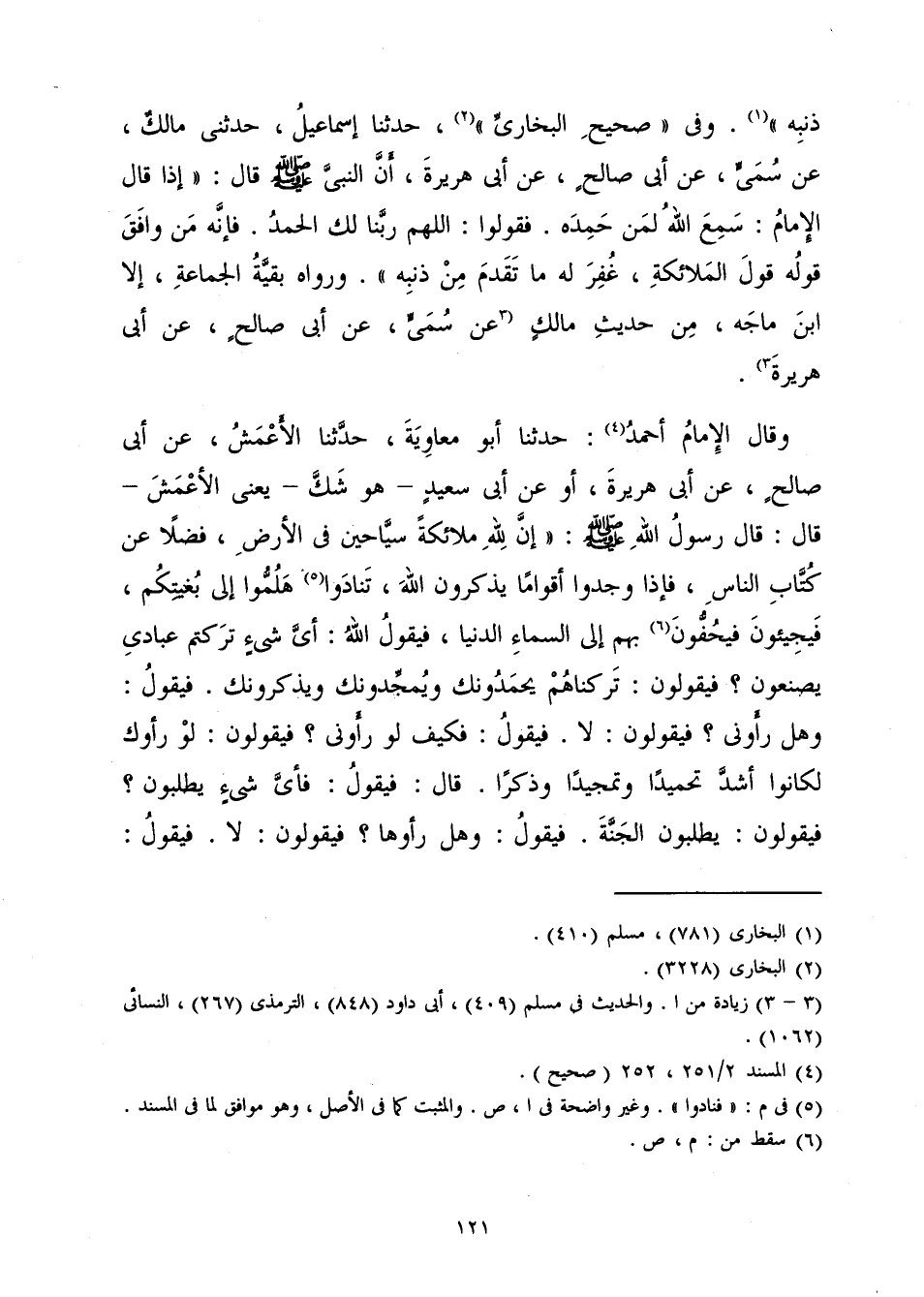 ذَنْبِهِ» . وَفِي صَحِيحِ الْبُخَارِيِّ: حَدَّثَنَا إِسْمَاعِيلُ حَدَّثَنِي مَالِكٌ، عَنْ سُمَيٍّ، عَنْ أَبِي صَالِحٍ، عَنْ أَبِي هُرَيْرَةَ أَنَّ النَّبِيَّ صَلَّى اللَّهُ عَلَيْهِ وَسَلَّمَ قَالَ: «إِذَا قَالَ الْإِمَامُ: سَمِعَ اللَّهُ لِمَنْ حَمِدَهُ فَقُولُوا اللَّهُمَّ رَبَّنَا وَلَكَ الْحَمْدُ، فَإِنَّ مَنْ وَافَقَ قَوْلُهُ قَوْلَ الْمَلَائِكَةِ غُفِرَ لَهُ مَا تَقَدَّمَ مِنْ ذَنْبِهِ» . وَرَوَاهُ بَقِيَّةُ الْجَمَاعَةِ إِلَّا ابْنَ مَاجَهْ مِنْ حَدِيثِ مَالِكٍ، عَنْ سُمَيٍّ، عَنْ أَبِي صَالِحٍ، عَنْ أَبِي هُرَيْرَةَ.