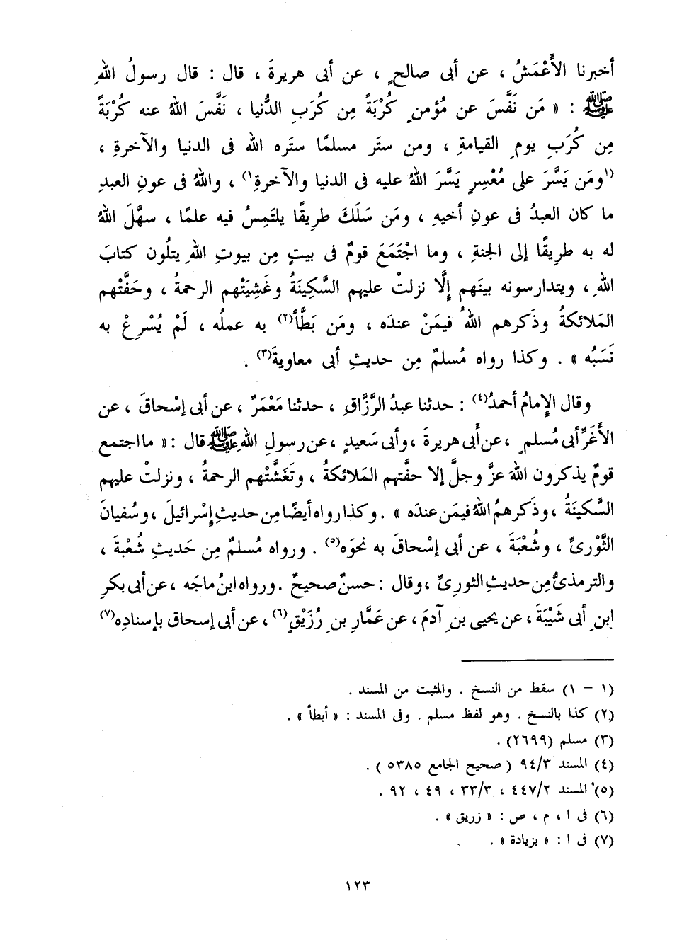 أَخْبَرَنَا الْأَعْمَشُ، عَنْ أَبِي صَالِحٍ، عَنْ أَبِي هُرَيْرَةَ قَالَ: قَالَ رَسُولُ اللَّهِ صَلَّى اللَّهُ عَلَيْهِ وَسَلَّمَ: «مَنْ نَفَّسَ عَنْ مُؤْمِنٍ كُرْبَةً مِنْ كُرَبِ الدُّنْيَا، نَفَّسَ اللَّهُ عَنْهُ كُرْبَةً مِنْ كُرَبِ يَوْمِ الْقِيَامَةِ، وَمَنْ سَتَرَ مُسْلِمًا، سَتَرَهُ اللَّهُ فِي الدُّنْيَا وَالْآخِرَةِ، وَمَنْ يَسَّرَ عَلَى مُعْسِرٍ، يَسَّرَ اللَّهُ عَلَيْهِ فِي الدُّنْيَا وَالْآخِرَةِ، وَاللَّهُ فِي عَوْنِ الْعَبْدِ، مَا كَانَ الْعَبْدُ فِي عَوْنِ أَخِيهِ، وَمَنْ سَلَكَ طَرِيقًا يَلْتَمِسُ فِيهِ عِلْمًا، سَهَّلَ اللَّهُ لَهُ بِهِ طَرِيقًا إِلَى الْجَنَّةِ، وَمَا اجْتَمَعَ قَوْمٌ فِي بَيْتٍ مِنْ بُيُوتِ اللَّهِ يَتْلُونَ كِتَابَ اللَّهِ، وَيَتَدَارَسُونَهُ بَيْنَهُمْ إِلَّا نَزَلَتْ عَلَيْهِمُ السِّكِينَةُ، وَغَشِيَتْهُمُ الرَّحْمَةُ، وَحَفَّتْهُمُ الْمَلَائِكَةُ، وَذَكَرَهُمُ اللَّهُ فِيمَنْ عِنْدَهُ، وَمَنْ بَطَّأَ بِهِ عَمَلُهُ لَمْ يُسْرِعْ بِهِ نَسَبُهُ» . وَكَذَا رَوَاهُ مُسْلِمٌ مِنْ حَدِيثِ أَبِي مُعَاوِيَةَ.