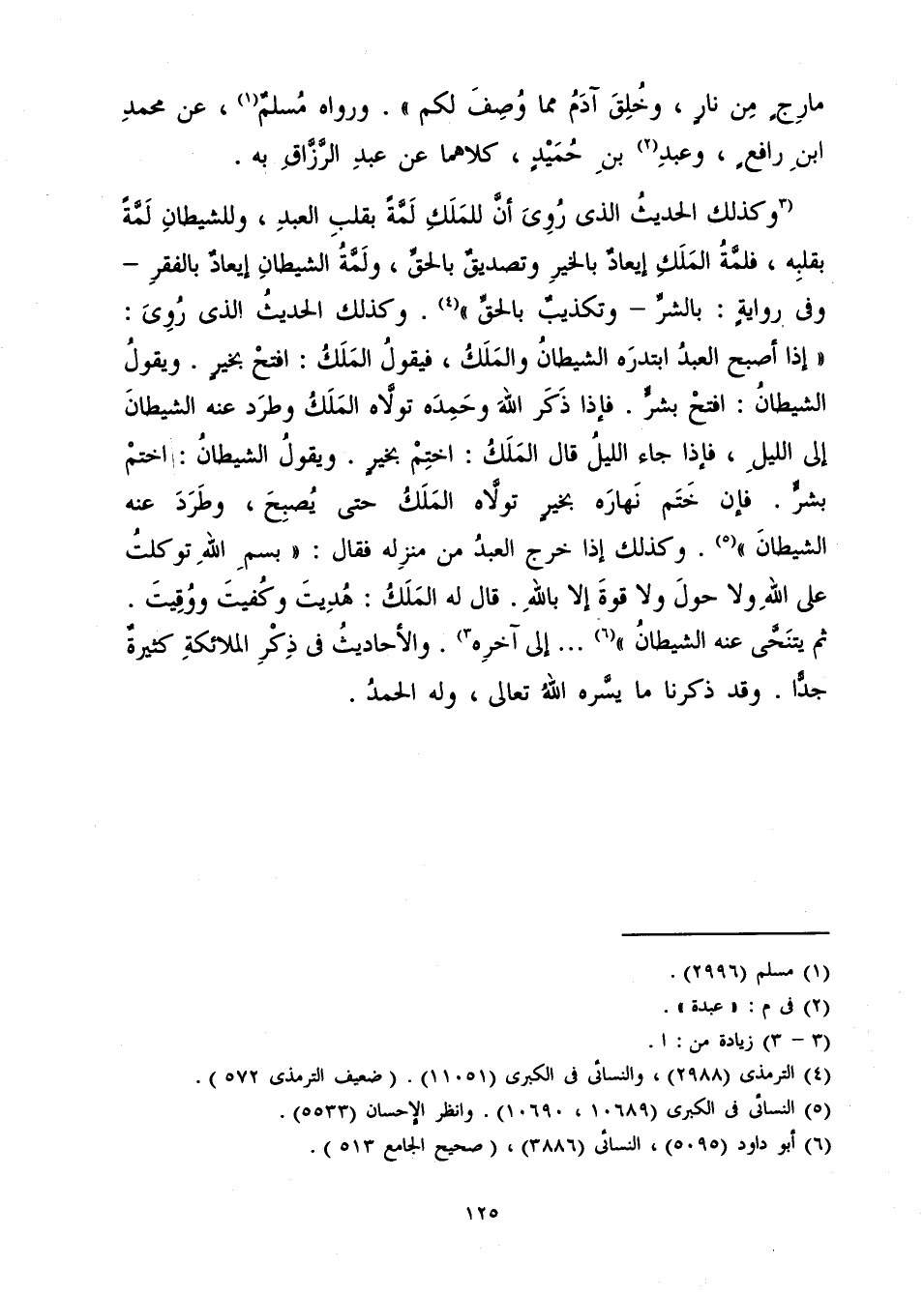 وَكَذَلِكَ الْحَدِيثُ الَّذِي رُوِيَ أَنَّ لِلْمَلَكِ لَمَّةً بِقَلْبِ الْعَبْدِ، وَلِلشَّيْطَانِ لَمَّةً بِقَلْبِهِ فَلَمَّةُ الْمَلَكِ إِيعَادٌ بِالْخَيْرِ وَتَصْدِيقٌ بِالْحَقِّ، وَلَمَّةُ الشَّيْطَانِ إِيعَادٌ بِالْفَقْرِ وَفِي رِوَايَةٍ: بِالشَّرِّ، وَتَكْذِيبٌ بِالْحَقِّ. وَكَذَلِكَ الْحَدِيثُ الَّذِي رُوِيَ: «إِذَا أَصْبَحَ الْعَبْدُ ابْتَدَرَهُ الشَّيْطَانُ وَالْمَلَكُ. فَيَقُولُ الْمَلَكُ: افْتَحْ بِخَيْرٍ. وَيَقُولُ الشَّيْطَانُ: افْتَحْ بِشَرٍّ. فَإِذَا ذَكَرَ اللَّهَ وَحَمِدَهُ، تَوَلَّاهُ الْمَلَكُ، وَطَرَدَ عَنْهُ الشَّيْطَانَ إِلَى اللَّيْلِ. فَإِذَا جَاءَ اللَّيْلُ قَالَ الْمَلَكُ: اخْتِمْ بِخَيْرٍ، وَيَقُولُ الشَّيْطَانُ: اخْتِمْ بِشَرٍّ. فَإِنْ خَتَمَ نَهَارَهُ بِخَيْرٍ، تَوَلَّاهُ الْمَلَكُ حَتَّى يُصْبِحَ. وَطَرَدَ عَنْهُ الشَّيْطَانَ» . وَكَذَلِكَ إِذَا خَرَجَ الْعَبْدُ مِنْ مَنْزِلِهِ فَقَالَ: «بِسْمِ اللَّهِ تَوَكَّلْتُ عَلَى اللَّهِ وَلَا حَوْلَ وَلَا قُوَّةَ إِلَّا بِاللَّهِ. قَالَ لَهُ الْمَلَكُ: هُدِيتَ وَكُفِيتَ وَوُقِيتَ. ثُمَّ يَتَنَحَّى عَنْهُ الشَّيْطَانُ» . إِلَى آخِرِهِ. وَالْأَحَادِيثُ فِي ذِكْرِ الْمَلَائِكَةِ كَثِيرَةٌ جِدًّا. وَقَدْ ذَكَرْنَا مَا يَسَّرَهُ اللَّهُ تَعَالَى وَلَهُ الْحَمْدُ.