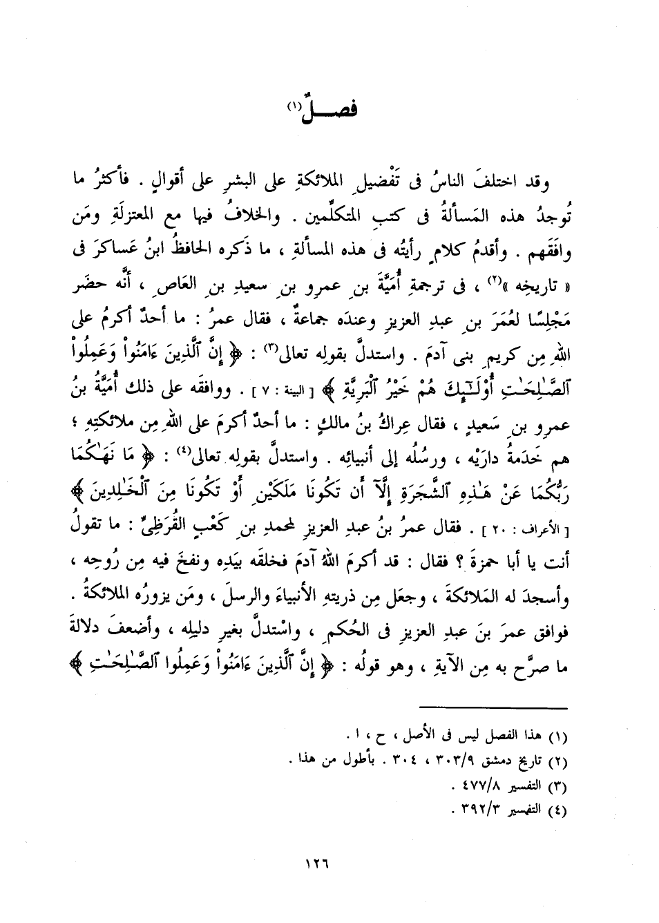 وَقَدِ اخْتَلَفَ النَّاسُ فِي تَفْضِيلِ الْمَلَائِكَةِ عَلَى الْبَشَرِ عَلَى أَقْوَالٍ: فَأَكْثَرُ مَا تُوجَدُ هَذِهِ الْمَسْأَلَةُ فِي كُتُبِ الْمُتَكَلِّمِينَ، وَالْخِلَافُ فِيهَا مَعَ الْمُعْتَزِلَةِ، وَمَنْ وَافَقَهُمْ. وَأَقْدَمُ كَلَامٍ رَأَيْتُهُ فِي هَذِهِ الْمَسْأَلَةِ مَا ذَكَرَهُ الْحَافِظُ ابْنُ عَسَاكِرَ فِي تَارِيخِهِ فِي تَرْجَمَةِ أُمَيَّةَ بْنِ عَمْرِو بْنِ سَعِيدِ بْنِ الْعَاصِ: أَنَّهُ حَضَرَ مَجْلِسًا لِعُمَرَ بْنِ عَبْدِ الْعَزِيزِ وَعِنْدَهُ جَمَاعَةٌ. فَقَالَ عُمَرُ: مَا أَحَدٌ أَكْرَمُ عَلَى اللَّهِ مِنْ كِرِيمِ بَنِي آدَمَ. وَاسْتَدَلَّ بِقَوْلِهِ تَعَالَى: {إِنَّ الَّذِينَ آمَنُوا وَعَمِلُوا الصَّالِحَاتِ أُولَئِكَ هُمْ خَيْرُ الْبَرِيَّةِ} [البينة: 7] . وَوَافَقَهُ عَلَى ذَلِكَ أُمَيَّةُ بْنُ عَمْرِو بْنِ سَعِيدٍ. فَقَالَ عِرَاكُ بْنُ مَالِكٍ: مَا أَحَدٌ أَكْرَمُ عَلَى اللَّهِ مِنْ مَلَائِكَتِهِ هُمْ خَدَمَةُ دَارَيْهِ وَرُسُلُهُ إِلَى أَنْبِيَائِهِ. وَاسْتَدَلَّ بِقَوْلِهِ تَعَالَى: {مَا نَهَاكُمَا رَبُّكُمَا عَنْ هَذِهِ الشَّجَرَةِ إِلَّا أَنْ تَكُونَا مَلَكَيْنِ أَوْ تَكُونَا مِنَ الْخَالِدِينَ} [الأعراف: 20] . فَقَالَ عُمَرُ بْنُ عَبْدِ الْعَزِيزِ لِمُحَمَّدِ بْنِ كَعْبٍ الْقُرَظِيِّ: مَا تَقُولُ أَنْتَ يَا أَبَا حَمْزَةَ؟ فَقَالَ: قَدْ أَكْرَمَ اللَّهُ آدَمَ فَخَلَقَهُ بِيَدِهِ، وَنَفَخَ فِيهِ مِنْ رُوحِهِ، وَأَسْجَدَ لَهُ الْمَلَائِكَةَ، وَجَعَلَ مِنْ ذُرِّيَّتِهِ الْأَنْبِيَاءَ وَالرُّسُلَ، وَمَنْ يَزُورُهُ الْمَلَائِكَةُ. فَوَافَقَ عُمَرَ بْنَ عَبْدِ الْعَزِيزِ فِي الْحُكْمِ، وَاسْتَدَلَّ بِغَيْرِ دَلِيلِهِ، وَأَضْعَفَ دَلَالَةَ مَا صَرَّحَ بِهِ مِنَ الْآيَةِ، وَهُوَ قَوْلُهُ: {إِنَّ الَّذِينَ آمَنُوا وَعَمِلُوا الصَّالِحَاتِ} [البقرة: 277] .
