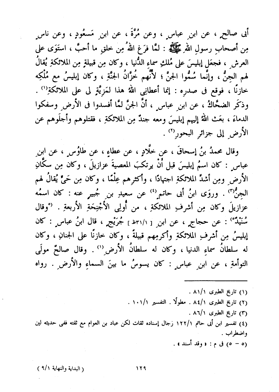 وَقَالَ مُحَمَّدُ بْنُ إِسْحَاقَ، عَنْ خَلَّادٍ، عَنْ عَطَاءٍ، عَنْ طَاوُسٍ، عَنِ ابْنِ عَبَّاسٍ: كَانَ اسْمُ إِبْلِيسَ قَبْلَ أَنْ يَرْتَكِبَ الْمَعْصِيَةَ عَزَازِيلَ، وَكَانَ مِنْ سُكَّانِ الْأَرْضِ، وَمِنْ أَشَدِّ الْمَلَائِكَةِ اجْتِهَادًا وَأَكْثَرِهِمْ عِلْمًا، وَكَانَ مِنْ حَيٍّ يُقَالُ لَهُمُ الْجِنُّ. وَرَوَى ابْنُ أَبِي حَاتِمٍ، عَنْ سَعِيدِ بْنِ جُبَيْرٍ عَنْهُ: كَانَ اسْمُهُ عَزَازِيلَ، وَكَانَ مِنْ أَشْرِفِ الْمَلَائِكَةِ، مِنْ أُولِي الْأَجْنِحَةِ الْأَرْبَعَةِ. وَقَالَ سُنَيْدٌ، عَنْ حَجَّاجٍ، عَنِ ابْنِ جُرَيْجٍ قَالَ ابْنُ عَبَّاسٍ: كَانَ إِبْلِيسُ مِنْ أَشْرَفِ الْمَلَائِكَةِ وَأَكْرَمِهِمْ قَبِيلَةً، وَكَانَ خَازِنًا عَلَى الْجِنَانِ، وَكَانَ لَهُ سُلْطَانُ سَمَاءِ الدُّنْيَا، وَكَانَ لَهُ سُلْطَانُ الْأَرْضِ. وَقَالَ صَالِحٌ مَوْلَى التَّوْأَمَةِ، عَنِ ابْنِ عَبَّاسٍ: كَانَ يَسُوسُ مَا بَيْنَ السَّمَاءِ وَالْأَرْضِ رَوَاهُ