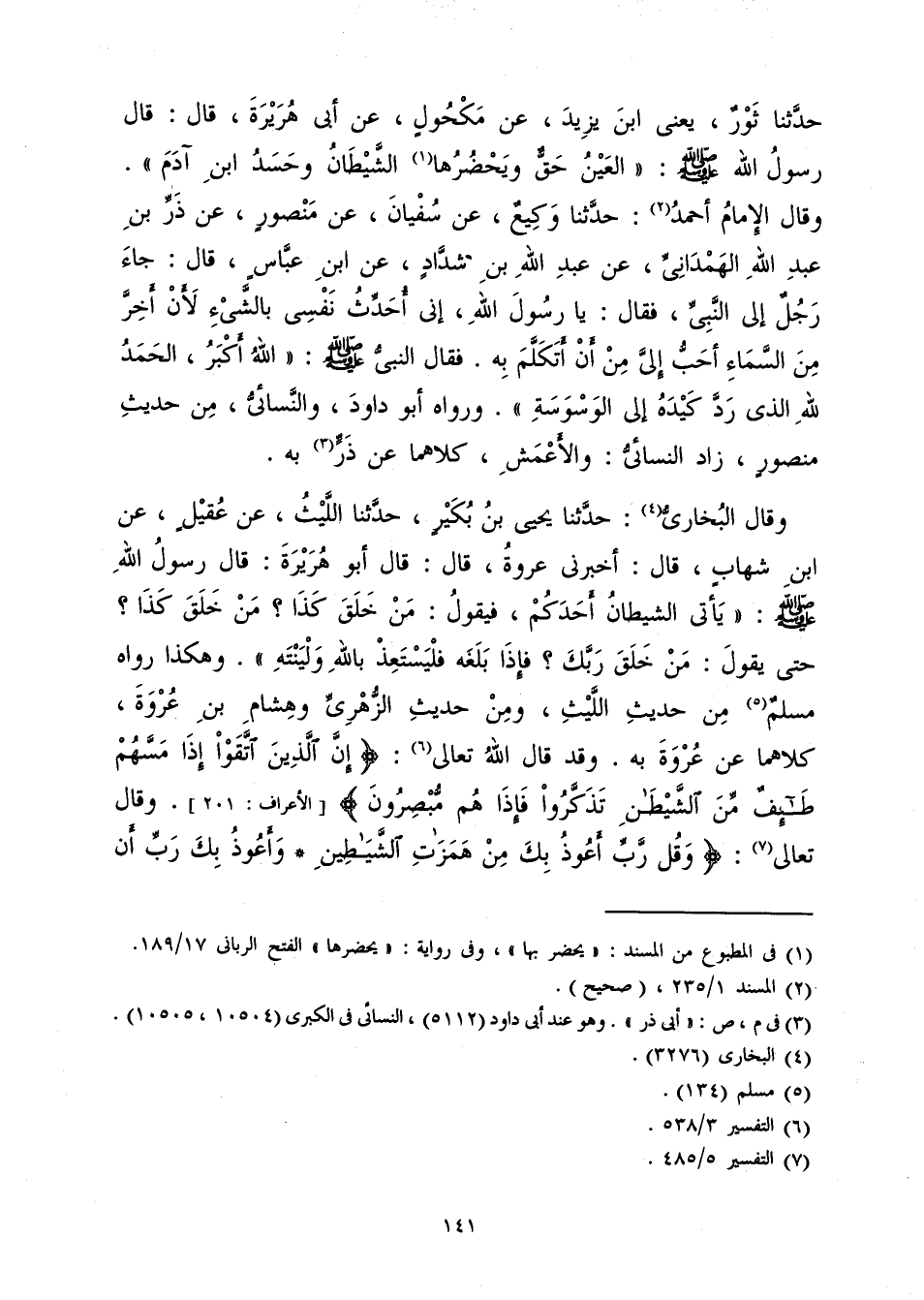 حَدَّثَنَا ثَوْرٌ يَعْنِي ابْنَ يَزِيدَ، عَنْ مَكْحُولٍ، عَنْ أَبِي هُرَيْرَةَ قَالَ: قَالَ رَسُولُ اللَّهِ صَلَّى اللَّهُ عَلَيْهِ وَسَلَّمَ: «الْعَيْنُ حَقٌّ وَيَحْضُرُهَا الشَّيْطَانُ وَحَسَدُ ابْنِ آدَمَ» . وَقَالَ الْإِمَامُ أَحْمَدُ: حَدَّثَنَا وَكِيعٌ، عَنْ سُفْيَانَ، عَنْ مَنْصُورٍ، عَنْ ذَرِّ بْنِ عَبْدِ اللَّهِ الْهَمْدَانِيِّ، عَنْ عَبْدِ اللَّهِ بْنِ شَدَّادٍ، عَنِ ابْنِ عَبَّاسٍ قَالَ: «جَاءَ رَجُلٌ إِلَى النَّبِيِّ صَلَّى اللَّهُ عَلَيْهِ وَسَلَّمَ فَقَالَ: يَا رَسُولَ اللَّهِ إِنِّي أُحَدِّثُ نَفْسِي بِالشَّيْءِ ; لَأَنَّ أَخِرَّ مِنَ السَّمَاءِ أَحَبُّ إِلَيَّ مِنْ أَنْ أَتَكَلَّمَ بِهِ. فَقَالَ النَّبِيُّ صَلَّى اللَّهُ عَلَيْهِ وَسَلَّمَ: اللَّهُ أَكْبَرُ الْحَمْدُ لِلَّهِ الَّذِي رَدَّ كَيْدَهُ إِلَى الْوَسْوَسَةِ» . وَرَوَاهُ أَبُو دَاوُدَ، وَالنَّسَائِيُّ مِنْ حَدِيثِ مَنْصُورٍ، زَادَ النَّسَائِيُّ: وَالْأَعْمَشُ، كِلَاهُمَا عَنْ ذَرٍّ بِهِ.