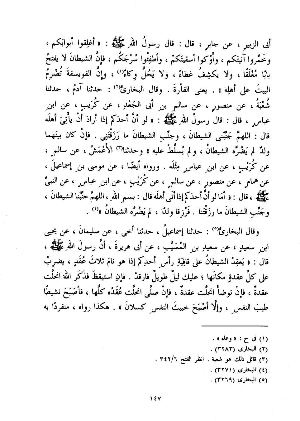 أَبِي الزُّبَيْرِ، عَنْ جَابِرٍ قَالَ: قَالَ رَسُولُ اللَّهِ صَلَّى اللَّهُ عَلَيْهِ وَسَلَّمَ: «أَغْلِقُوا أَبْوَابَكُمْ، وَخَمِّرُوا آنِيَتَكُمْ، وَأَوْكُوا أَسْقِيَتَكُمْ، وَأَطْفِئُوا سُرُجَكُمْ فَإِنَّ الشَّيْطَانَ لَا يَفْتَحُ بَابًا مُغْلَقًا، وَلَا يَكْشِفُ غِطَاءً، وَلَا يَحِلُّ وِكَاءً، وَإِنَّ الْفُوَيْسِقَةَ تُضْرِمُ الْبَيْتَ عَلَى أَهْلِهِ» . يَعْنِي الْفَأْرَةَ. وَقَالَ الْبُخَارِيُّ: حَدَّثَنَا آدَمُ، حَدَّثَنَا شُعْبَةُ، عَنْ مَنْصُورٍ، عَنْ سَالِمِ بْنِ أَبِي الْجَعْدِ، عَنْ كُرَيْبٍ، عَنِ ابْنِ عَبَّاسٍ قَالَ: قَالَ رَسُولُ اللَّهِ صَلَّى اللَّهُ عَلَيْهِ وَسَلَّمَ: «لَوْ أَنَّ أَحَدَكُمْ إِذَا أَرَادَ أَنْ يَأْتِيَ أَهْلَهُ قَالَ: اللَّهُمَّ جَنِّبْنَا الشَّيْطَانَ، وَجَنِّبِ الشَّيْطَانَ مَا رَزَقْتَنِي. فَإِنْ كَانَ بَيْنَهُمَا وَلَدٌ لَمْ يَضُرَّهُ الشَّيْطَانُ، وَلَمْ يُسَلَّطْ عَلَيْهِ» . وَحَدَّثَنَا الْأَعْمَشُ، عَنْ سَالِمٍ، عَنْ كُرَيْبٍ، عَنِ ابْنِ عَبَّاسٍ مِثْلَهُ.