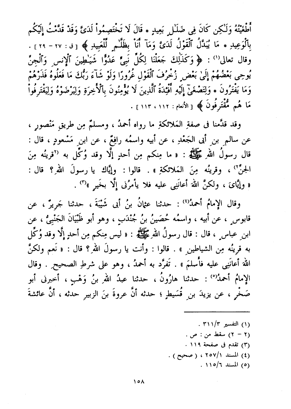وَقَدْ قَدَّمْنَا فِي صِفَةِ الْمَلَائِكَةِ مَا رَوَاهُ أَحْمَدُ، وَمُسْلِمٌ مِنْ طَرِيقِ مَنْصُورٍ، عَنْ سَالِمِ بْنِ أَبِي الْجَعْدِ، عَنْ أَبِيهِ، وَاسْمُهُ رَافِعٌ، عَنِ ابْنِ مَسْعُودٍ قَالَ: قَالَ رَسُولُ اللَّهِ صَلَّى اللَّهُ عَلَيْهِ وَسَلَّمَ: «مَا مِنْكُمْ مِنْ أَحَدٍ إِلَّا وَقَدْ وُكِّلَ بِهِ قَرِينُهُ مِنَ الْجِنِّ، وَقَرِينُهُ مِنَ الْمَلَائِكَةِ. قَالُوا: وَإِيَّاكَ يَا رَسُولَ اللَّهِ. قَالَ: وَإِيَّايَ، وَلَكِنَّ اللَّهَ أَعَانَنِي عَلَيْهِ فَلَا يَأْمُرُنِي إِلَّا بِخَيْرٍ» .