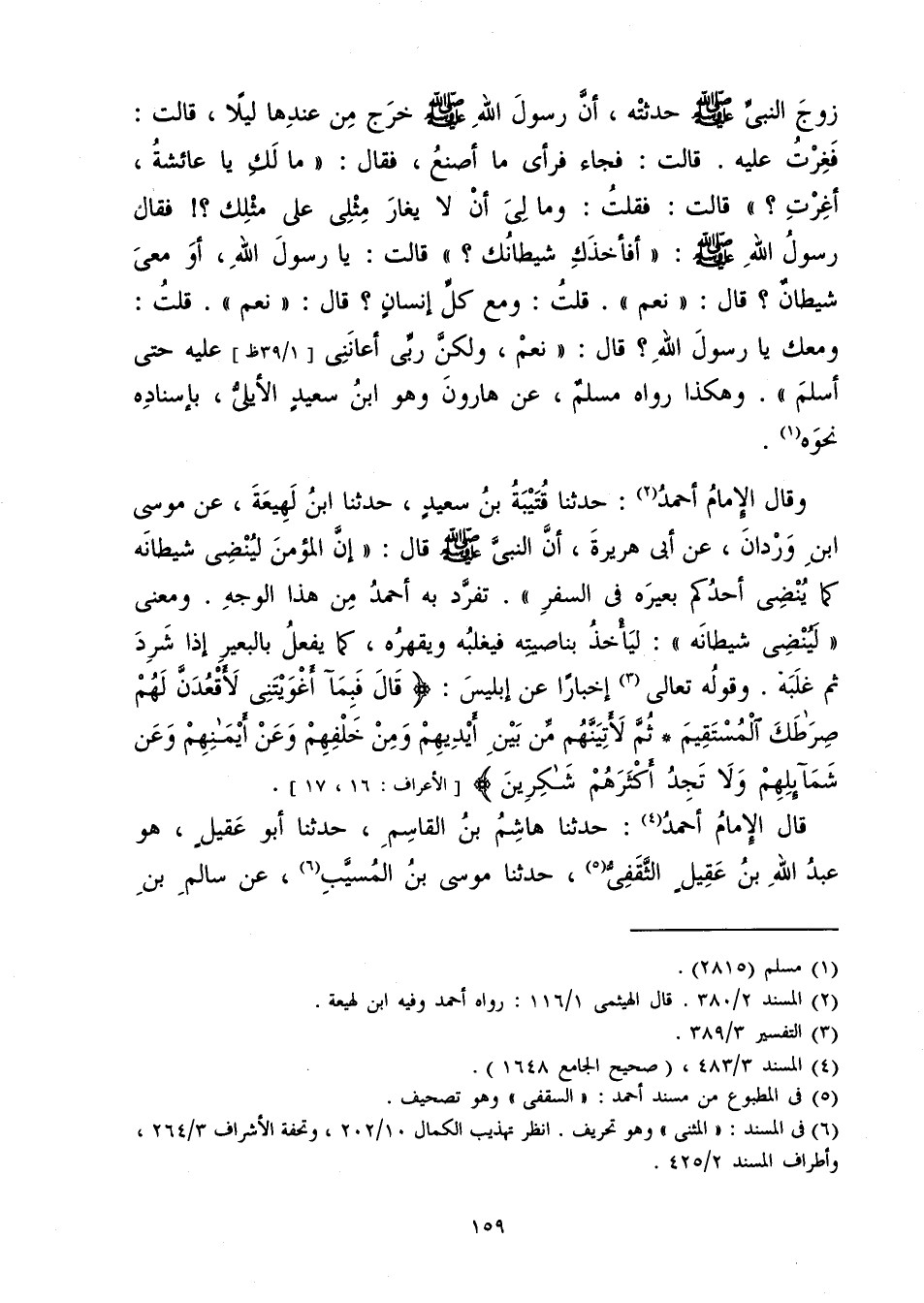 زَوْجَ النَّبِيِّ صَلَّى اللَّهُ عَلَيْهِ وَسَلَّمَ حَدَّثَتْهُ: «أَنَّ رَسُولَ اللَّهِ صَلَّى اللَّهُ عَلَيْهِ وَسَلَّمَ خَرَجَ مِنْ عِنْدِهَا لَيْلًا، قَالَتْ: فَغِرْتُ عَلَيْهِ، قَالَتْ: فَجَاءَ فَرَأَى مَا أَصْنَعُ. فَقَالَ: " مَالَكِ يَا عَائِشَةُ أَغِرْتِ. " قَالَتْ فَقُلْتُ: وَمَالِي أَنْ لَا يَغَارَ مِثْلِي عَلَى مِثْلِكَ. فَقَالَ رَسُولُ اللَّهِ صَلَّى اللَّهُ عَلَيْهِ وَسَلَّمَ: " أَفَأَخَذَكِ شَيْطَانُكِ. " قَالَتْ: يَا رَسُولَ اللَّهِ أَوَ مَعِي شَيْطَانٌ؟ قَالَ: " نَعَمْ. " قُلْتُ: وَمَعَ كُلِّ إِنْسَانٍ؟ قَالَ: " نَعَمْ. " قُلْتُ: وَمَعَكَ يَا رَسُولَ اللَّهِ؟ قَالَ: " نَعَمْ. " وَلَكِنَّ رَبِّي أَعَانَنِي عَلَيْهِ حَتَّى أَسْلَمَ» . وَهَكَذَا رَوَاهُ مُسْلِمٌ، عَنْ هَارُونَ، وَهُوَ ابْنُ سَعِيدٍ الْأَيْلِيُّ بِإِسْنَادِهِ نَحْوَهُ.