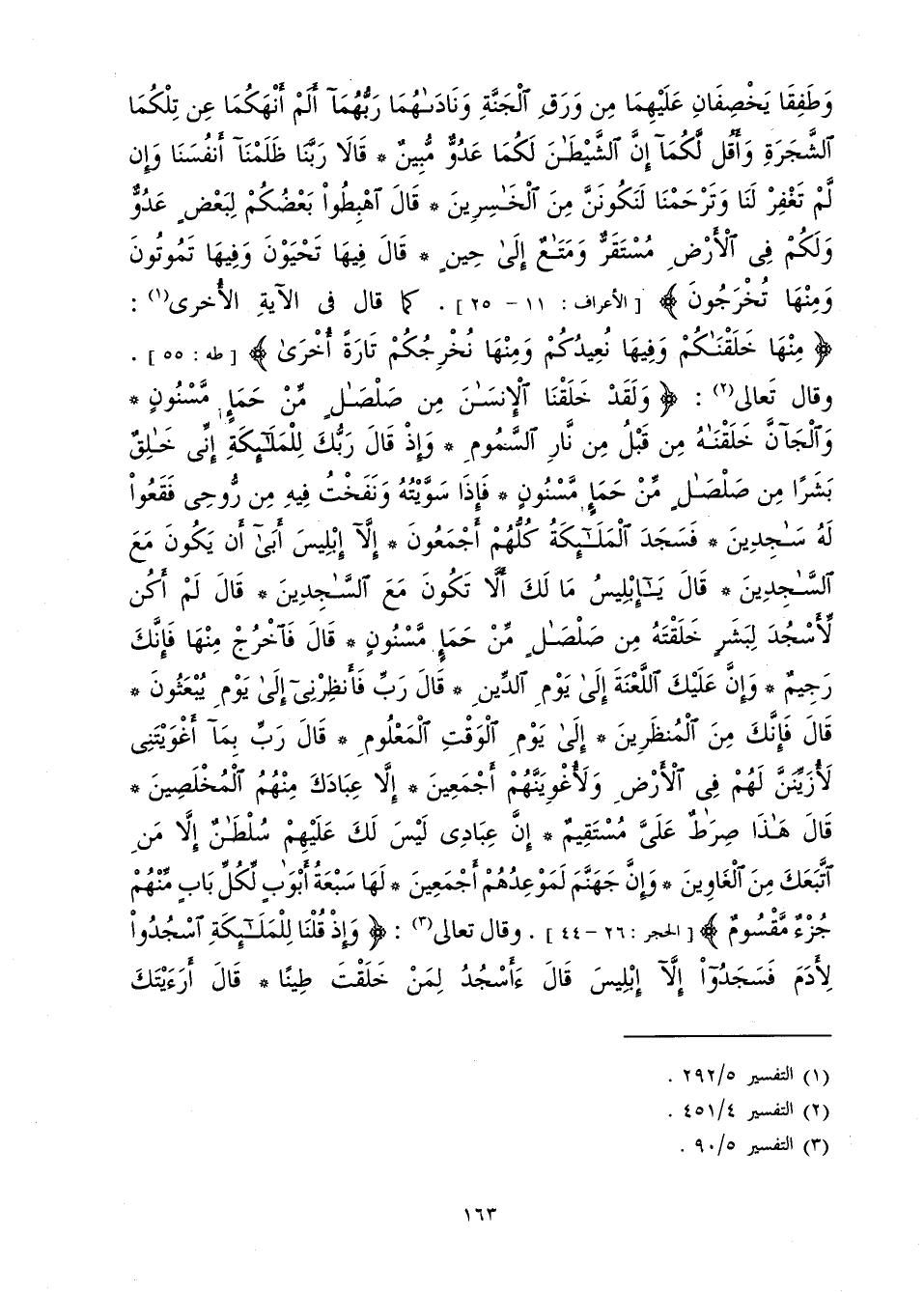 وَقَالَ تَعَالَى: {وَلَقَدْ خَلَقْنَاكُمْ ثُمَّ صَوَّرْنَاكُمْ ثُمَّ قُلْنَا لِلْمَلَائِكَةِ اسْجُدُوا لِآدَمَ فَسَجَدُوا إِلَّا إِبْلِيسَ لَمْ يَكُنْ مِنَ السَّاجِدِينَ قَالَ مَا مَنَعَكَ أَلَّا تَسْجُدَ إِذْ أَمَرْتُكَ قَالَ أَنَا خَيْرٌ مِنْهُ خَلَقْتَنِي مِنْ نَارٍ وَخَلَقْتَهُ مِنْ طِينٍ قَالَ فَاهْبِطْ مِنْهَا فَمَا يَكُونُ لَكَ أَنْ تَتَكَبَّرَ فِيهَا فَاخْرُجْ إِنَّكَ مِنَ الصَّاغِرِينَ قَالَ أَنْظِرْنِي إِلَى يَوْمِ يُبْعَثُونَ قَالَ إِنَّكَ مِنَ الْمُنْظَرِينَ قَالَ فَبِمَا أَغْوَيْتَنِي لَأَقْعُدَنَّ لَهُمْ صِرَاطَكَ الْمُسْتَقِيمَ ثُمَّ لَآتِيَنَّهُمْ مِنْ بَيْنِ أَيْدِيهِمْ وَمِنْ خَلْفِهِمْ وَعَنْ أَيْمَانِهِمْ وَعَنْ شَمَائِلِهِمْ وَلَا تَجِدُ أَكْثَرَهُمْ شَاكِرِينَ قَالَ اخْرُجْ مِنْهَا مَذْءُومًا مَدْحُورًا لَمَنْ تَبِعَكَ مِنْهُمْ لَأَمْلَأَنَّ جَهَنَّمَ مِنْكُمْ أَجْمَعِينَ وَيَا آدَمُ اسْكُنْ أَنْتَ وَزَوْجُكَ الْجَنَّةَ فَكُلَا مِنْ حَيْثُ شِئْتُمَا وَلَا تَقْرَبَا هَذِهِ الشَّجَرَةَ فَتَكُونَا مِنَ الظَّالِمِينَ فَوَسْوَسَ لَهُمَا الشَّيْطَانُ لِيُبْدِيَ لَهُمَا مَا وُورِيَ عَنْهُمَا مِنْ سَوْآتِهِمَا وَقَالَ مَا نَهَاكُمَا رَبُّكُمَا عَنْ هَذِهِ الشَّجَرَةِ إِلَّا أَنْ تَكُونَا مَلَكَيْنِ أَوْ تَكُونَا مِنَ الْخَالِدِينَ وَقَاسَمَهُمَا إِنِّي لَكُمَا لَمِنَ النَّاصِحِينَ فَدَلَّاهُمَا بِغُرُورٍ فَلَمَّا ذَاقَا الشَّجَرَةَ بَدَتْ لَهُمَا سَوْآتُهُمَا وَطَفِقَا يَخْصِفَانِ عَلَيْهِمَا مِنْ وَرَقِ الْجَنَّةِ وَنَادَاهُمَا رَبُّهُمَا أَلَمْ أَنْهَكُمَا عَنْ تِلْكُمَا الشَّجَرَةِ وَأَقُلْ لَكُمَا إِنَّ الشَّيْطَانَ لَكُمَا عَدُوٌّ مُبِينٌ قَالَا رَبَّنَا ظَلَمْنَا أَنْفُسَنَا وَإِنْ لَمْ تَغْفِرْ لَنَا وَتَرْحَمْنَا لَنَكُونَنَّ مِنَ الْخَاسِرِينَ قَالَ اهْبِطُوا بَعْضُكُمْ لِبَعْضٍ عَدُوٌّ وَلَكُمْ فِي الْأَرْضِ مُسْتَقَرٌّ وَمَتَاعٌ إِلَى حِينٍ قَالَ فِيهَا تَحْيَوْنَ وَفِيهَا تَمُوتُونَ وَمِنْهَا تُخْرَجُونَ} [الأعراف: 11]