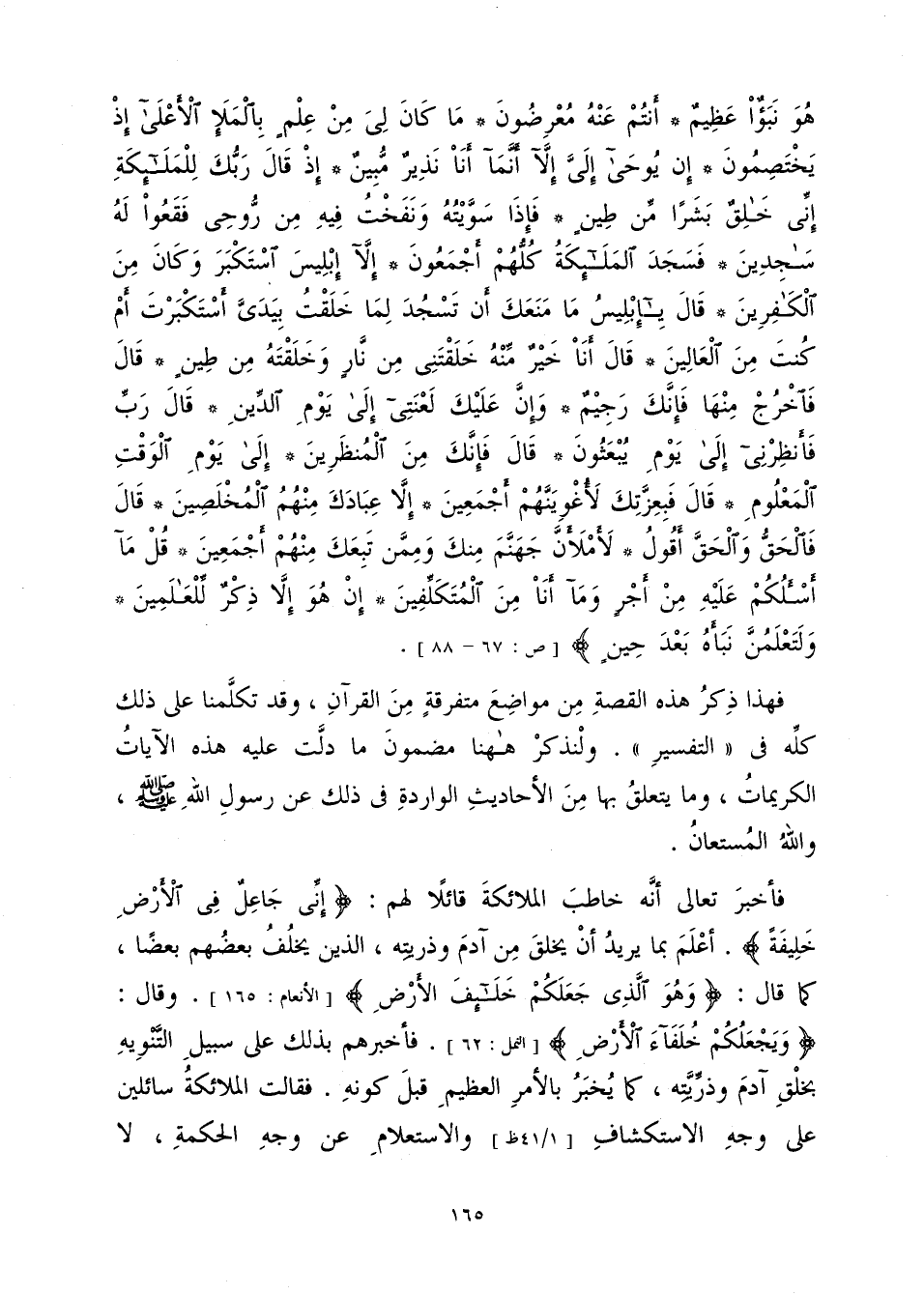 وَقَالَ تَعَالَى: {قُلْ هُوَ نَبَأٌ عَظِيمٌ أَنْتُمْ عَنْهُ مُعْرِضُونَ - مَا كَانَ لِيَ مِنْ عِلْمٍ بِالْمَلَإِ الْأَعْلَى إِذْ يَخْتَصِمُونَ - إِنْ يُوحَى إِلَيَّ إِلَّا أَنَّمَا أَنَا نَذِيرٌ مُبِينٌ - إِذْ قَالَ رَبُّكَ لِلْمَلَائِكَةِ إِنِّي خَالِقٌ بَشَرًا مِنْ طِينٍ - فَإِذَا سَوَّيْتُهُ وَنَفَخْتُ فِيهِ مِنْ رُوحِي فَقَعُوا لَهُ سَاجِدِينَ - فَسَجَدَ الْمَلَائِكَةُ كُلُّهُمْ أَجْمَعُونَ إِلَّا إِبْلِيسَ اسْتَكْبَرَ وَكَانَ مِنَ الْكَافِرِينَ - قَالَ يَا إِبْلِيسُ مَا مَنَعَكَ أَنْ تَسْجُدَ لِمَا خَلَقْتُ بِيَدَيَّ أَسْتَكْبَرْتَ أَمْ كُنْتَ مِنَ الْعَالِينَ - قَالَ أَنَا خَيْرٌ مِنْهُ خَلَقْتَنِي مِنْ نَارٍ وَخَلَقْتَهُ مِنْ طِينٍ - قَالَ فَاخْرُجْ مِنْهَا فَإِنَّكَ رَجِيمٌ - وَإِنَّ عَلَيْكَ لَعْنَتِي إِلَى يَوْمِ الدِّينِ - قَالَ رَبِّ فَأَنْظِرْنِي إِلَى يَوْمِ يُبْعَثُونَ - قَالَ فَإِنَّكَ مِنَ الْمُنْظَرِينَ - إِلَى يَوْمِ الْوَقْتِ الْمَعْلُومِ - قَالَ فَبِعِزَّتِكَ لَأُغْوِيَنَّهُمْ أَجْمَعِينَ - إِلَّا عِبَادَكَ مِنْهُمُ الْمُخْلَصِينَ - قَالَ فَالْحَقُّ وَالْحَقَّ أَقُولُ لَأَمْلَأَنَّ جَهَنَّمَ مِنْكَ وَمِمَّنْ تَبِعَكَ مِنْهُمْ أَجْمَعِينَ - قُلْ مَا أَسْأَلُكُمْ عَلَيْهِ مِنْ أَجْرٍ وَمَا أَنَا مِنَ الْمُتَكَلِّفِينَ - إِنْ هُوَ إِلَّا ذِكْرٌ لِلْعَالَمِينَ - وَلَتَعْلَمُنَّ نَبَأَهُ بَعْدَ حِينٍ} [ص: 67 - 88]