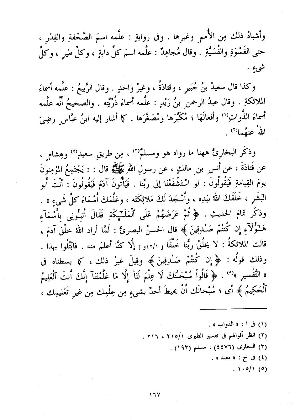 وَكَذَا قَالَ سَعِيدُ بْنُ جُبَيْرٍ، وَقَتَادَةُ، وَغَيْرُ وَاحِدٍ. وَقَالَ الرَّبِيعُ: عَلَّمَهُ أَسْمَاءَ الْمَلَائِكَةِ. وَقَالَ عَبْدُ الرَّحْمَنِ بْنُ زَيْدٍ: عَلَّمَهُ أَسْمَاءَ ذُرِّيَّتِهِ. وَالصَّحِيحُ أَنَّهُ عَلَّمَهُ أَسْمَاءَ الذَّوَاتِ، وَأَفْعَالَهَا مُكَبَّرَهَا وَمُصَغَّرَهَا، كَمَا أَشَارَ إِلَيْهِ ابْنُ عَبَّاسٍ رَضِيَ اللَّهُ عَنْهُمَا، وَذَكَرَ الْبُخَارِيُّ هُنَا مَا رَوَاهُ هُوَ، وَمُسْلِمٌ مِنْ طَرِيقِ سَعِيدٍ، وَهِشَامٍ، عَنْ قَتَادَةَ، عَنْ أَنَسِ بْنِ مَالِكٍ، عَنْ رَسُولِ اللَّهِ صَلَّى اللَّهُ عَلَيْهِ وَسَلَّمَ قَالَ: «يَجْتَمِعُ الْمُؤْمِنُونَ يَوْمَ الْقِيَامَةِ فَيَقُولُونَ لَوِ اسْتَشْفَعْنَا إِلَى رَبِّنَا فَيَأْتُونَ آدَمَ فَيَقُولُونَ أَنْتَ أَبُو الْبَشَرِ خَلَقَكَ اللَّهُ بِيَدِهِ، وَأَسْجَدَ لَكَ مَلَائِكَتَهُ، وَعَلَّمَكَ أَسْمَاءَ كُلِّ شَيْءٍ» . وَذَكَرَ تَمَامَ الْحَدِيثِ {ثُمَّ عَرَضَهُمْ عَلَى الْمَلَائِكَةِ فَقَالَ أَنْبِئُونِي بِأَسْمَاءِ هَؤُلَاءِ إِنْ كُنْتُمْ صَادِقِينَ} [البقرة: 31] . قَالَ الْحَسَنُ الْبَصْرِيُّ لَمَّا أَرَادَ اللَّهُ خَلْقَ آدَمَ، قَالَتِ الْمَلَائِكَةُ: لَا يَخْلُقُ رَبُّنَا خَلْقًا إِلَّا كُنَّا أَعْلَمَ مِنْهُ. فَابْتُلُوا بِهَذَا. وَذَلِكَ قَوْلُهُ: {إِنْ كُنْتُمْ صَادِقِينَ} [البقرة: 23] . وَقِيلَ: غَيْرُ ذَلِكَ، كَمَا بَسَطْنَاهُ فِي التَّفْسِيرِ {قَالُوا سُبْحَانَكَ لَا عِلْمَ لَنَا إِلَّا مَا عَلَّمْتَنَا إِنَّكَ أَنْتَ الْعَلِيمُ الْحَكِيمُ} [البقرة: 32] . أَيْ: سُبْحَانَكَ أَنْ يُحِيطَ أَحَدٌ بِشَيْءٍ مِنْ عِلْمِكَ مِنْ غَيْرِ تَعْلِيمِكَ،