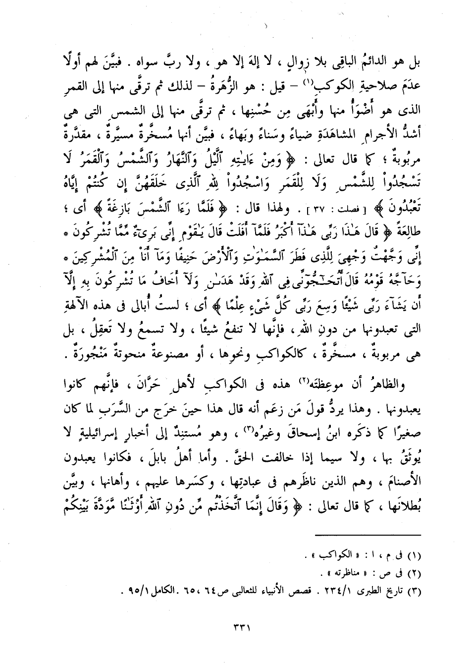 وَالظَّاهِرُ أَنَّ مَوْعِظَتَهُ هَذِهِ فِي الْكَوَاكِبِ لِأَهْلِ حَرَّانَ فَإِنَّهُمْ كَانَ يَعْبُدُونَهَا، وَهَذَا يَرُدُّ قَوْلَ مَنْ زَعَمَ أَنَّهُ قَالَ هَذَا حِينَ خَرَجَ مِنَ السَّرَبِ لَمَّا كَانَ صَغِيرًا، كَمَا ذَكَرَهُ ابْنُ إِسْحَاقَ وَغَيْرُهُ، وَهُوَ مُسْتَنِدٌ إِلَى أَخْبَارٍ إِسْرَائِيلِيَّةٍ لَا يُوثَقُ بِهَا، وَلَا سِيَّمَا إِذَا خَالَفَتِ الْحَقَّ، وَأَمَّا أَهْلُ بَابِلَ فَكَانُوا يَعْبُدُونَ الْأَصْنَامَ، وَهُمُ الَّذِينَ نَاظَرَهُمْ فِي عِبَادَتِهَا، وَكَسَرَهَا عَلَيْهِمْ وَأَهَانَهَا وَبَيَّنَ بُطْلَانَهَا، كَمَا قَالَ تَعَالَى: {وَقَالَ إِنَّمَا اتَّخَذْتُمْ مِنْ دُونِ اللَّهِ أَوْثَانًا مَوَدَّةَ بَيْنِكُمْ فِي الْحَيَاةِ الدُّنْيَا ثُمَّ يَوْمَ الْقِيَامَةِ يَكْفُرُ بَعْضُكُمْ بِبَعْضٍ وَيَلْعَنُ بَعْضُكُمْ بَعْضًا وَمَأْوَاكُمُ النَّارُ وَمَا لَكُمْ مِنْ نَاصِرِينَ} [العنكبوت: 25] .