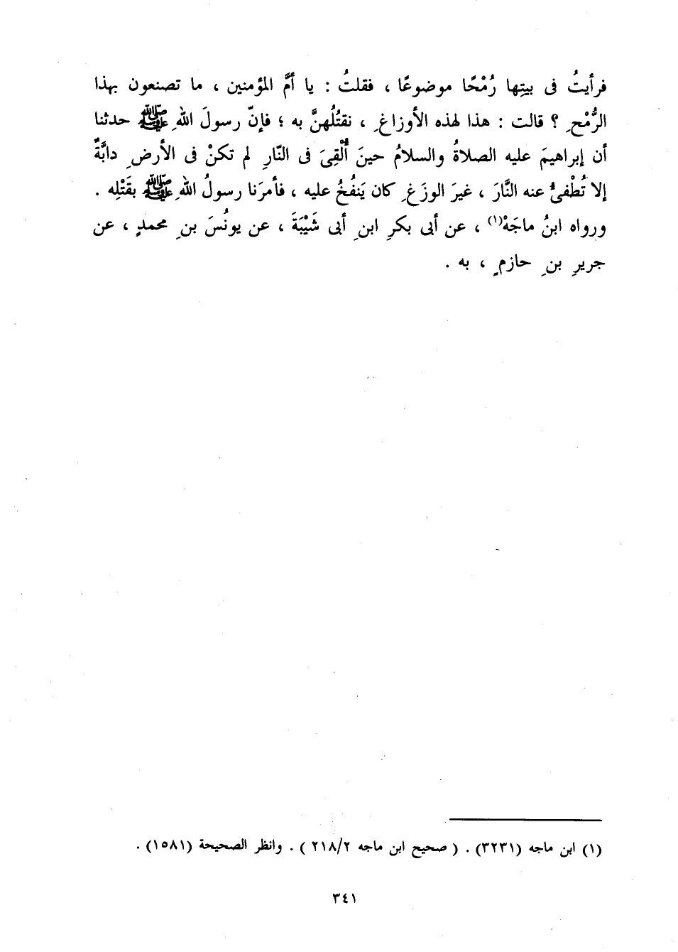 فَرَأَيْتُ فِي بَيْتِهَا رُمْحًا مَوْضُوعًا فَقُلْتُ: يَا أُمَّ الْمُؤْمِنِينَ مَا تَصْنَعِينَ بِهَذَا الرُّمْحِ؟ قَالَتْ: هَذَا لِهَذِهِ الْأَوْزَاغِ نَقْتُلُهُنَّ بِهِ فَإِنَّ رَسُولَ اللَّهِ صَلَّى اللَّهُ عَلَيْهِ وَسَلَّمَ، حَدَّثَنَا «أَنَّ إِبْرَاهِيمَ حِينَ أُلْقِيَ فِي النَّارِ لَمْ تَكُنْ فِي الْأَرْضِ دَابَّةٌ إِلَّا تُطْفِئُ عَنْهُ النَّارَ غَيْرَ الْوَزَغِ كَانَ يَنْفُخُ عَلَيْهِ» . فَأَمَرَنَا رَسُولُ اللَّهِ صَلَّى اللَّهُ عَلَيْهِ وَسَلَّمَ بِقَتْلِهِ. وَرَوَاهُ ابْنُ مَاجَهْ، عَنْ أَبِي بَكْرِ بْنِ أَبِي شَيْبَةَ، عَنْ يُونُسَ بْنِ مُحَمَّدٍ، عَنْ جَرِيرِ بْنِ حَازِمٍ بِهِ.