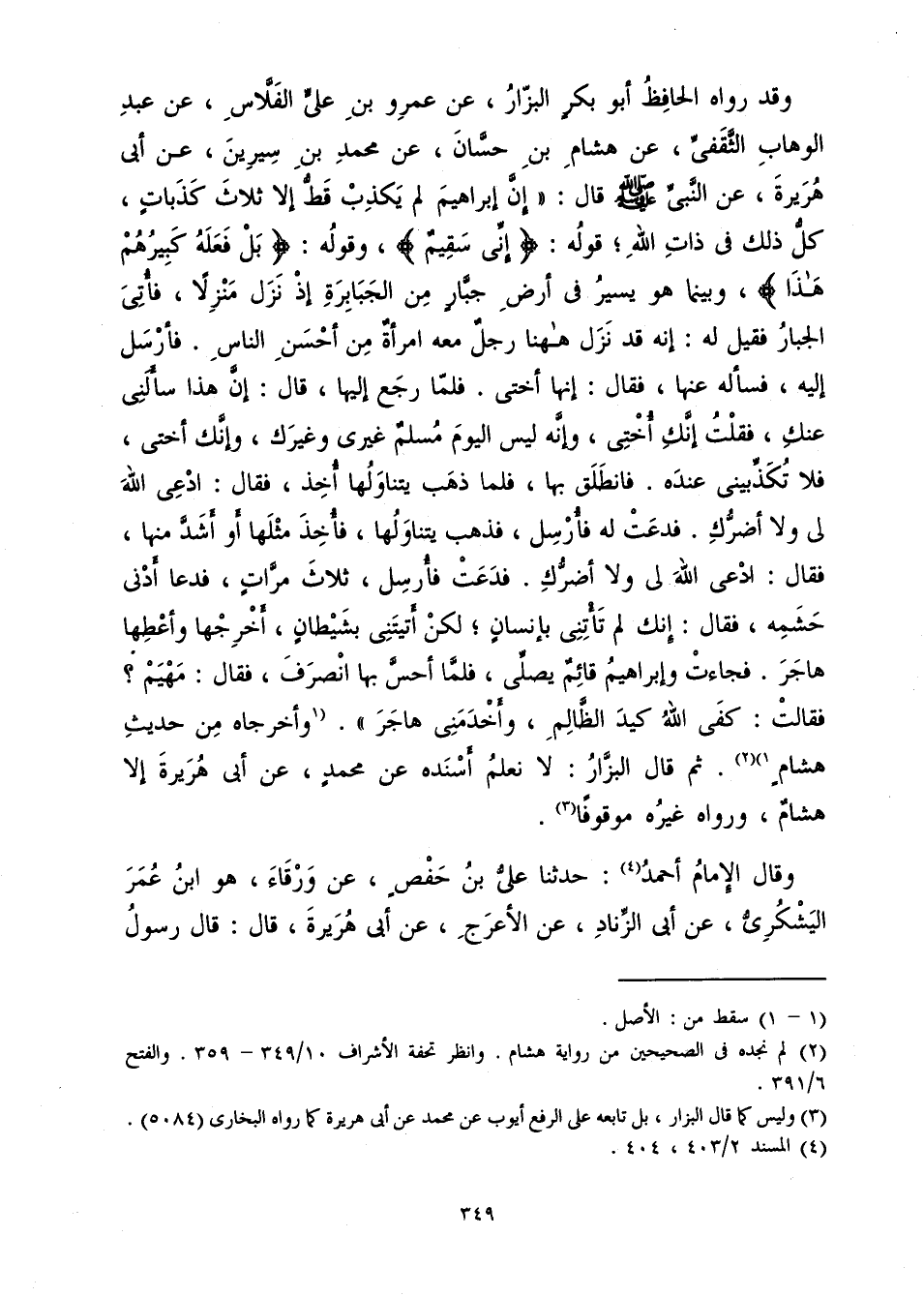 وَقَدْ رَوَاهُ الْحَافِظُ أَبُو بَكْرٍ الْبَزَّارُ، عَنْ عَمْرِو بْنِ عَلِيٍّ الْفَلَّاسِ، عَنْ عَبْدِ الْوَهَّابِ الثَّقَفِيِّ، عَنْ هِشَامِ بْنِ حَسَّانَ، عَنْ مُحَمَّدِ بْنِ سِيرِينَ، عَنْ أَبِي هُرَيْرَةَ، عَنِ النَّبِيِّ صَلَّى اللَّهُ عَلَيْهِ وَسَلَّمَ قَالَ: «إِنَّ إِبْرَاهِيمَ لَمْ يَكْذِبْ قَطُّ إِلَّا ثَلَاثَ كَذَبَاتٍ كُلُّ ذَلِكَ فِي ذَاتِ اللَّهِ: قَوْلُهُ: إِنِّي سَقِيمٌ. وَقَوْلُهُ: بَلْ فَعَلَهُ كَبِيرُهُمْ هَذَا. وَبَيْنَمَا هُوَ يَسِيرُ فِي أَرْضِ جَبَّارٍ مِنَ الْجَبَابِرَةِ إِذْ نَزَلَ مَنْزِلًا، فَأُتِيَ الْجَبَّارُ، فَقِيلَ لَهُ: إِنَّهُ قَدْ نَزَلَ هَاهُنَا رَجُلٌ مَعَهُ امْرَأَةٌ مِنْ أَحْسَنِ النَّاسِ، فَأَرْسَلَ إِلَيْهِ فَسَأَلَهُ عَنْهَا، فَقَالَ: إِنَّهَا أُخْتِي، فَلَمَّا رَجَعَ إِلَيْهَا قَالَ: إِنَّ هَذَا سَأَلَنِي عَنْكِ فَقُلْتُ: إِنَّكِ أُخْتِي، وَإِنَّهُ لَيْسَ الْيَوْمَ مُسْلِمٌ غَيْرِي وَغَيْرَكِ، وَإِنَّكِ أُخْتِي فَلَا تُكَذِّبِينِي عِنْدَهُ، فَانْطُلِقَ بِهَا، فَلَمَّا ذَهَبَ يَتَنَاوَلُهَا أُخِذَ، فَقَالَ: ادْعِي اللَّهَ لِي، وَلَا أَضُرُّكِ فَدَعَتْ لَهُ فَأُرْسِلَ فَذَهَبَ يَتَنَاوَلُهَا فَأُخِذَ مِثْلَهَا أَوْ أَشَدَّ مِنْهَا فَقَالَ: ادْعِي اللَّهَ لِي، وَلَا أَضُرُّكِ. فَدَعَتْ فَأُرْسِلَ ثَلَاثَ مَرَّاتٍ، فَدَعَا أَدْنَى حَشَمِهِ فَقَالَ: إِنَّكَ لَمْ تَأْتِنِي بِإِنْسَانٍ، وَلَكِنْ أَتَيْتَنِي بِشَيْطَانٍ أَخْرِجْهَا، وَأَعْطِهَا هَاجَرَ. فَجَاءَتْ وَإِبْرَاهِيمُ قَائِمٌ يُصَلِّي، فَلَمَّا أَحَسَّ بِهَا انْصَرَفَ، فَقَالَ: مَهْيَمْ؟ فَقَالَتْ: كَفَى اللَّهُ كَيْدَ الظَّالِمِ، وَأَخْدَمَنِي هَاجَرَ» . وَأَخْرَجَاهُ مِنْ حَدِيثِ هِشَامٍ. ثُمَّ قَالَ الْبَزَّارُ: لَا نَعْلَمُ أَسْنَدَهُ عَنْ مُحَمَّدٍ، عَنْ أَبِي هُرَيْرَةَ إِلَّا هِشَامٌ. وَرَوَاهُ غَيْرُهُ مَوْقُوفًا.
