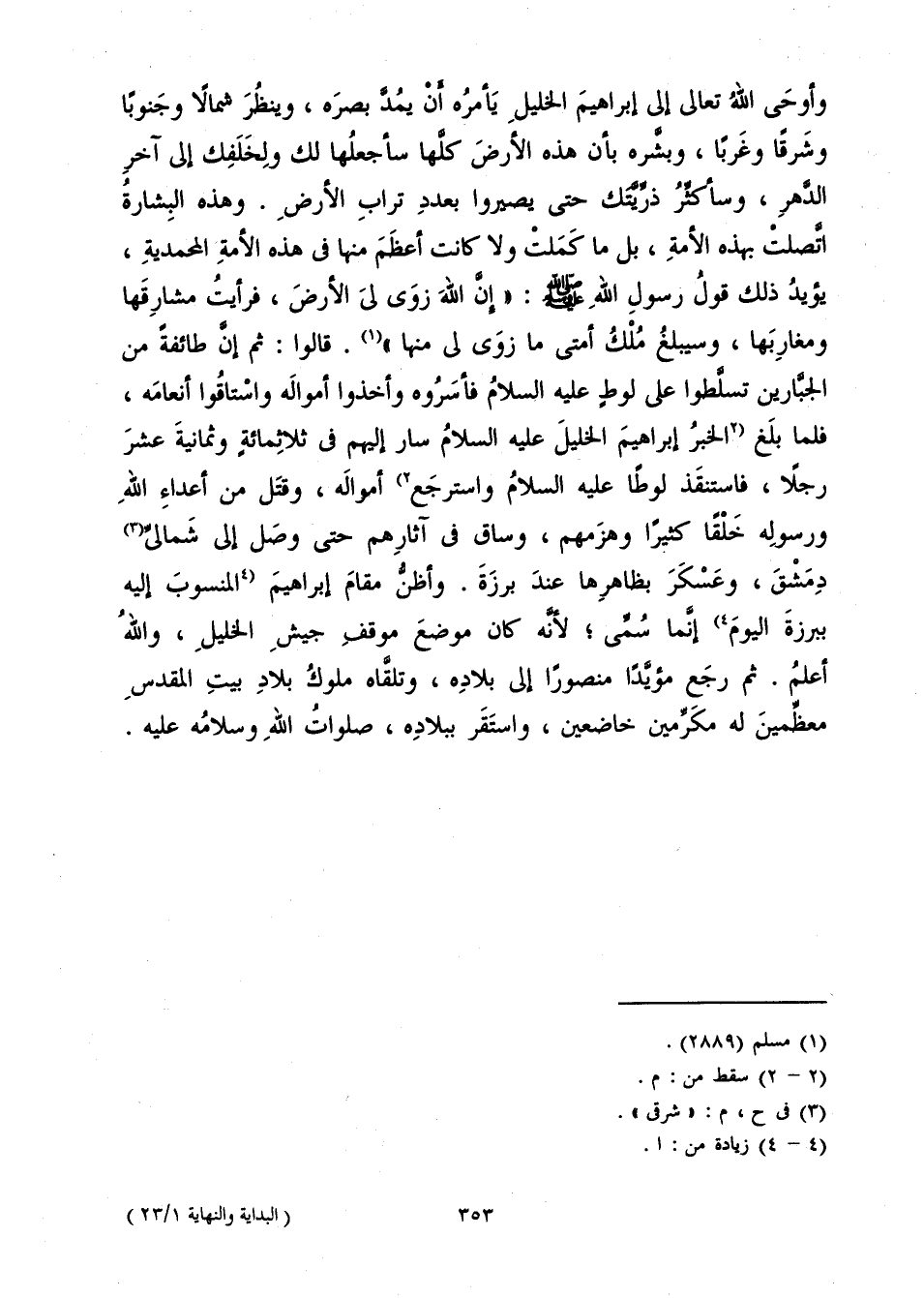 وَأَوْحَى اللَّهُ تَعَالَى إِلَى إِبْرَاهِيمَ الْخَلِيلِ يَأْمُرُهُ أَنْ يَمُدَّ بَصَرَهُ، وَيَنْظُرَ شَمَالًا وَجَنُوبًا وَشَرْقًا وَغَرْبًا، وَبَشَّرَهُ بِأَنَّ هَذِهِ الْأَرْضَ كُلَّهَا سَأَجْعَلُهَا لَكَ، وَلِخَلَفِكَ إِلَى آخِرِ الدَّهْرِ، وَسَأُكْثِرُ ذُرِّيَّتَكَ حَتَّى يَصِيرُوا بِعَدَدِ تُرَابِ الْأَرْضِ، وَهَذِهِ الْبِشَارَةُ اتَّصَلَتْ بِهَذِهِ الْأُمَّةِ، بَلْ مَا كَمَلَتْ وَلَا كَانَتْ أَعْظَمَ مِنْهَا فِي هَذِهِ الْأُمَّةِ الْمُحَمَّدِيَّةِ، يُؤَيِّدُ ذَلِكَ قَوْلُ رَسُولِ اللَّهِ صَلَّى اللَّهُ عَلَيْهِ وَسَلَّمَ: «إِنَّ اللَّهَ زَوَى لِيَ الْأَرْضَ فَرَأَيْتُ مَشَارِقَهَا وَمَغَارِبَهَا، وَسَيَبْلُغُ مُلْكُ أُمَّتِي مَا زَوَى لِي مِنْهَا» . قَالُوا: ثُمَّ إِنَّ طَائِفَةً مِنَ الْجَبَّارِينَ تَسَلَّطُوا عَلَى لُوطٍ عَلَيْهِ السَّلَامُ فَأَسَرُوهُ، وَأَخَذُوا أَمْوَالَهُ وَاسْتَاقُوا أَنْعَامَهُ، فَلَمَّا بَلَغَ الْخَبَرُ إِبْرَاهِيمَ الْخَلِيلَ عَلَيْهِ السَّلَامُ سَارَ إِلَيْهِمْ فِي ثَلَاثِمِائَةٍ وَثَمَانِيَةَ عَشَرَ رَجُلًا، فَاسْتَنْقَذَ لُوطًا عَلَيْهِ السَّلَامُ وَاسْتَرْجَعَ أَمْوَالَهُ، وَقَتَلَ مِنْ أَعْدَاءِ اللَّهِ وَرَسُولِهِ خَلْقًا كَثِيرًا وَهَزَمَهُمْ، وَسَاقَ فِي آثَارِهِمْ حَتَّى وَصَلَ إِلَى شَمَالِيِّ دِمَشْقَ، وَعَسْكَرَ بِظَاهِرِهَا عِنْدَ بَرْزَةَ، وَأَظُنُّ مَقَامَ إِبْرَاهِيمَ الْمَنْسُوبَ إِلَيْهِ بِبَرْزَةَ الْيَوْمَ إِنَّمَا سُمِّيَ؛ لِأَنَّهُ كَانَ مَوْضِعَ مَوْقِفِ جَيْشِ الْخَلِيلِ، وَاللَّهُ أَعْلَمُ. ثُمَّ رَجَعَ مُؤَيَّدًا مَنْصُورًا إِلَى بِلَادِهِ، وَتَلَقَّاهُ مُلُوكُ بِلَادِ بَيْتِ الْمَقْدِسِ مُعَظِّمِينَ لَهُ مُكْرِمِينَ خَاضِعِينَ، وَاسْتَقَرَّ بِبِلَادِهِ صَلَوَاتُ اللَّهِ وَسَلَامُهُ عَلَيْهِ.