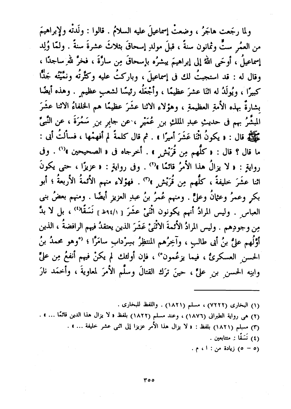 وَلَمَّا رَجَعَتْ هَاجَرُ وَضَعَتْ إِسْمَاعِيلَ عَلَيْهِ السَّلَامُ قَالُوا: وَلَدَتْهُ وَلِإِبْرَاهِيمَ مِنَ الْعُمُرِ سِتٌّ وَثَمَانُونَ سَنَةً قَبْلَ مَوْلِدِ إِسْحَاقَ بِثَلَاثَ عَشْرَةَ سَنَةً. وَلَمَّا وُلِدَ إِسْمَاعِيلُ أَوْحَى اللَّهُ إِلَى إِبْرَاهِيمَ يُبَشِّرُهُ بِإِسْحَاقَ مِنْ سَارَةَ فَخَرَّ لِلَّهِ سَاجِدًا. وَقَالَ لَهُ: قَدِ اسْتَجَبْتُ لَكَ فِي إِسْمَاعِيلَ، وَبَارَكْتُ عَلَيْهِ وَكَثَّرْتُهُ وَنَمَّيْتُهُ جَدًّا كَبِيرًا، وَيُولَدُ لَهُ اثْنَا عَشَرَ عَظِيمًا، وَأَجْعَلُهُ رَئِيسًا لِشَعْبٍ عَظِيمٍ. وَهَذِهِ أَيْضًا بِشَارَةٌ بِهَذِهِ الْأُمَّةِ الْعَظِيمَةِ، وَهَؤُلَاءِ الِاثْنَا عَشَرَ عَظِيمًا هُمُ الْخُلَفَاءُ الِاثْنَا عَشَرَ الْمُبَشَّرُ بِهِمْ فِي حَدِيثِ عَبْدِ الْمَلِكِ بْنِ عُمَيْرٍ، عَنْ جَابِرِ بْنِ سَمُرَةَ، عَنِ النَّبِيِّ صَلَّى اللَّهُ عَلَيْهِ وَسَلَّمَ قَالَ: «يَكُونُ اثْنَا عَشَرَ أَمِيرًا» . ثُمَّ قَالَ: كَلِمَةٌ لَمْ أَفْهَمْهَا فَسَأَلْتُ أَبِي مَا قَالَ؟ قَالَ: «كُلُّهُمْ مِنْ قُرَيْشٍ» . أَخْرَجَاهُ فِي الصَّحِيحَيْنِ، وَفِي رِوَايَةٍ «لَا يَزَالُ هَذَا الْأَمْرُ قَائِمًا» . وَفِي رِوَايَةٍ «عَزِيزًا حَتَّى يَكُونَ اثْنَا عَشَرَ خَلِيفَةً كُلُّهُمْ مِنْ قُرَيْشٍ» . فَهَؤُلَاءِ مِنْهُمُ الْأَئِمَّةُ الْأَرْبَعَةُ؛ أَبُو بَكْرٍ، وَعُمَرُ، وَعُثْمَانُ، وَعَلِيٌّ، وَمِنْهُمْ عُمَرُ بْنُ عَبْدِ الْعَزِيزِ أَيْضًا، وَمِنْهُمْ بَعْضُ بَنِي الْعَبَّاسِ، وَلَيْسَ الْمُرَادُ أَنَّهُمْ يَكُونُونَ اثْنَيْ عَشَرَ نَسَقًا، بَلْ لَا بُدَّ مِنْ وُجُودِهِمْ، وَلَيْسَ الْمُرَادُ الْأَئِمَّةَ الِاثْنَيْ عَشَرَ الَّذِي يَعْتَقِدُ فِيهِمْ الرَّافِضَةُ الَّذِينَ أَوَّلُهُمْ عَلِيُّ بْنُ أَبِي طَالِبٍ، وَآخِرُهُمُ الْمُنْتَظِرُ بِسِرْدَابِ سَامَرَّا، وَهُوَ مُحَمَّدُ بْنُ الْحَسَنِ الْعَسْكَرِيُّ فِيمَا يَزْعُمُونَ، فَإِنَّ أُولَئِكَ لَمْ يَكُنْ فِيهِمْ أَنْفَعُ مِنْ عَلِيٍّ وَابْنِهِ الْحَسَنِ بْنِ عَلِيٍّ حِينَ تَرَكَ الْقِتَالَ وَسَلَّمَ الْأَمْرَ لِمُعَاوِيَةَ، وَأَخْمَدَ نَارَ