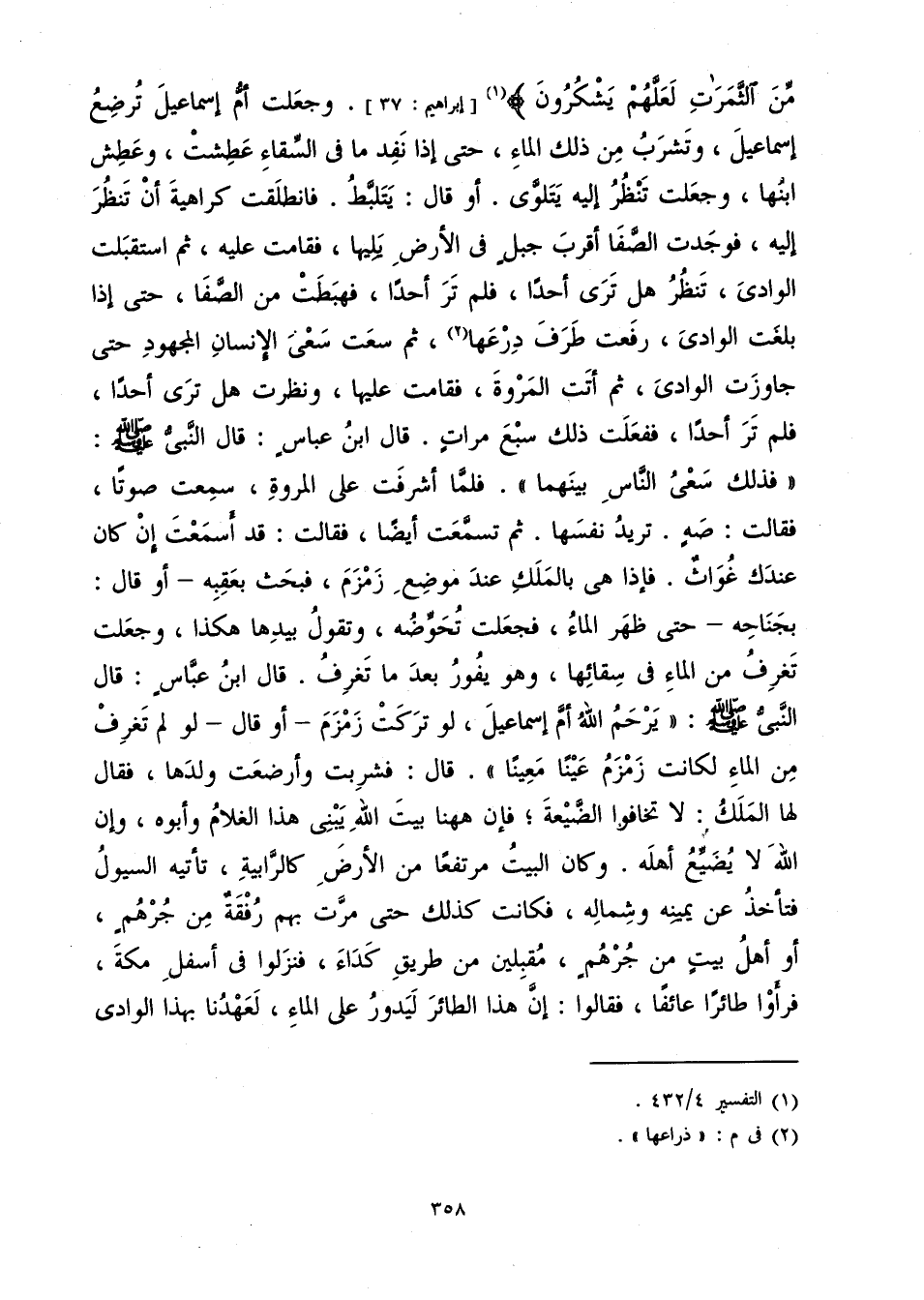 وَجَعَلَتْ أُمُّ إِسْمَاعِيلَ تُرْضِعُ إِسْمَاعِيلَ، وَتَشْرَبُ مِنْ ذَلِكَ الْمَاءِ حَتَّى إِذَا نَفَذَ مَا فِي السِّقَاءِ عَطِشَتْ وَعَطِشَ ابْنُهَا، وَجَعَلَتْ تَنْظُرُ إِلَيْهِ يَتَلَوَّى. أَوْ قَالَ: يَتَلَبَّطُ فَانْطَلَقَتْ كَرَاهِيَةَ أَنْ تَنْظُرَ إِلَيْهِ فَوَجَدَتِ الصَّفَا أَقْرَبَ جَبَلٍ فِي الْأَرْضِ يَلِيهَا فَقَامَتْ عَلَيْهِ، ثُمَّ اسْتَقْبَلَتِ الْوَادِيَ تَنْظُرُ هَلْ تَرَى أَحَدًا فَلَمْ تَرَ أَحَدًا فَهَبَطَتْ مِنَ الصَّفَا حَتَّى إِذَا بَلَغَتِ الْوَادِيَ رَفَعَتْ طَرَفَ دِرْعِهَا، ثُمَّ سَعَتْ سَعْيَ الْإِنْسَانِ الْمَجْهُودِ حَتَّى إِذَا جَاوَزَتِ الْوَادِيَ، ثُمَّ أَتَتِ الْمَرْوَةَ فَقَامَتْ عَلَيْهَا وَنَظَرَتْ هَلْ تَرَى أَحَدًا فَلَمْ تَرَ أَحَدًا، فَفَعَلَتْ ذَلِكَ سَبْعَ مَرَّاتٍ، قَالَ ابْنُ عَبَّاسٍ: قَالَ النَّبِيُّ صَلَّى اللَّهُ عَلَيْهِ وَسَلَّمَ: «فَذَلِكَ سَعْيُ النَّاسِ بَيْنَهُمَا» . فَلَمَّا أَشْرَفَتْ عَلَى الْمَرْوَةِ سَمِعَتْ صَوْتًا فَقَالَتْ: صَهٍ. تُرِيدُ نَفْسَهَا، ثُمَّ تَسَمَّعَتْ فَسَمِعَتْ أَيْضًا فَقَالَتْ: قَدْ أَسْمَعْتَ إِنْ كَانَ عِنْدَكَ غُوَاثٌ. فَإِذَا هِيَ بِالْمَلَكِ عِنْدَ مَوْضِعِ زَمْزَمَ، فَبَحَثَ بِعَقِبِهِ أَوْ قَالَ بِجَنَاحِهِ حَتَّى ظَهَرَ الْمَاءُ، فَجَعَلَتْ تَخُوضُهُ وَتَقُولُ بِيَدِهَا هَكَذَا، وَجَعَلَتْ تَغْرِفُ مِنَ الْمَاءِ فِي سِقَائِهَا، وَهُوَ يَفُورُ بَعْدَ مَا تَغْرِفُ. قَالَ ابْنُ عَبَّاسٍ: قَالَ النَّبِيُّ صَلَّى اللَّهُ عَلَيْهِ وَسَلَّمَ: «يَرْحَمُ اللَّهُ أُمَّ إِسْمَاعِيلَ، لَوْ تَرَكَتْ زَمْزَمَ» . أَوْ قَالَ: «لَوْ لَمْ تَغْرِفْ مِنَ الْمَاءِ لَكَانَتْ زَمْزَمُ عَيْنًا مَعِينًا» . قَالَ: فَشَرِبَتْ وَأَرْضَعَتْ وَلَدَهَا فَقَالَ لَهَا الْمَلَكُ: لَا تَخَافِي الضَّيْعَةَ فَإِنَّ هَاهُنَا بَيْتَ اللَّهِ يَبْنِي هَذَا الْغُلَامُ وَأَبُوهُ، وَإِنَّ اللَّهَ لَا يُضَيِّعُ أَهْلَهُ، وَكَانَ الْبَيْتُ مُرْتَفِعًا مِنَ الْأَرْضِ كَالرَّابِيَةِ تَأْتِيهِ السُّيُولُ فَتَأْخُذُ عَنْ يَمِينِهِ وَعَنْ شِمَالِهِ، فَكَانَتْ كَذَلِكَ حَتَّى مَرَّتْ بِهِمْ رُفْقَةٌ مِنْ جُرْهُمٍ أَوْ أَهْلُ بَيْتٍ مِنْ جُرْهُمٍ مُقْبِلِينَ مِنْ طَرِيقِ كَدَاءَ، فَنَزَلُوا فِي أَسْفَلِ مَكَّةَ فَرَأَوْا طَائِرًا عَائِفًا، فَقَالُوا: إِنَّ هَذَا الطَّائِرَ لَيَدُورُ عَلَى الْمَاءِ، لَعَهْدُنَا بِهَذَا الْوَادِي،