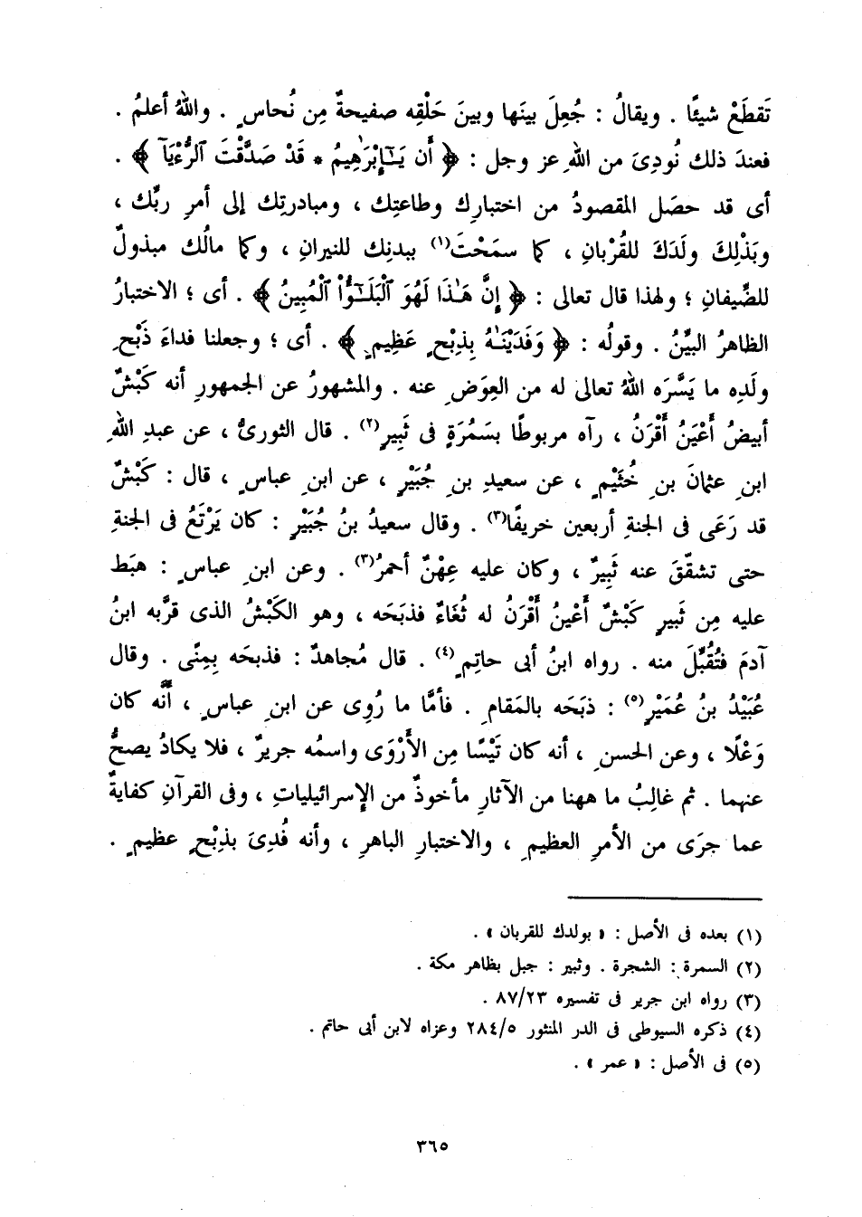 تَقْطَعْ شَيْئًا. وَيُقَالُ: جُعِلَ بَيْنَهَا وَبَيْنَ حَلْقِهِ صَفِيحَةٌ مِنْ نُحَاسٍ. وَاللَّهُ أَعْلَمُ. فَعِنْدَ ذَلِكَ نُودِيَ مِنَ اللَّهِ عَزَّ وَجَلَّ: {أَنْ يَا إِبْرَاهِيمُ قَدْ صَدَّقْتَ الرُّؤْيَا} [الصافات: 104] . أَيْ قَدْ حَصَلَ الْمَقْصُودُ مِنِ اخْتِبَارِكِ وَطَاعَتِكَ وَمُبَادَرَتِكَ إِلَى أَمْرِ رَبِّكَ وَبَذْلِكَ وَلَدَكَ لِلْقُرْبَانِ، كَمَا سَمَحْتَ بِبَدَنِكَ لِلنِّيرَانِ، وَكَمَا مَالُكَ مَبْذُولٌ لِلضِّيفَانِ؛ وَلِهَذَا قَالَ تَعَالَى: {إِنَّ هَذَا لَهُوَ الْبَلَاءُ الْمُبِينُ} [الصافات: 106] . أَيِ الِاخْتِبَارُ الظَّاهِرُ الْبَيِّنُ. وَقَوْلُهُ: {وَفَدَيْنَاهُ بِذِبْحٍ عَظِيمٍ} [الصافات: 107] . أَيْ وَجَعَلْنَا فِدَاءَ ذَبْحِ وَلَدِهِ مَا يَسَّرَهُ اللَّهُ تَعَالَى لَهُ مِنَ الْعِوَضِ عَنْهُ، وَالْمَشْهُورُ عَنِ الْجُمْهُورِ أَنَّهُ كَبْشٌ أَبْيَضُ أَعْيَنُ أَقْرَنُ رَآهُ مَرْبُوطًا بِسَمُرَةٍ فِي ثَبِيرٍ. قَالَ الثَّوْرِيُّ: عَنْ عَبْدِ اللَّهِ بْنِ عُثْمَانَ بْنِ خُثَيْمٍ، عَنْ سَعِيدِ بْنِ جُبَيْرٍ، عَنِ ابْنِ عَبَّاسٍ قَالَ: كَبْشٌ قَدْ رَعَى فِي الْجَنَّةِ أَرْبَعِينَ خَرِيفًا. وَقَالَ سَعِيدُ بْنُ جُبَيْرٍ: كَانَ يَرْتَعُ فِي الْجَنَّةِ حَتَّى تَشَقَّقَ عَنْهُ ثَبِيرٌ، وَكَانَ عَلَيْهِ عِهْنٌ أَحْمَرُ. وَعَنِ ابْنِ عَبَّاسٍ: هَبَطَ عَلَيْهِ مِنْ ثَبِيرٍ كَبْشٌ أَعْيَنُ أَقْرَنُ لَهُ ثُغَاءٌ فَذَبَحَهُ، وَهُوَ الْكَبْشُ الَّذِي قَرَّبَهُ ابْنُ آدَمَ فَتُقُبِّلَ مِنْهُ. رَوَاهُ ابْنُ أَبِي حَاتِمٍ. قَالَ مُجَاهِدٌ: فَذَبَحَهُ بِمِنًى. وَقَالَ عُبَيْدُ بْنُ عُمَيْرٍ: ذَبَحَهُ بِالْمَقَامِ. فَأَمَّا مَا رُوِيَ عَنِ ابْنِ عَبَّاسٍ أَنَّهُ كَانَ وَعْلًا، وَعَنِ الْحَسَنِ أَنَّهُ كَانَ تَيْسًا مِنَ الْأَرْوَى وَاسْمُهُ جَرِيرٌ فَلَا يَكَادُ يَصِحُّ عَنْهُمَا، ثُمَّ غَالِبُ مَا هَاهُنَا مِنَ الْآثَارِ مَأْخُوذٌ مِنَ الْإِسْرَائِيلِيَّاتِ، وَفِي الْقُرْآنِ كِفَايَةٌ عَمَّا جَرَى مِنَ الْأَمْرِ الْعَظِيمِ وَالِاخْتِبَارِ الْبَاهِرِ وَأَنَّهُ فُدِيَ بِذِبْحٍ عَظِيمٍ.