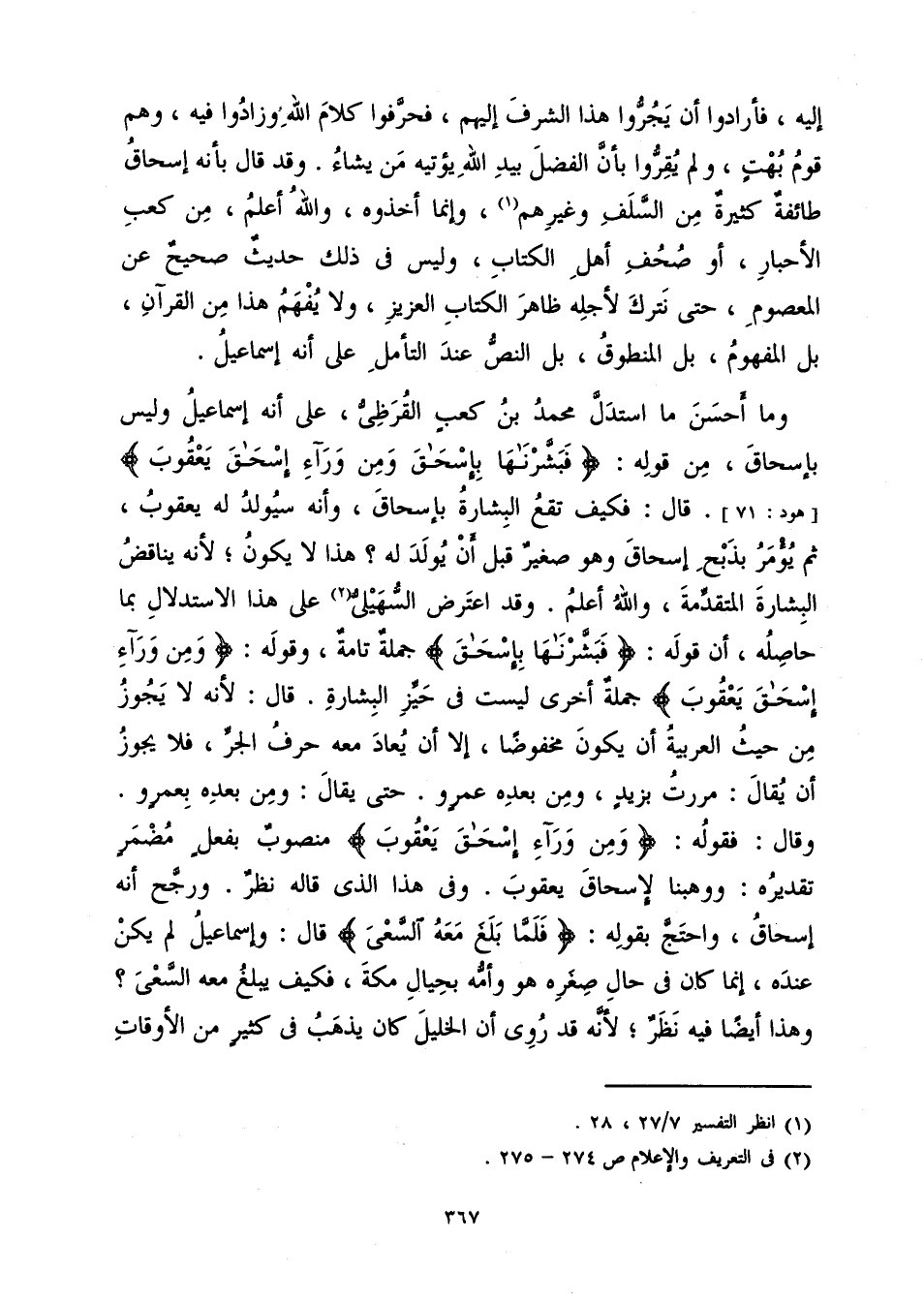 وَقَدِ اعْتَرَضَ السُّهَيْلِيُّ عَلَى هَذَا الِاسْتِدْلَالِ بِمَا حَاصِلُهُ أَنَّ قَوْلَهُ: {فَبَشَّرْنَاهَا بِإِسْحَاقَ} [هود: 71] جُمْلَةٌ تَامَّةٌ. وَقَوْلَهُ: {وَمِنْ وَرَاءِ إِسْحَاقَ يَعْقُوبَ} [هود: 71] . جُمْلَةٌ أُخْرَى لَيْسَتْ فِي حَيِّزِ الْبِشَارَةِ، قَالَ: لِأَنَّهُ لَا يَجُوزُ مِنْ حَيْثُ الْعَرَبِيَّةُ أَنْ يَكُونَ مَخْفُوضًا إِلَّا أَنْ يُعَادَ مَعَهُ حَرْفُ الْجَرِّ فَلَا يَجُوزُ أَنْ يُقَالَ مَرَرْتُ بِزَيْدٍ وَمِنْ بَعْدِهِ عَمْرٍو حَتَّى يُقَالَ وَمِنْ بَعْدِهِ بِعَمْرٍو. وَقَالَ فَقَوْلُهُ: {وَمِنْ وَرَاءِ إِسْحَاقَ يَعْقُوبَ} [هود: 71] . مَنْصُوبٌ بِفِعْلٍ مُضْمَرٍ تَقْدِيرُهُ وَوَهَبْنَا لِإِسْحَاقَ يَعْقُوبَ، وَفِي هَذَا الَّذِي قَالَهُ نَظَرٌ، وَرَجَّحَ أَنَّهُ إِسْحَاقُ وَاحْتَجَّ بِقَوْلِهِ: {فَلَمَّا بَلَغَ مَعَهُ السَّعْيَ} [الصافات: 102] . قَالَ: وَإِسْمَاعِيلُ لَمْ يَكُنْ عِنْدَهُ إِنَّمَا كَانَ فِي حَالِ صِغَرِهِ هُوَ وَأَمُّهُ بِحِيَالِ مَكَّةَ فَكَيْفَ يَبْلُغُ مَعَهُ السَّعْيَ؟ وَهَذَا أَيْضًا فِيهِ نَظَرٌ؛ لِأَنَّهُ قَدْ رُوِيَ أَنَّ الْخَلِيلَ كَانَ يَذْهَبُ فِي كَثِيرٍ مِنَ الْأَوْقَاتِ