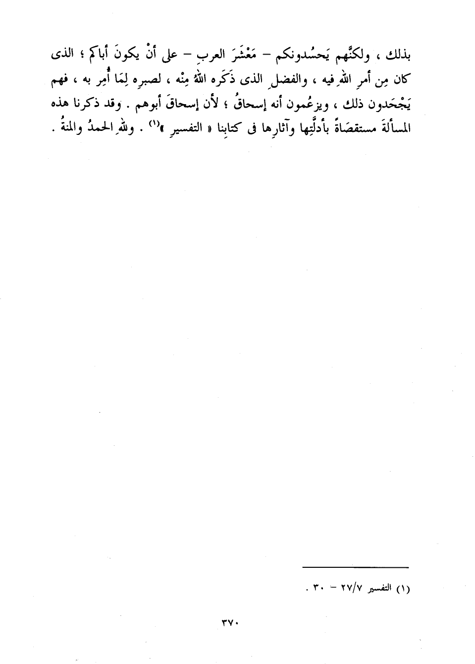 بِذَلِكَ، وَلَكِنَّهُمْ يَحْسُدُونَكُمْ مَعْشَرَ الْعَرَبِ عَلَى أَنْ يَكُونَ أَبَاكُمُ الَّذِي كَانَ مِنْ أَمْرِ اللَّهِ فِيهِ وَالْفَضْلِ الَّذِي ذَكَرَهُ اللَّهُ مِنْهُ لِصَبْرِهِ لِمَا أُمِرَ بِهِ، فَهُمْ يَجْحَدُونَ ذَلِكَ وَيَزْعُمُونَ أَنَّهُ إِسْحَاقُ؛ لِأَنَّ إِسْحَاقَ أَبُوهُمْ. وَقَدْ ذَكَرْنَا هَذِهِ الْمَسْأَلَةَ مُسْتَقْصَاةً بِأَدِلَّتِهَا، وَآثَارِهَا فِي كِتَابِنَا التَّفْسِيرِ، وَلِلَّهِ الْحَمْدُ وَالْمِنَّةُ.