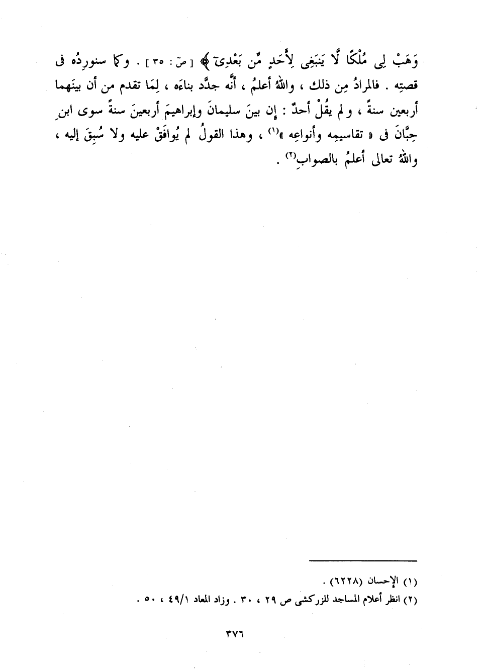 وَكَمَا سَنُورِدُهُ فِي قِصَّتِهِ فَالْمُرَادُ مِنْ ذَلِكَ، وَاللَّهُ أَعْلَمُ. أَنَّهُ جَدَّدَ بِنَاءَهُ، كَمَا تَقَدَّمَ مِنْ أَنَّ بَيْنَهُمَا أَرْبَعِينَ سَنَةً، وَلَمْ يَقُلْ أَحَدٌ إِنَّ بَيْنَ سُلَيْمَانَ وَإِبْرَاهِيمَ أَرْبَعِينَ سَنَةً سِوَى ابْنِ حِبَّانَ فِي تَقَاسِيمِهِ وَأَنْوَاعِهِ، وَهَذَا الْقَوْلُ لَمْ يُوَافَقْ عَلَيْهِ وَلَا سُبِقَ إِلَيْهِ.