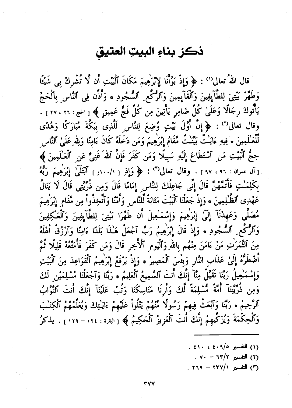 قَالَ اللَّهُ تَعَالَى: {وَإِذْ بَوَّأْنَا لِإِبْرَاهِيمَ مَكَانَ الْبَيْتِ أَنْ لَا تُشْرِكْ بِي شَيْئًا وَطَهِّرْ بَيْتِيَ لِلطَّائِفِينَ وَالْقَائِمِينَ وَالرُّكَّعِ السُّجُودِ وَأَذِّنْ فِي النَّاسِ بِالْحَجِّ يَأْتُوكَ رِجَالًا وَعَلَى كُلِّ ضَامِرٍ يَأْتِينَ مِنْ كُلِّ فَجٍّ عَمِيقٍ} [الحج: 26] . [الْحَجِّ: 26 - 27] . وَقَالَ تَعَالَى: {إِنَّ أَوَّلَ بَيْتٍ وُضِعَ لِلنَّاسِ لَلَّذِي بِبَكَّةَ مُبَارَكًا وَهُدًى لِلْعَالَمِينَ فِيهِ آيَاتٌ بَيِّنَاتٌ مَقَامُ إِبْرَاهِيمَ وَمَنْ دَخَلَهُ كَانَ آمِنًا وَلِلَّهِ عَلَى النَّاسِ حِجُّ الْبَيْتِ مَنِ اسْتَطَاعَ إِلَيْهِ سَبِيلًا وَمَنْ كَفَرَ فَإِنَّ اللَّهَ غَنِيٌّ عَنِ الْعَالَمِينَ} [آل عمران: 96]
