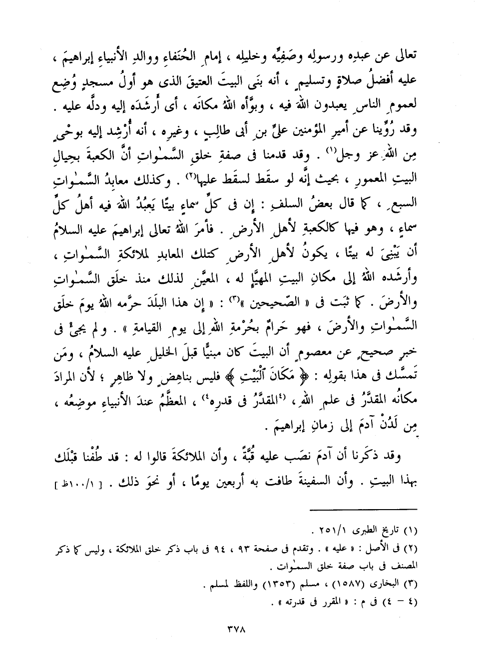 تَعَالَى عَنْ عَبْدِهِ وَرَسُولِهِ وَصَفِيِّهِ وَخَلِيلِهِ، إِمَامِ الْحُنَفَاءِ، وَوَالِدِ الْأَنْبِيَاءِ عَلَيْهِ أَفْضَلُ صَلَاةٍ وَتَسْلِيمٍ، أَنَّهُ بَنَى الْبَيْتَ الْعَتِيقَ الَّذِي هُوَ أَوَّلُ مَسْجِدٍ وُضِعَ لِعُمُومِ النَّاسِ يَعْبُدُونَ اللَّهَ فِيهِ، وَبَوَّأَهُ اللَّهُ مَكَانَهُ أَيْ أَرْشَدَهُ إِلَيْهِ وَدَلَّهُ عَلَيْهِ، وَقَدْ رُوِّينَا عَنْ أَمِيرِ الْمُؤْمِنِينَ عَلِيِّ بْنِ أَبِي طَالِبٍ وَغَيْرِهِ أَنَّهُ أُرْشِدَ إِلَيْهِ بِوَحْيٍ مِنَ اللَّهِ عَزَّ وَجَلَّ، وَقَدْ قَدَّمْنَا فِي صِفَةِ خَلْقِ السَّمَاوَاتِ أَنَّ الْكَعْبَةَ بِحِيَالِ الْبَيْتِ الْمَعْمُورِ بِحَيْثُ أَنَّهُ لَوْ سَقَطَ لَسَقَطَ عَلَيْهَا، وَكَذَلِكَ مَعَابِدُ السَّمَاوَاتِ السَّبْعِ، كَمَا قَالَ بَعْضُ السَّلَفِ: إِنَّ فِي كُلِّ سَمَاءٍ بَيْتًا يَعْبُدُ اللَّهَ فِيهِ أَهْلُ كُلِّ سَمَاءٍ وَهُوَ فِيهَا كَالْكَعْبَةِ لِأَهْلِ الْأَرْضِ فَأَمَرَ اللَّهُ تَعَالَى إِبْرَاهِيمَ عَلَيْهِ السَّلَامُ أَنْ يَبْنِيَ لَهُ بَيْتًا يَكُونُ لِأَهْلِ الْأَرْضِ كَتِلْكَ الْمَعَابِدِ لِمَلَائِكَةِ السَّمَاءِ، وَأَرْشَدَهُ اللَّهُ إِلَى مَكَانِ الْبَيْتِ الْمُهَيَّأِ لَهُ الْمُعَيَّنِ لِذَلِكَ مُنْذُ خَلَقَ السَّمَاوَاتِ وَالْأَرْضَ، كَمَا ثَبَتَ فِي الصَّحِيحَيْنِ «إِنَّ هَذَا الْبَلَدَ حَرَّمَهُ اللَّهُ يَوْمَ خَلَقَ السَّمَاوَاتِ وَالْأَرْضَ فَهُوَ حَرَامٌ بِحُرْمَةِ اللَّهِ إِلَى يَوْمِ الْقِيَامَةِ» . وَلَمْ يَجِئْ فِي خَبَرٍ صَحِيحٍ عَنْ مَعْصُومٍ أَنَّ الْبَيْتَ كَانَ مَبْنِيًّا قَبْلَ الْخَلِيلِ عَلَيْهِ السَّلَامُ وَمَنْ تَمَسَّكَ فِي هَذَا بِقَوْلِهِ: {مَكَانَ الْبَيْتِ} [الحج: 26] فَلَيْسَ بِنَاهِضٍ وَلَا ظَاهِرٍ؛ لِأَنَّ الْمُرَادَ مَكَانُهُ الْمُقَدَّرُ فِي عِلْمِ اللَّهِ، الْمُقَدَّرُ فِي قَدَرِهِ، الْمُعَظَّمُ عِنْدَ الْأَنْبِيَاءِ مَوْضِعُهُ مِنْ لَدُنْ آدَمَ إِلَى زَمَانِ إِبْرَاهِيمَ.