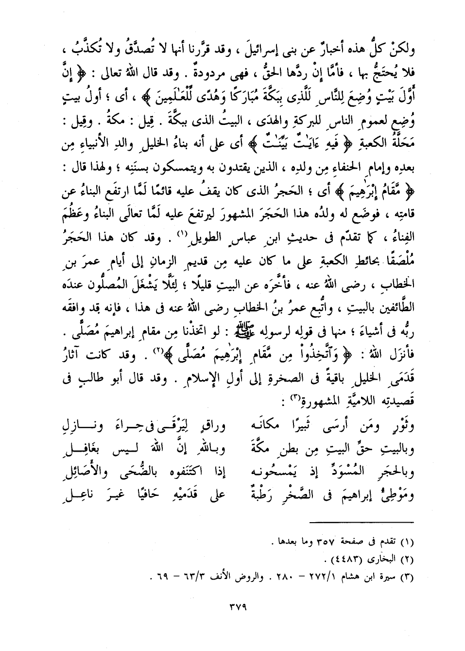وَلَكِنْ كُلُّ هَذِهِ الْأَخْبَارِ عَنْ بَنِي إِسْرَائِيلَ، وَقَدْ قَرَّرْنَا أَنَّهَا لَا تُصَدَّقُ وَلَا تُكَذَّبُ فَلَا يُحْتَجُّ بِهَا، فَأَمَّا إِنْ رَدَّهَا الْحَقُّ فَهِيَ مَرْدُودَةٌ، وَقَدْ قَالَ اللَّهُ: {إِنَّ أَوَّلَ بَيْتٍ وُضِعَ لِلنَّاسِ لَلَّذِي بِبَكَّةَ مُبَارَكًا وَهُدًى لِلْعَالَمِينَ} [آل عمران: 96] . أَيْ أَوَّلُ بَيْتٍ وُضِعَ لِعُمُومِ النَّاسِ لِلْبَرَكَةِ وَالْهُدَى الْبَيْتُ الَّذِي بِبَكَّةَ قِيلَ: مَكَّةُ. وَقِيلَ: مَحَلَّةُ الْكَعْبَةِ {فِيهِ آيَاتٌ بَيِّنَاتٌ} [آل عمران: 97] . أَيْ عَلَى أَنَّهُ بِنَاءُ الْخَلِيلِ وَالِدِ الْأَنْبِيَاءِ مِنْ بَعْدِهِ وَإِمَامِ الْحُنَفَاءِ مِنْ وَلَدِهِ الَّذِينَ يَقْتَدُونَ بِهِ. وَيَتَمَسَّكُونَ بِسُنَّتِهِ؛ وَلِهَذَا قَالَ: {مَقَامُ إِبْرَاهِيمَ} [آل عمران: 97] أَيِ: الْحَجَرُ الَّذِي كَانَ يَقِفُ عَلَيْهِ قَائِمًا لَمَّا ارْتَفَعَ الْبِنَاءُ عَنْ قَامَتِهِ فَوَضَعَ لَهُ وَلَدُهُ هَذَا الْحَجَرَ الْمَشْهُورَ لِيَرْتَفِعَ عَلَيْهِ لَمَّا تَعَالَى الْبِنَاءُ وَعَظُمَ الْفِنَاءُ، كَمَا تَقَدَّمَ فِي حَدِيثِ ابْنِ عَبَّاسٍ الطَّوِيلِ، وَقَدْ كَانَ هَذَا الْحَجَرُ مُلْصَقًا بِحَائِطِ الْكَعْبَةِ عَلَى مَا كَانَ عَلَيْهِ مِنْ قَدِيمِ الزَّمَانِ إِلَى أَيَّامِ عُمَرَ بْنِ الْخَطَّابِ رَضِيَ اللَّهُ عَنْهُ فَأَخَّرَهُ عَنِ الْبَيْتِ قَلِيلًا لِئَلَّا يَشْغَلَ الْمُصَلُّونَ عِنْدَهُ الطَّائِفِينَ بِالْبَيْتِ، وَاتَّبَعَ عُمَرُ بْنُ الْخَطَّابِ رَضِيَ اللَّهُ عَنْهُ فِي هَذَا، فَإِنَّهُ قَدْ وَافَقَهُ رَبُّهُ فِي أَشْيَاءَ مِنْهَا؛ فِي قَوْلِهِ لِرَسُولِهِ صَلَّى اللَّهُ عَلَيْهِ وَسَلَّمَ: لَوِ اتَّخَذْنَا مِنْ مَقَامِ إِبْرَاهِيمَ مُصَلًّى. فَأَنْزَلَ اللَّهُ {وَاتَّخِذُوا مِنْ مَقَامِ إِبْرَاهِيمَ مُصَلًّى} [البقرة: 125] وَقَدْ كَانَتْ آثَارُ قَدَمَيِ الْخَلِيلِ بَاقِيَةً فِي الصَّخْرَةِ إِلَى أَوَّلِ الْإِسْلَامِ، وَقَدْ قَالَ أَبُو طَالِبٍ فِي قَصِيدَتِهِ اللَّامِيَّةِ الْمَشْهُورَةِ: