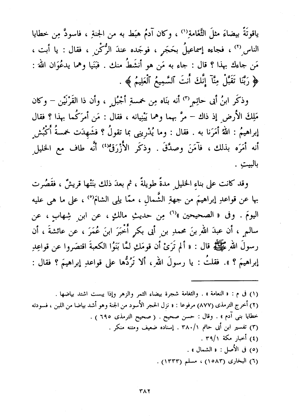 وَقَدْ كَانَتْ عَلَى بِنَاءِ الْخَلِيلِ مُدَّةً طَوِيلَةً، ثُمَّ بَعْدَ ذَلِكَ بَنَتْهَا قُرَيْشٌ فَقَصُرَتْ بِهَا عَنْ قَوَاعِدِ إِبْرَاهِيمَ مِنْ جِهَةِ الشَّمَالِ مِمَّا يَلِي الشَّامَ عَلَى مَا هِيَ عَلَيْهِ الْيَوْمَ، وَفِي الصَّحِيحَيْنِ مِنْ حَدِيثِ مَالِكٍ، عَنِ ابْنِ شِهَابٍ، عَنْ سَالِمٍ أَنَّ عَبْدَ اللَّهِ بْنَ مُحَمَّدِ بْنِ أَبِي بَكْرٍ أَخْبَرَ ابْنَ عُمَرَ، عَنْ عَائِشَةَ أَنَّ رَسُولَ اللَّهِ صَلَّى اللَّهُ عَلَيْهِ وَسَلَّمَ قَالَ: «أَلَمْ تَرَيْ أَنَّ قَوْمَكِ لَمَّا بَنَوُا الْكَعْبَةَ اقْتَصَرُوا عَنْ قَوَاعِدِ إِبْرَاهِيمَ. فَقُلْتُ: يَا رَسُولَ اللَّهِ أَلَا تَرُدُّهَا عَلَى قَوَاعِدِ إِبْرَاهِيمَ؟ فَقَالَ: