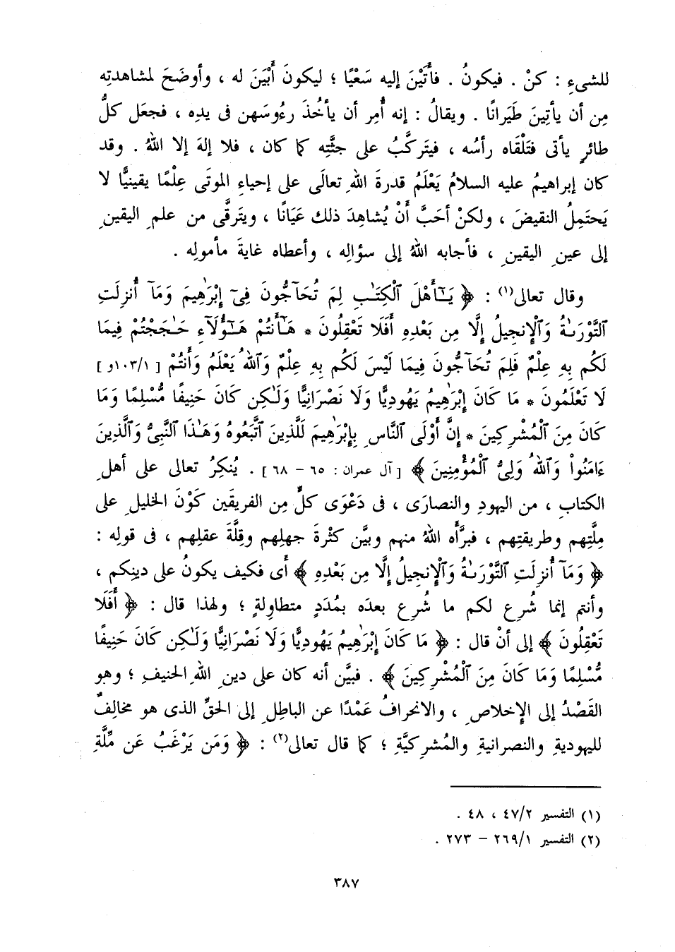 لِلشَّيْءِ: كُنْ فَيَكُونُ فَأَتَيْنَ إِلَيْهِ سَعْيًا لِيَكُونَ أَبْيَنَ لَهُ وَأَوْضَحَ لِمُشَاهَدَتِهِ مِنْ أَنْ يَأْتِينَ طَيَرَانًا. وَيُقَالُ: إِنَّهُ أُمِرَ أَنْ يَأْخُذَ رُءُوسَهُنَّ فِي يَدِهِ فَجَعَلَ كُلُّ طَائِرٍ يَأْتِي فَتَلْقَاهُ رَأْسُهُ فَيَتَرَكَّبُ عَلَى جُثَّتِهِ كَمَا كَانَ، فَلَا إِلَهَ إِلَّا اللَّهُ. وَقَدْ كَانَ إِبْرَاهِيمُ عَلَيْهِ السَّلَامُ يَعْلَمُ قُدْرَةَ اللَّهِ تَعَالَى عَلَى إِحْيَاءِ الْمَوْتَى عِلْمًا يَقِينًا لَا يَحْتَمِلُ النَّقِيضَ، وَلَكِنْ أَحَبَّ أَنْ يُشَاهِدَ ذَلِكَ عِيَانًا، وَيَتَرَقَّى مِنْ عِلْمِ الْيَقِينِ إِلَى عَيْنِ الْيَقِينِ فَأَجَابَهُ اللَّهُ إِلَى سُؤَالِهِ، وَأَعْطَاهُ غَايَةَ مَأْمُولِهِ. وَقَالَ تَعَالَى: {يَا أَهْلَ الْكِتَابِ لِمَ تُحَاجُّونَ فِي إِبْرَاهِيمَ وَمَا أُنْزِلَتِ التَّوْرَاةُ وَالْإِنْجِيلُ إِلَّا مِنْ بَعْدِهِ أَفَلَا تَعْقِلُونَ هَا أَنْتُمْ هَؤُلَاءِ حَاجَجْتُمْ فِيمَا لَكُمْ بِهِ عِلْمٌ فَلِمَ تُحَاجُّونَ فِيمَا لَيْسَ لَكُمْ بِهِ عِلْمٌ وَاللَّهُ يَعْلَمُ وَأَنْتُمْ لَا تَعْلَمُونَ مَا كَانَ إِبْرَاهِيمُ يَهُودِيًّا وَلَا نَصْرَانِيًّا وَلَكِنْ كَانَ حَنِيفًا مُسْلِمًا وَمَا كَانَ مِنَ الْمُشْرِكِينَ إِنَّ أَوْلَى النَّاسِ بِإِبْرَاهِيمَ لَلَّذِينَ اتَّبَعُوهُ وَهَذَا النَّبِيُّ وَالَّذِينَ آمَنُوا وَاللَّهُ وَلِيُّ الْمُؤْمِنِينَ} [آل عمران: 65] . أَيْ فَكَيْفَ يَكُونُ عَلَى دِينِكُمْ، وَأَنْتُمْ إِنَّمَا شُرِعَ لَكُمْ مَا شُرِعَ بَعْدَهُ بِمُدَدٍ مُتَطَاوِلَةٍ؟ وَلِهَذَا قَالَ: {أَفَلَا تَعْقِلُونَ} [آل عمران: 65] إِلَى أَنْ قَالَ: {مَا كَانَ إِبْرَاهِيمُ يَهُودِيًّا وَلَا نَصْرَانِيًّا وَلَكِنْ كَانَ حَنِيفًا مُسْلِمًا وَمَا كَانَ مِنَ الْمُشْرِكِينَ} [آل عمران: 67] . فَبَيَّنَ أَنَّهُ كَانَ عَلَى دِينِ اللَّهِ الْحَنِيفِ، وَهُوَ الْقَصْدُ إِلَى الْإِخْلَاصِ، وَالِانْحِرَافُ عَمْدًا عَنِ الْبَاطِلِ إِلَى الْحَقِّ الَّذِي هُوَ مُخَالِفٌ لِلْيَهُودِيَّةِ وَالنَّصْرَانِيَّةِ وَالْمُشْرِكِيَّةِ، كَمَا قَالَ تَعَالَى: {وَمَنْ يَرْغَبُ عَنْ مِلَّةِ إِبْرَاهِيمَ إِلَّا مَنْ سَفِهَ نَفْسَهُ وَلَقَدِ اصْطَفَيْنَاهُ فِي الدُّنْيَا وَإِنَّهُ فِي الْآخِرَةِ لَمِنَ الصَّالِحِينَ إِذْ قَالَ لَهُ رَبُّهُ أَسْلِمْ قَالَ أَسْلَمْتُ لِرَبِّ الْعَالَمِينَ وَوَصَّى بِهَا إِبْرَاهِيمُ بَنِيهِ وَيَعْقُوبُ يَابَنِيَّ إِنَّ اللَّهَ اصْطَفَى لَكُمُ الدِّينَ فَلَا تَمُوتُنَّ إِلَّا وَأَنْتُمْ مُسْلِمُونَ أَمْ كُنْتُمْ شُهَدَاءَ إِذْ حَضَرَ يَعْقُوبَ الْمَوْتُ إِذْ قَالَ لِبَنِيهِ مَا تَعْبُدُونَ مِنْ بَعْدِي قَالُوا نَعْبُدُ إِلَهَكَ وَإِلَهَ آبَائِكَ إِبْرَاهِيمَ وَإِسْمَاعِيلَ وَإِسْحَاقَ إِلَهًا وَاحِدًا وَنَحْنُ لَهُ مُسْلِمُونَ تِلْكَ أُمَّةٌ قَدْ خَلَتْ لَهَا مَا كَسَبَتْ وَلَكُمْ مَا كَسَبْتُمْ وَلَا تُسْأَلُونَ عَمَّا كَانُوا يَعْمَلُونَ وَقَالُوا كُونُوا هُودًا أَوْ نَصَارَى تَهْتَدُوا قُلْ بَلْ مِلَّةَ إِبْرَاهِيمَ حَنِيفًا وَمَا كَانَ مِنَ الْمُشْرِكِينَ قُولُوا آمَنَّا بِاللَّهِ وَمَا أُنْزِلَ إِلَيْنَا وَمَا أُنْزِلَ إِلَى إِبْرَاهِيمَ وَإِسْمَاعِيلَ وَإِسْحَاقَ وَيَعْقُوبَ وَالْأَسْبَاطِ وَمَا أُوتِيَ مُوسَى وَعِيسَى وَمَا أُوتِيَ النَّبِيُّونَ مِنْ رَبِّهِمْ لَا نُفَرِّقُ بَيْنَ أَحَدٍ مِنْهُمْ وَنَحْنُ لَهُ مُسْلِمُونَ فَإِنْ آمَنُوا بِمِثْلِ مَا آمَنْتُمْ بِهِ فَقَدِ اهْتَدَوْا وَإِنْ تَوَلَّوْا فَإِنَّمَا هُمْ فِي شِقَاقٍ فَسَيَكْفِيكَهُمُ اللَّهُ وَهُوَ السَّمِيعُ الْعَلِيمُ صِبْغَةَ اللَّهِ وَمَنْ أَحْسَنُ مِنَ اللَّهِ صِبْغَةً وَنَحْنُ لَهُ عَابِدُونَ قُلْ أَتُحَاجُّ