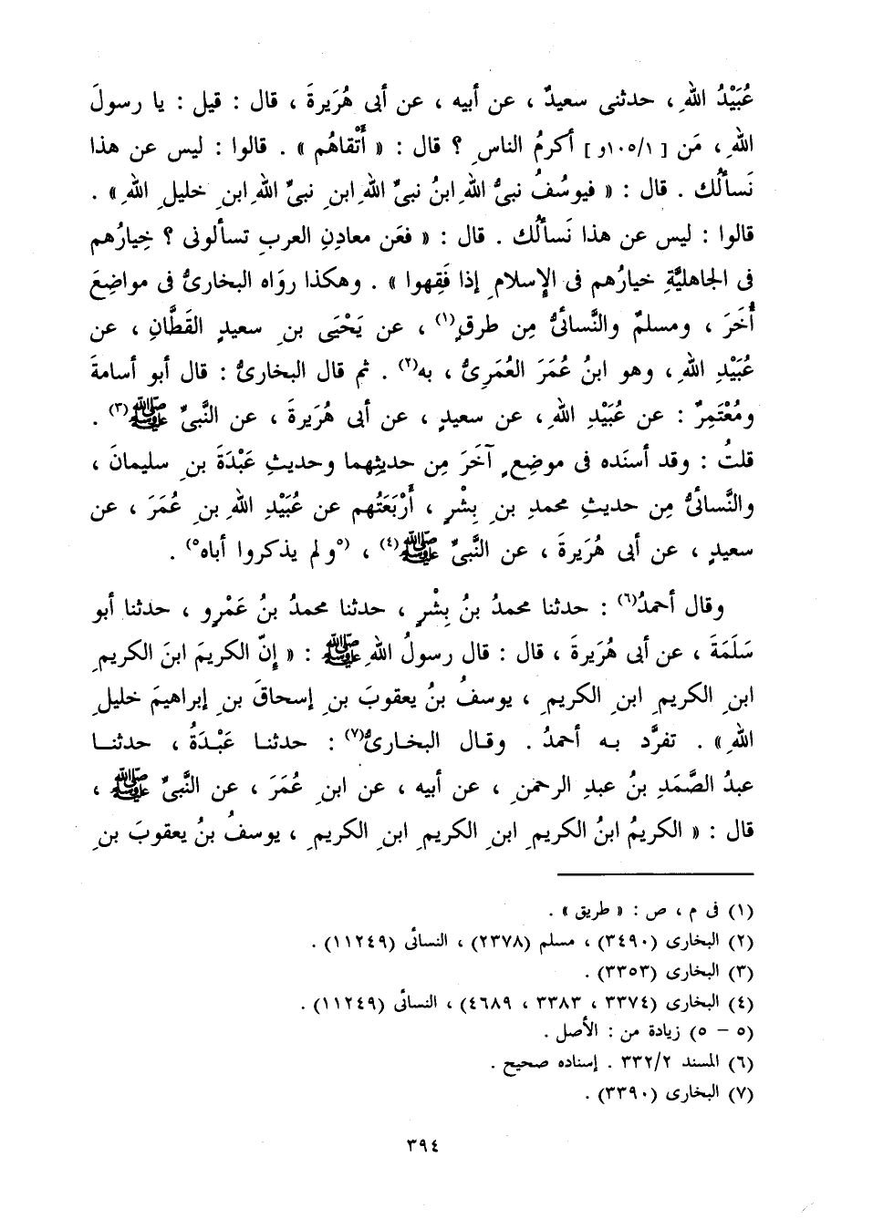 عَبْدُ اللَّهِ، حَدَّثَنِي سَعِيدٌ، عَنْ أَبِيهِ، عَنْ أَبِي هُرَيْرَةَ قَالَ: «قِيلَ: يَا رَسُولَ اللَّهِ مَنْ أَكْرَمُ النَّاسِ؟ قَالَ: أَتْقَاهُمْ. قَالُوا: لَيْسَ عَنْ هَذَا نَسْأَلُكَ. قَالَ: فَيُوسُفُ نَبِيُّ اللَّهِ ابْنُ نَبِيِّ اللَّهِ ابْنِ نَبِيِّ اللَّهِ ابْنِ خَلِيلِ اللَّهِ. قَالُوا: لَيْسَ عَنْ هَذَا نَسْأَلُكَ. قَالَ: فَعَنْ مَعَادِنِ الْعَرَبِ تَسْأَلُونِي؟ خِيَارُهُمْ فِي الْجَاهِلِيَّةِ خِيَارُهُمْ فِي الْإِسْلَامِ إِذَا فَقِهُوا» .