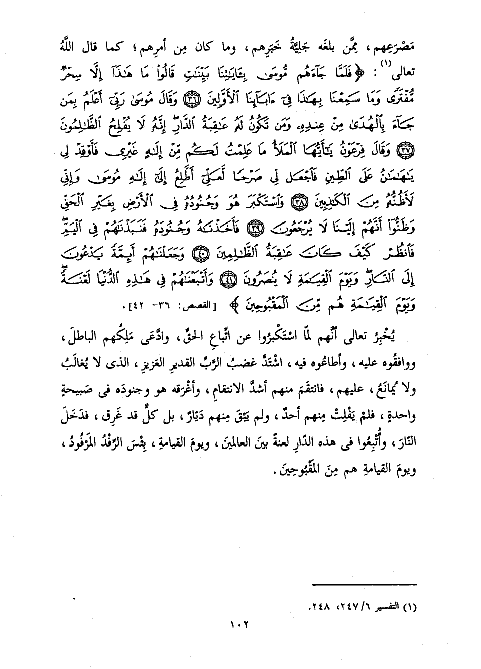 [الْقَصَصِ: 36 - 42] . يُخْبِرُ تَعَالَى أَنَّهُمْ لَمَّا اسْتَكْبَرُوا عَنِ اتِّبَاعِ الْحَقِّ، وَادَّعَى مِلْكُهُمُ الْبَاطِلَ، وَوَافَقُوهُ عَلَيْهِ، وَأَطَاعُوهُ فِيهِ، اشْتَدَّ غَضَبُ الرَّبِّ الْقَدِيرِ الْعَزِيزِ، الَّذِي لَا يُغَالَبُ وَلَا يُمَانَعُ، عَلَيْهِمْ، فَانْتَقَمَ مِنْهُمْ أَشَدَّ الِانْتِقَامِ، وَأَغْرَقَهُ هُوَ وَجُنُودَهُ فِي صَبِيحَةٍ وَاحِدَةٍ، فَلَمْ يُفْلِتْ مِنْهُمْ أَحَدٌ، وَلَمْ يَبْقَ مِنْهُمْ دَيَّارٌ، بَلْ كَانَ قَدْ غَرِقَ، فَدَخَلَ النَّارَ، وَأُتْبِعُوا فِي هَذِهِ الدَّارِ لَعْنَةً بَيْنَ الْعَالَمِينَ، وَيَوْمَ الْقِيَامَةِ، بِئْسَ الرِّفْدُ الْمَرْفُودُ، وَيَوْمَ الْقِيَامَةِ هُمْ مِنَ الْمَقْبُوحِينَ.