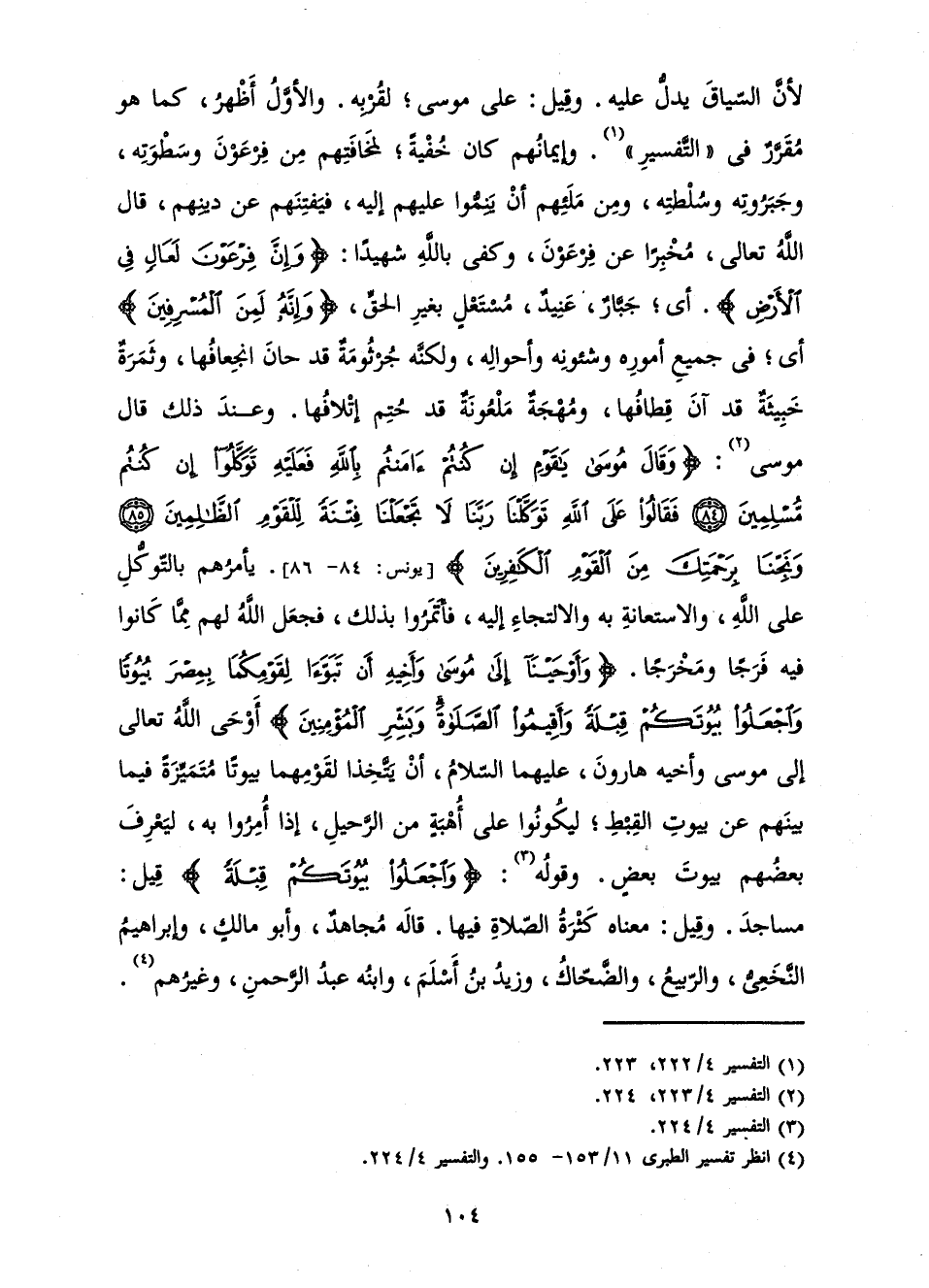 [يُونُسَ 84 - 86] . يَأْمُرُهُمْ بِالتَّوَكُّلِ عَلَى اللَّهِ، وَالِاسْتِعَانَةِ بِهِ وَالِالْتِجَاءِ إِلَيْهِ، فَأْتَمَرُوا بِذَلِكَ، فَجَعَلَ اللَّهُ لَهُمْ مِمَّا كَانُوا فِيهِ فَرَجًا وَمَخْرَجًا. {وَأَوْحَيْنَا إِلَى مُوسَى وَأَخِيهِ أَنْ تَبَوَّءا لِقَوْمِكُمَا بِمِصْرَ بُيُوتًا وَاجْعَلُوا بُيُوتَكُمْ قِبْلَةً وَأَقِيمُوا الصَّلَاةَ وَبَشِّرِ الْمُؤْمِنِينَ} [يونس: 87] أَوْحَى اللَّهُ تَعَالَى إِلَى مُوسَى وَأَخِيهِ هَارُونَ، عَلَيْهِمَا السَّلَامُ، أَنْ يَتَّخِذُوا لِقَوْمِهِمَا بُيُوتًا مُتَمَيِّزَةً فِيمَا بَيْنَهُمْ عَنْ بُيُوتِ الْقِبْطِ; لِيَكُونُوا عَلَى أُهْبَةٍ مِنَ الرَّحِيلِ، إِذَا أَمَرُوا بِهِ، لِيَعْرِفَ بَعْضُهُمْ بُيُوتَ بَعْضٍ. وَقَوْلُهُ: {وَاجْعَلُوا بُيُوتَكُمْ قِبْلَةً} [يونس: 87] قِيلَ: مَسَاجِدَ. وَقِيلَ: مَعْنَاهُ كَثْرَةُ الصَّلَاةِ فِيهَا. قَالَهُ مُجَاهِدٌ، وَأَبُو مَالِكٍ، وَإِبْرَاهِيمُ النَّخَعِيُّ، وَالرَّبِيعُ، وَالضَّحَّاكُ، وَزَيْدُ بْنُ أَسْلَمَ، وَابْنُهُ عَبْدُ الرَّحْمَنِ، وَغَيْرُهُمْ.