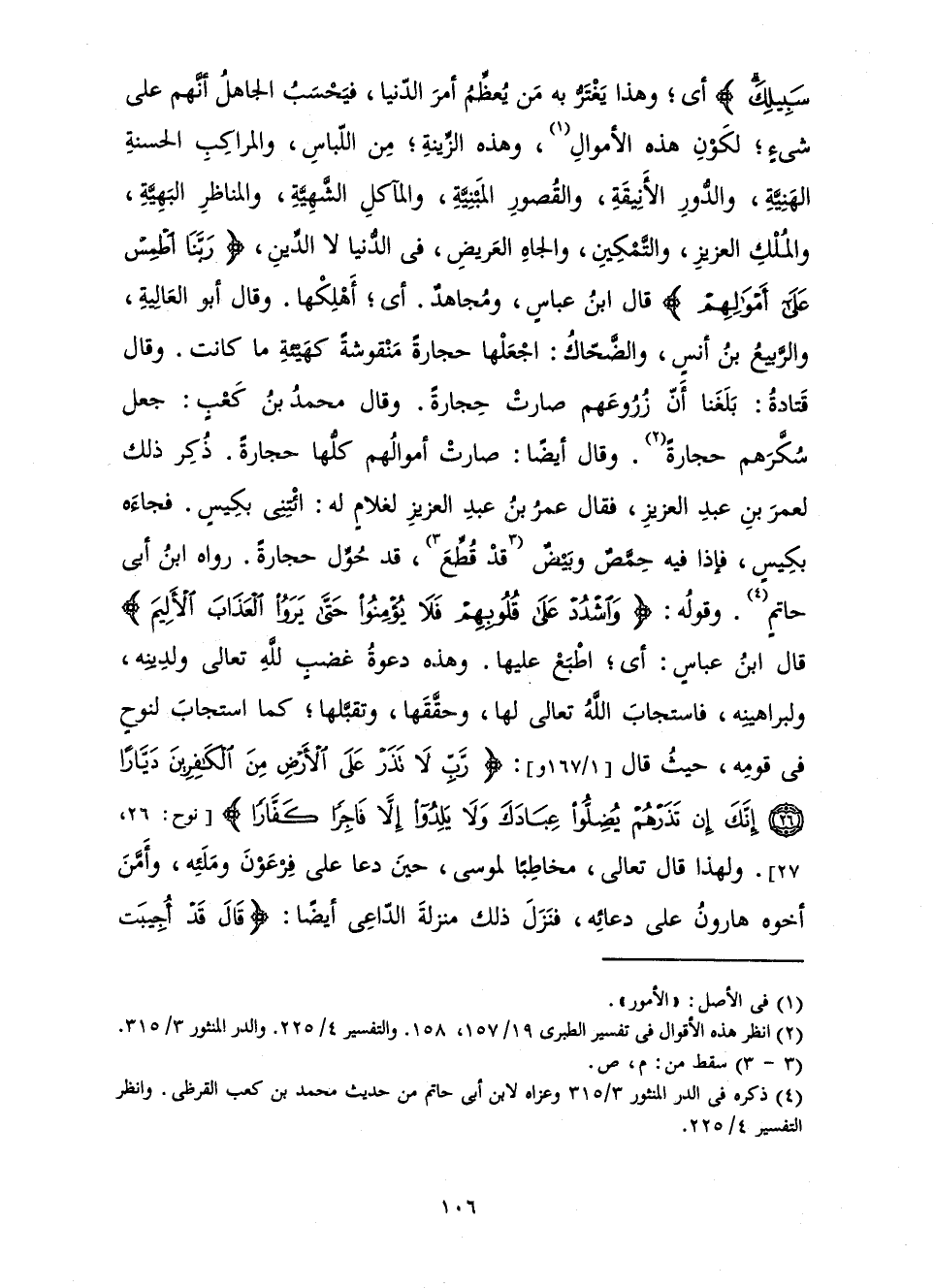 أَيْ; وَهَذَا يَغْتَرُّ بِهِ مَنْ يُعَظِّمُ أَمْرَ الدُّنْيَا، فَيَحْسَبُ الْجَاهِلُ أَنَّهُمْ عَلَى شَيْءٍ; لِكَوْنِ هَذِهِ الْأَمْوَالِ، وَهَذِهِ الزِّينَةِ; مِنَ اللِّبَاسِ، وَالْمَرَاكِبِ الْحَسَنَةِ الْهَنِيَّةِ، وَالدُّورِ الْأَنِيقَةِ، وَالْقُصُورِ الْمَبْنِيَّةِ، وَالْمَآكِلِ الشَّهِيَّةِ، وَالْمَنَاظِرِ الْبَهِيَّةِ، وَالْمُلْكِ الْعَزِيزِ، وَالتَّمْكِينِ، وَالْجَاهِ الْعَرِيضِ، فِي الدُّنْيَا لَا الدِّينِ، {رَبَّنَا اطْمِسْ عَلَى أَمْوَالِهِمْ} [يونس: 88] قَالَ ابْنُ عَبَّاسٍ وَمُجَاهِدٌ. أَيْ; أَهْلِكْهَا. وَقَالَ أَبُو الْعَالِيَةِ، وَالرَّبِيعُ بْنُ أَنَسٍ، وَالضَّحَّاكُ: اجْعَلْهَا حِجَارَةً مَنْقُوشَةً كَهَيْئَةِ مَا كَانَتْ. وَقَالَ قَتَادَةُ: بَلَغَنَا أَنَّ زُرُوعَهُمْ صَارَتْ حِجَارَةً. وَقَالَ مُحَمَّدُ بْنُ كَعْبٍ: جَعَلَ سُكَّرَهُمْ حِجَارَةً. وَقَالَ أَيْضًا: صَارَتْ أَمْوَالُهُمْ كُلُّهَا حِجَارَةً. ذُكِرَ ذَلِكَ لِعُمَرَ بْنِ عَبْدِ الْعَزِيزِ، فَقَالَ عُمَرُ بْنُ عَبْدِ الْعَزِيزِ لِغُلَامٍ لَهُ: ائْتِنِي بِكِيسٍ. فَجَاءَهُ بِكِيسٍ، فَإِذَا فِيهِ. . . . وَبَيْضٌ قَدْ قُطِّعَ، قَدْ حُوِّلَ حِجَارَةً. رَوَاهُ ابْنُ أَبِي حَاتِمٍ. وَقَوْلُهُ: {وَاشْدُدْ عَلَى قُلُوبِهِمْ فَلَا يُؤْمِنُوا حَتَّى يَرَوُا الْعَذَابَ الْأَلِيمَ} [يونس: 88] قَالَ ابْنُ عَبَّاسٍ: أَيِ; اطْبَعْ عَلَيْهَا. وَهَذِهِ دَعْوَةُ غَضَبٍ لِلَّهِ تَعَالَى وَلِدِينِهِ، وَلِبَرَاهِينِهِ، فَاسْتَجَابَ اللَّهُ تَعَالَى لَهَا، وَحَقَّقَهَا وَتَقَبَّلَهَا; كَمَا اسْتَجَابَ لِنُوحٍ فِي قَوْمِهِ، حَيْثُ قَالَ: {رَبِّ لَا تَذَرْ عَلَى الْأَرْضِ مِنَ الْكَافِرِينَ دَيَّارًا - إِنَّكَ إِنْ تَذَرْهُمْ يُضِلُّوا عِبَادَكَ وَلَا يَلِدُوا إِلَّا فَاجِرًا كَفَّارًا} [نوح: 26 - 27] وَلِهَذَا قَالَ تَعَالَى، مُخَاطِبًا لِمُوسَى حِينَ دَعَا عَلَى فِرْعَوْنَ وَمَلَئِهِ، وَأَمَّنَ أَخُوهُ هَارُونُ عَلَى دُعَائِهِ، فَنَزَلَ ذَلِكَ مَنْزِلَةَ الدَّاعِي أَيْضًا: