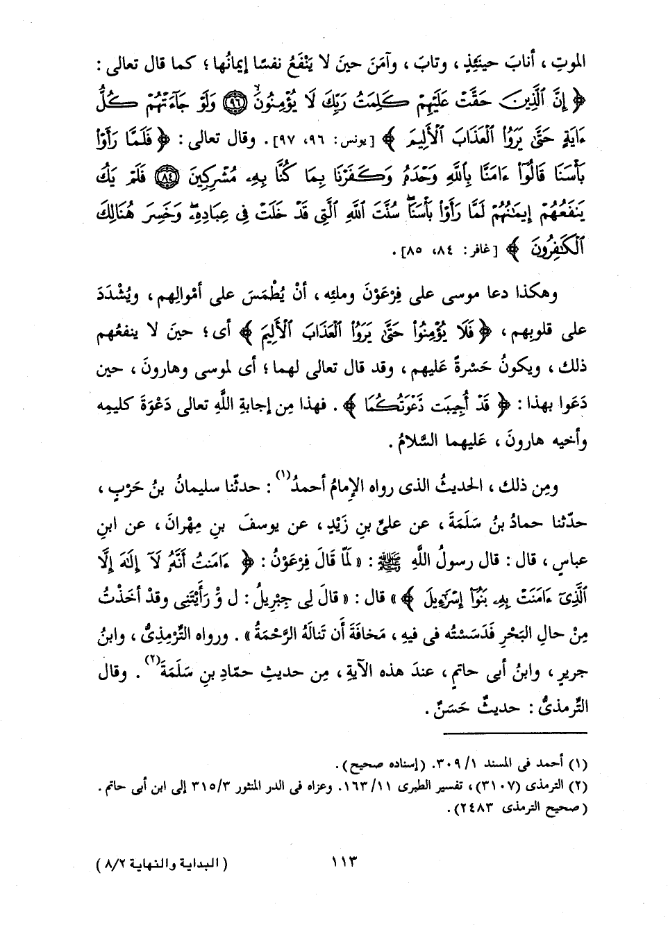 وَمِنْ ذَلِكَ، الْحَدِيثُ الَّذِي رَوَاهُ الْإِمَامُ أَحْمَدُ: حَدَّثَنَا سُلَيْمَانُ بْنُ حَرْبٍ، حَدَّثَنَا حَمَّادُ بْنُ سَلَمَةَ، عَنْ عَلِيِّ بْنِ زَيْدٍ، عَنْ يُوسُفَ بْنِ مِهْرَانَ، عَنِ ابْنِ عَبَّاسٍ، قَالَ: قَالَ رَسُولُ اللَّهِ صَلَّى اللَّهُ عَلَيْهِ وَسَلَّمَ: «لَمَّا قَالَ فِرْعَوْنُ: آمَنْتُ أَنَّهُ لَا إِلَهَ إِلَّا الَّذِي آمَنَتْ بِهِ بَنُو إِسْرَائِيلَ قَالَ: قَالَ لِي جِبْرِيلُ: لَوْ رَأَيْتَنِي وَقَدْ أَخَذْتُ مِنْ حَالِ الْبَحْرِ فَدَسَسْتُهُ فِي فِيهِ مَخَافَةَ أَنْ تَنَالَهُ الرَّحْمَةُ» وَرَوَاهُ التِّرْمِذِيُّ، وَابْنُ جَرِيرٍ، وَابْنُ أَبِي حَاتِمٍ، عِنْدَ هَذِهِ الْآيَةِ، مِنْ حَدِيثِ حَمَّادِ بْنِ سَلَمَةَ. وَقَالَ التِّرْمِذِيُّ: حَدِيثٌ حَسَنٌ.