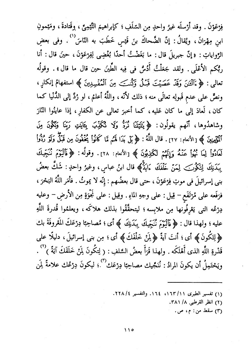 فِرْعَوْنَ. وَقَدْ أَرْسَلَهُ غَيْرُ وَاحِدٍ مِنَ السَّلَفِ; كَإِبْرَاهِيمَ التَّيْمِيِّ، وَقَتَادَةَ، وَمَيْمُونِ بْنِ مِهْرَانَ، وَيُقَالُ إِنَّ الضَّحَّاكَ بْنَ قَيْسٍ خَطَبَ بِهِ النَّاسَ. وَفِي بَعْضِ الرِّوَايَاتِ: «إِنَّ جِبْرِيلَ قَالَ: مَا بَغَضْتُ أَحَدًا بُغْضِي لِفِرْعَوْنَ، حِينَ قَالَ: أَنَا رَبُّكُمُ الْأَعْلَى. وَلَقَدْ جَعَلْتُ أَدُسُّ فِي فِيهِ الطِّينَ حِينَ قَالَ مَا قَالَ» وَقَوْلُهُ تَعَالَى: {آلْآنَ وَقَدْ عَصَيْتَ قَبْلُ وَكُنْتَ مِنَ الْمُفْسِدِينَ} [يونس: 91] اسْتِفْهَامُ إِنْكَارٍ، وَنَصٌّ عَلَى عَدَمِ قَبُولِهِ تَعَالَى مِنْهُ; ذَلِكَ لِأَنَّهُ، وَاللَّهُ أَعْلَمُ، لَوْ رُدَّ إِلَى الدُّنْيَا كَمَا كَانَ، لَعَادَ إِلَى مَا كَانَ عَلَيْهِ، كَمَا أَخْبَرَ تَعَالَى عَنِ الْكُفَّارِ، إِذَا عَايَنُوا النَّارَ وَشَاهَدُوهَا، أَنَّهُمْ يَقُولُونَ: {يَا لَيْتَنَا نُرَدُّ وَلَا نُكَذِّبَ بِآيَاتِ رَبِّنَا وَنَكُونَ مِنَ الْمُؤْمِنِينَ} [الأنعام: 27] . قَالَ اللَّهُ: {بَلْ بَدَا لَهُمْ مَا كَانُوا يُخْفُونَ مِنْ قَبْلُ وَلَوْ رُدُّوا لَعَادُوا لِمَا نُهُوا عَنْهُ وَإِنَّهُمْ لَكَاذِبُونَ} [الأنعام: 28] . وَقَوْلُهُ: {فَالْيَوْمَ نُنَجِّيكَ بِبَدَنِكَ لِتَكُونَ لِمَنْ خَلْفَكَ آيَةً} [يونس: 92] قَالَ ابْنُ عَبَّاسٍ وَغَيْرُ وَاحِدٍ: شَكَّ بَعْضُ بَنِي إِسْرَائِيلَ فِي مَوْتِ فِرْعَوْنَ، حَتَّى قَالَ بَعْضُهُمْ: إِنَّهُ لَا يَمُوتُ. فَأَمَرَ اللَّهُ الْبَحْرَ، فَرَفَعَهُ عَلَى مُرْتَفَعٍ - قِيلَ: عَلَى وَجْهِ الْمَاءِ. وَقِيلَ: عَلَى نَجْوَةٍ مِنَ الْأَرْضِ - وَعَلَيْهِ دِرْعُهُ الَّتِي يَعْرِفُونَهَا مِنْ مَلَابِسِهِ; لِيَتَحَقَّقُوا بِذَلِكَ هَلَاكَهُ، وَيَعْلَمُوا قُدْرَةَ اللَّهِ عَلَيْهِ; وَلِهَذَا قَالَ: {فَالْيَوْمَ نُنَجِّيكَ بِبَدَنِكَ} [يونس: 92] أَيْ; مُصَاحِبًا دِرْعَكَ الْمَعْرُوفَةَ بِكَ لِتَكُونَ أَيْ; أَنْتَ آيَةً {لِمَنْ خَلْفَكَ} [يونس: 92] أَيْ; مِنْ بَنِي إِسْرَائِيلَ، دَلِيلًا عَلَى قُدْرَةِ اللَّهِ الَّذِي أَهْلَكَهُ. وَلِهَذَا قَرَأَ بَعْضُ السَّلَفِ: (لِتَكُونَ لِمَنْ خَلَقَكَ آيَةً) . وَيُحْتَمَلُ أَنْ يَكُونَ الْمُرَادُ: نُنَجِّيكَ مُصَاحِبًا دِرْعَكَ; لِيَكُونَ دِرْعُكَ عَلَامَةً لِمَنْ